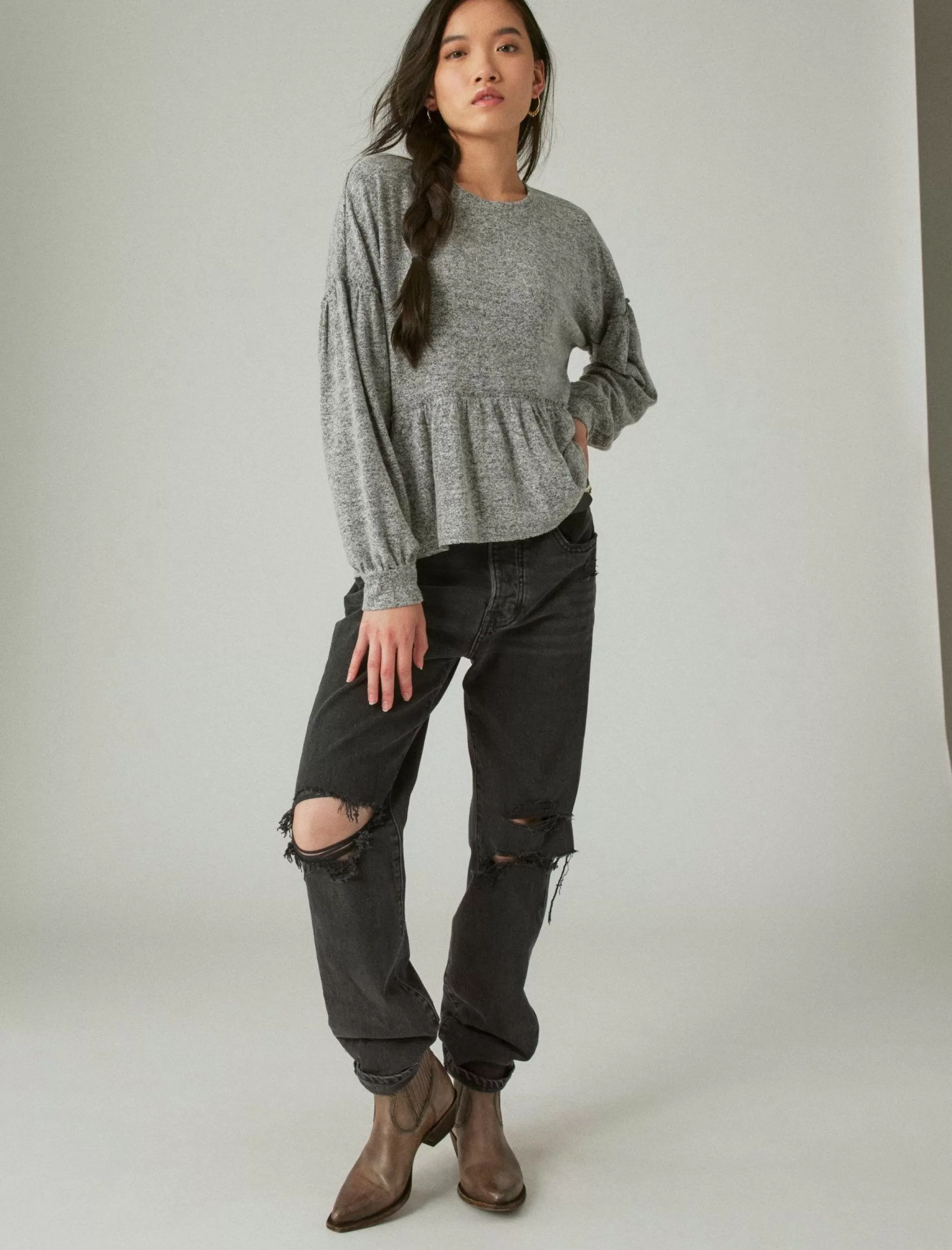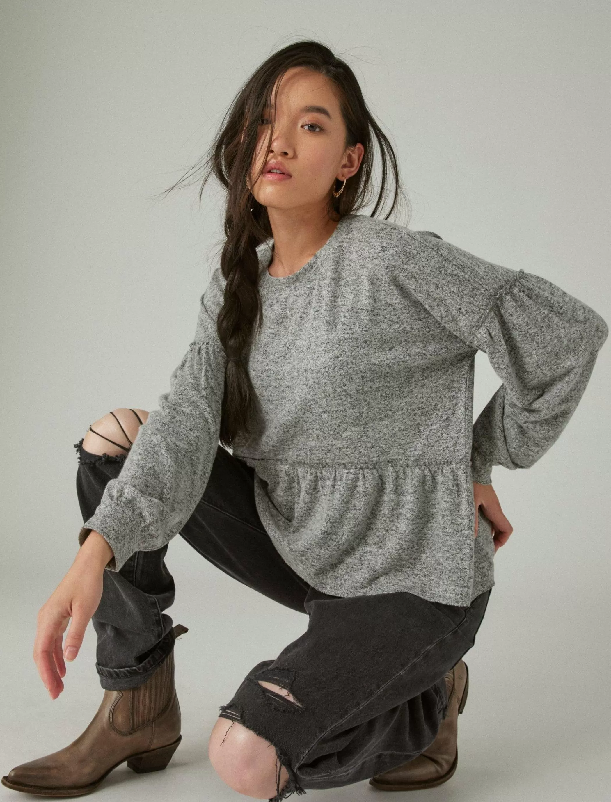 Crafted of our super-soft cloud jersey material, this babydoll top features long blouson sleeves and ruffle trim details. Wear yours with jeans or leggings to complete the look.
