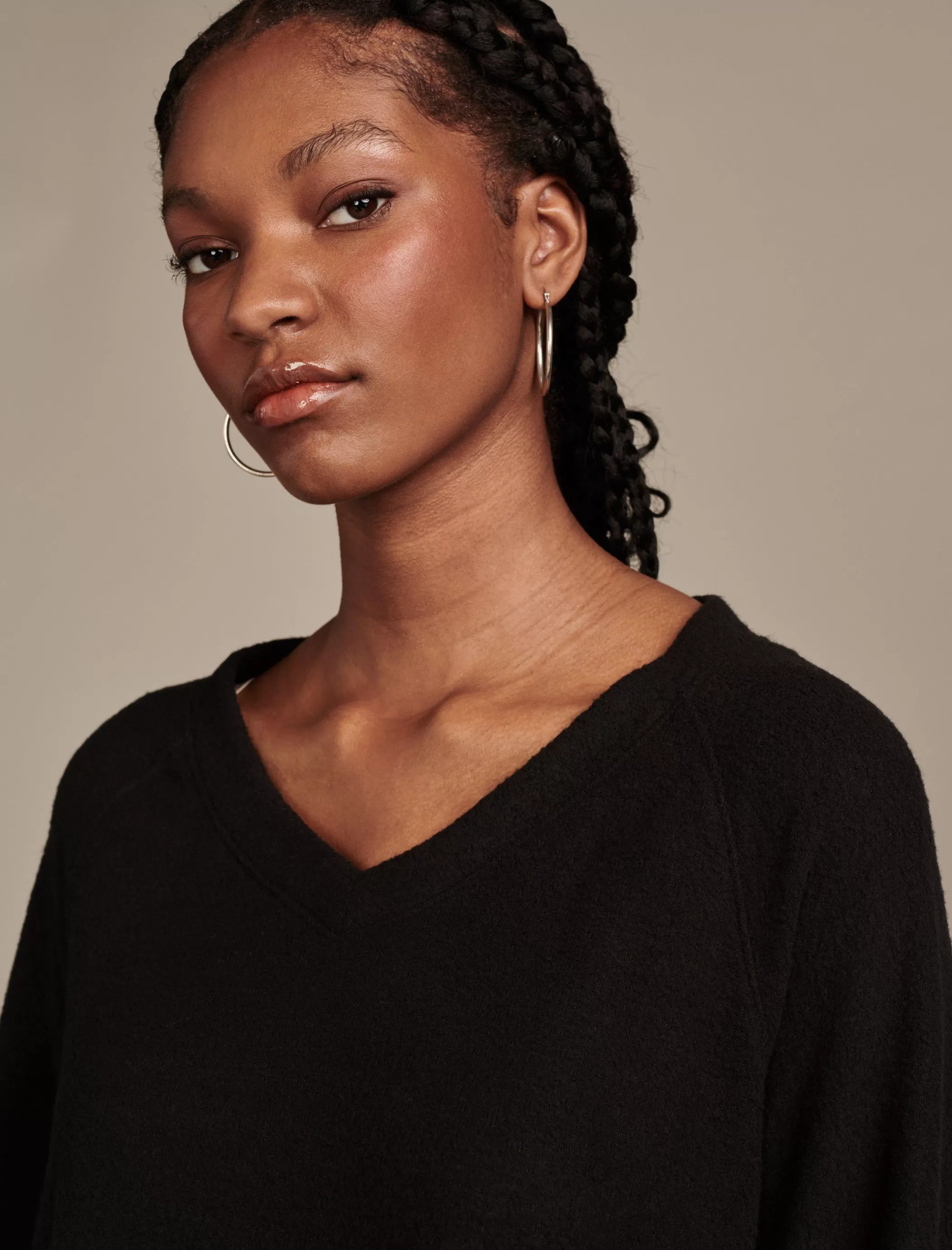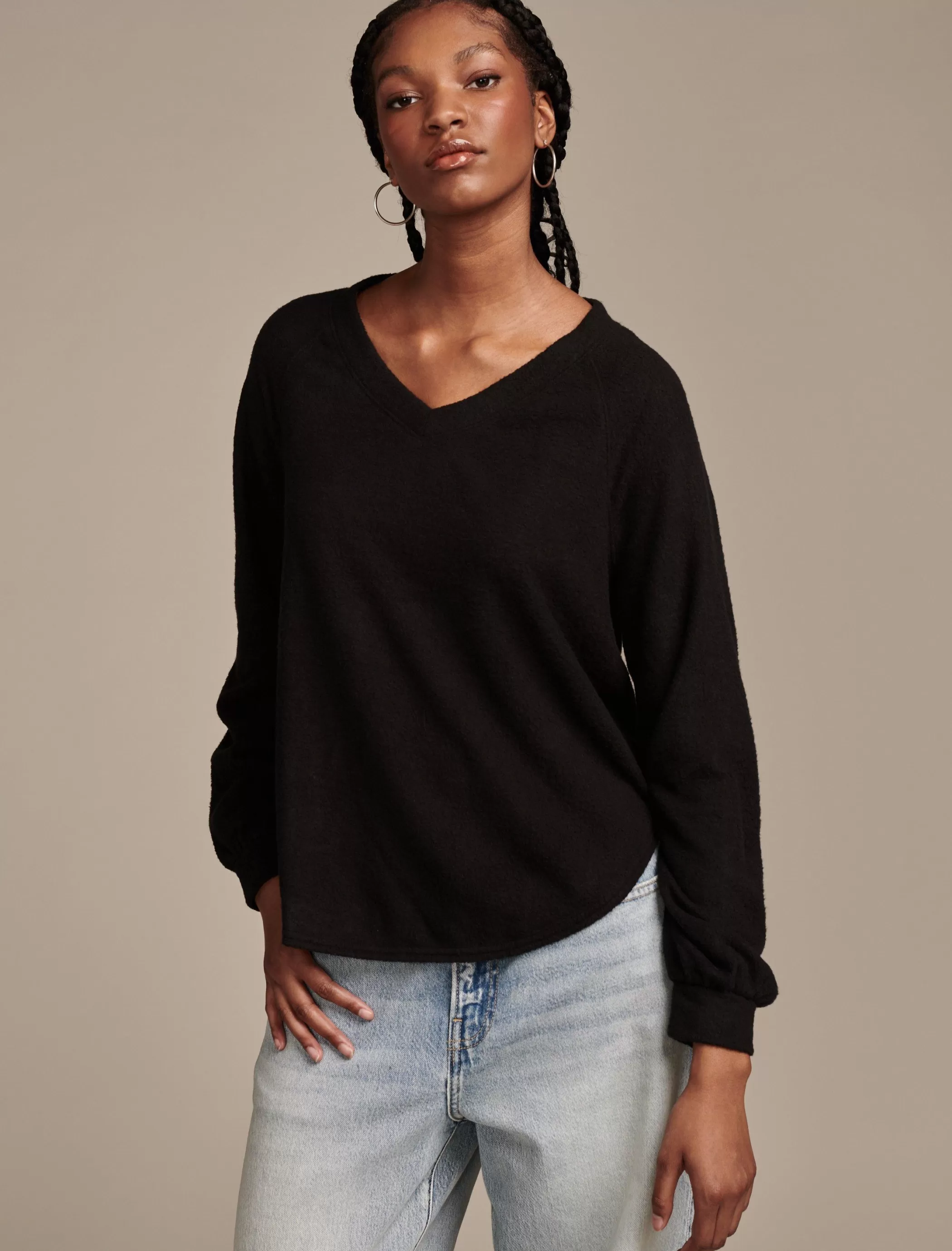 Cozy, but make it cute. Spun from our ultra soft cloud jersey material, this long sleeve pullover features a flattering V-neckline and curved hem.