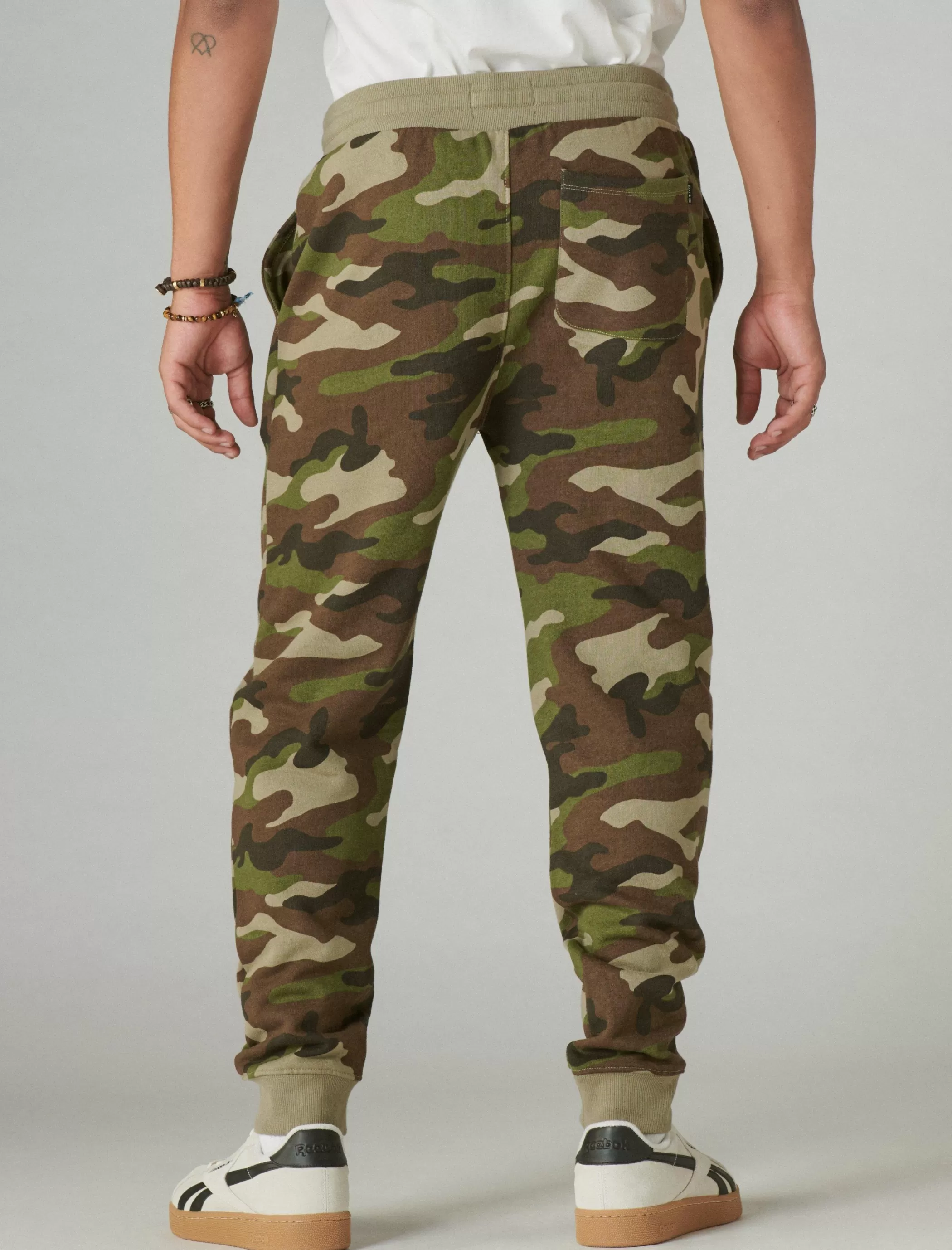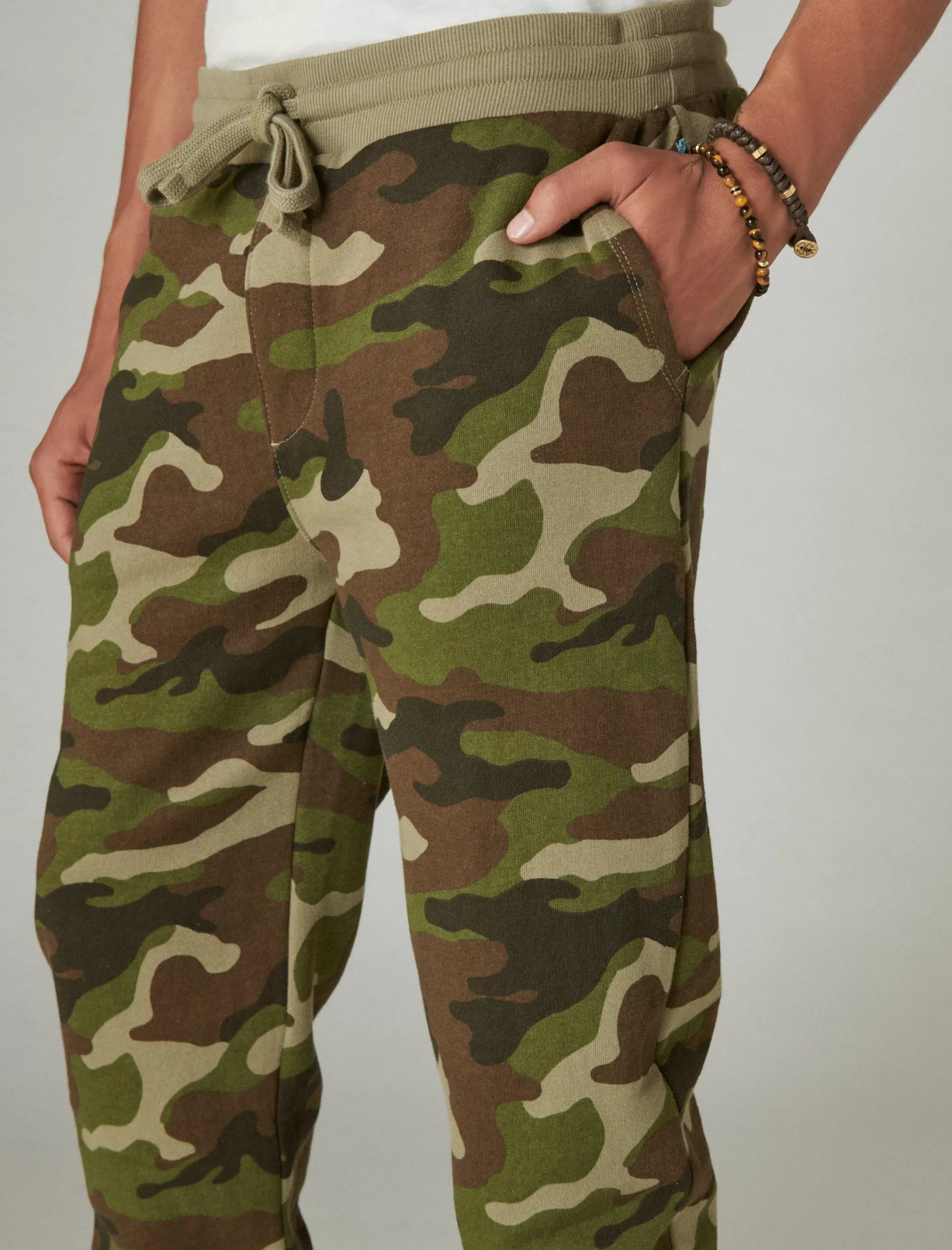 Crafted from soft sueded terry, this cozy camouflage jogger features an elastic-drawstring waist, multiple pockets and ribbed cuffs for easy, laid-back style.
