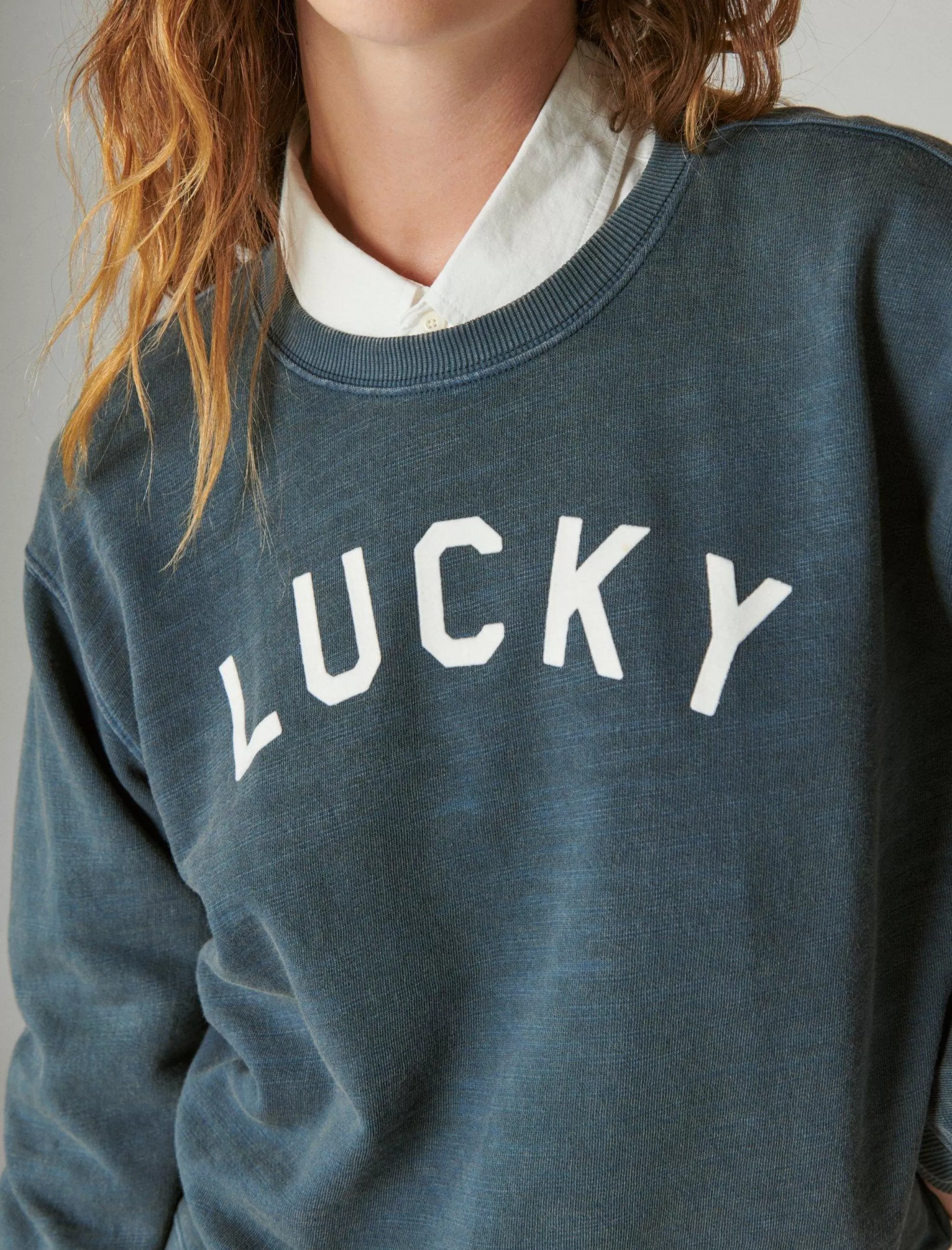Make good fortune—and look good doing it—wearing this long sleeve pullover stamped with our arch-style logo at the f…