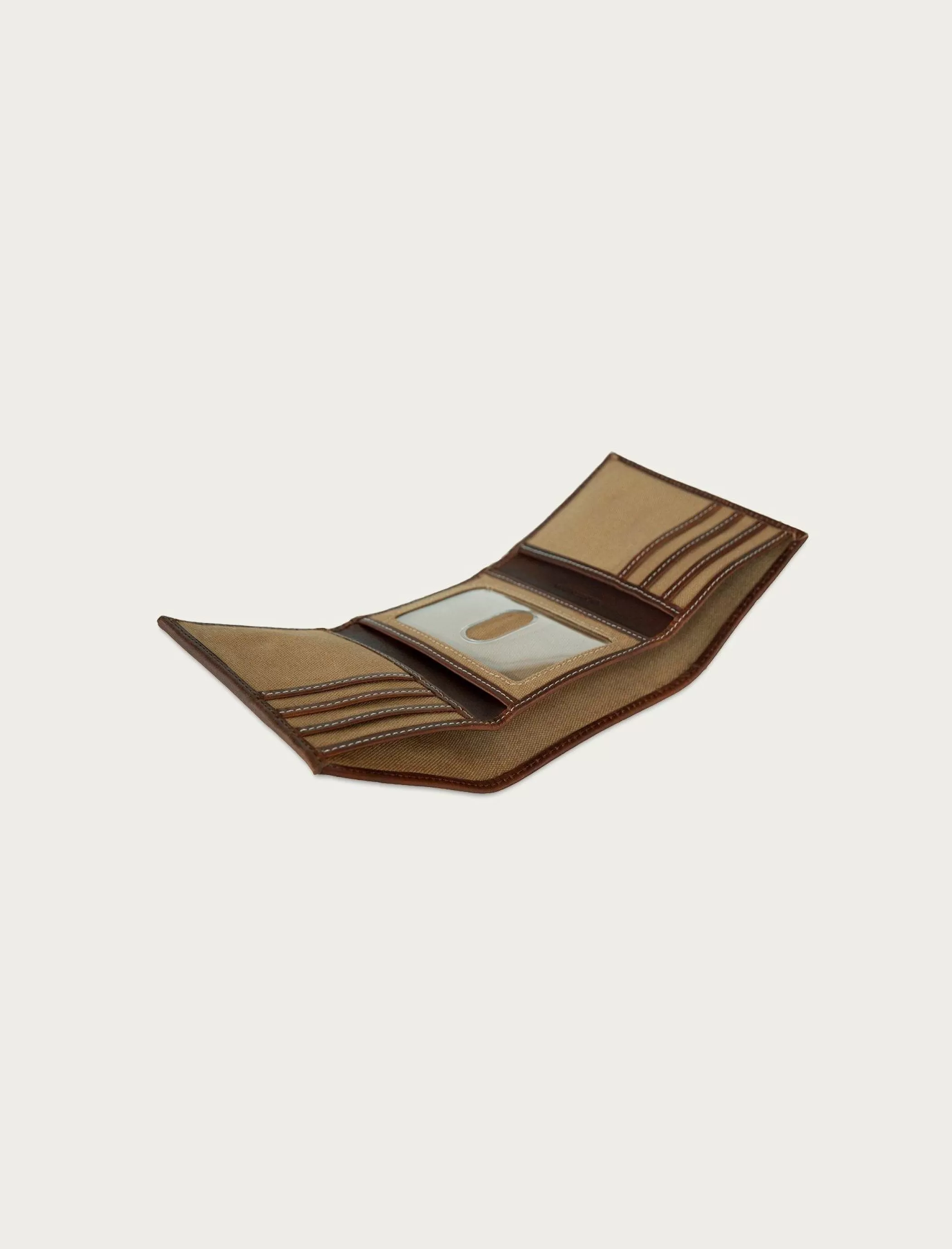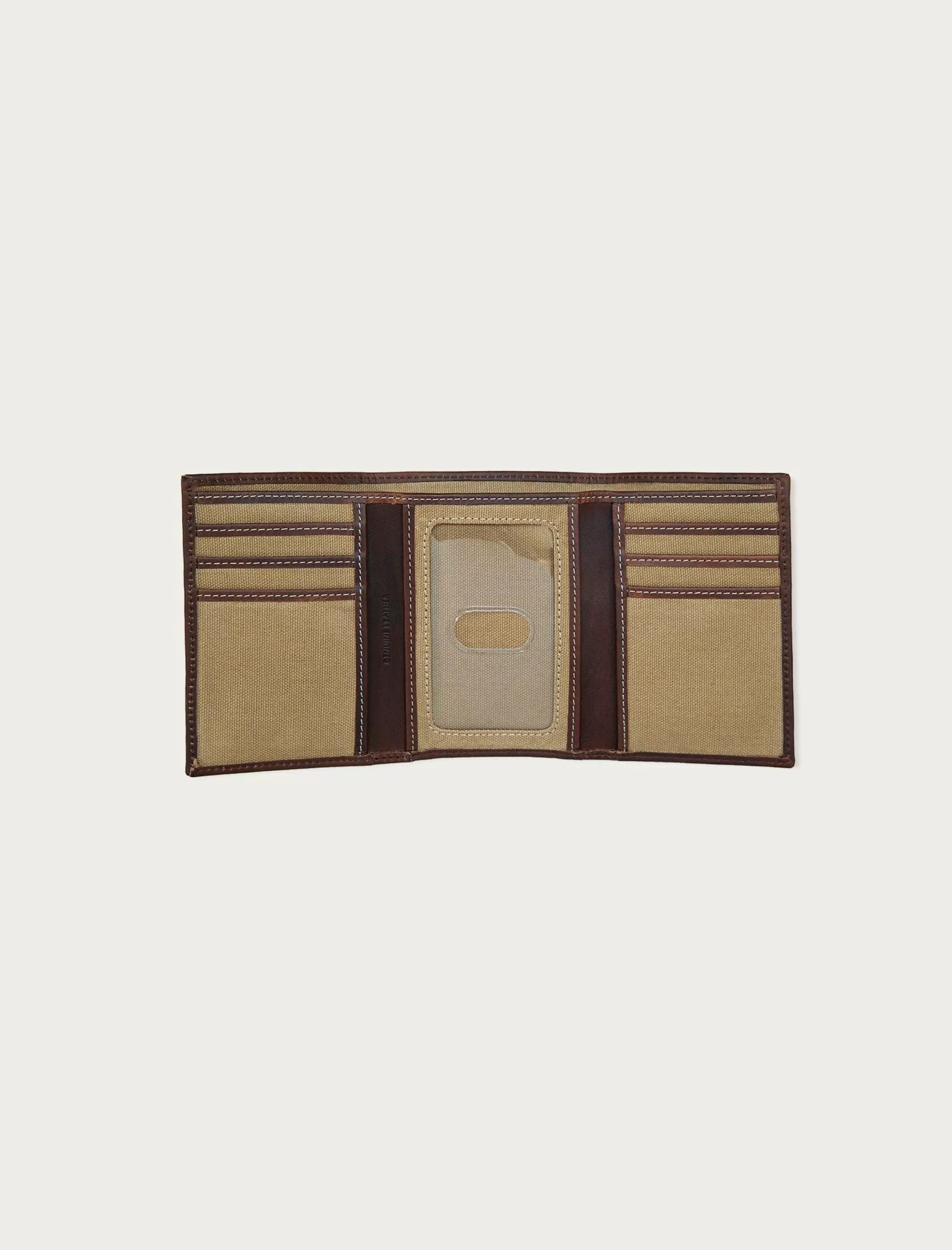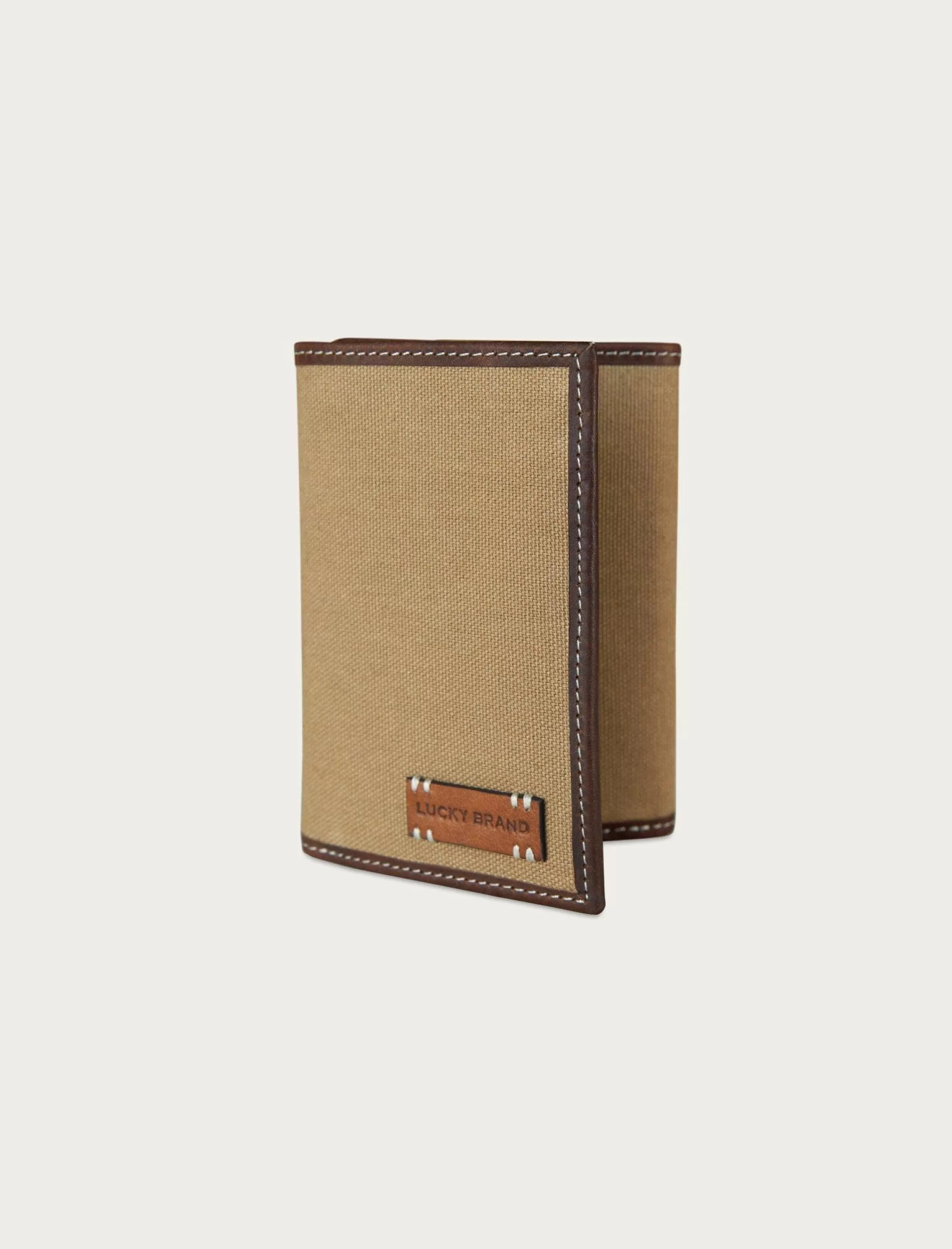 Made with multiple compartments and showcasing a leather trim design, this canvas trifold wallet features several card slots to keep ID, cash and credit cards safe.