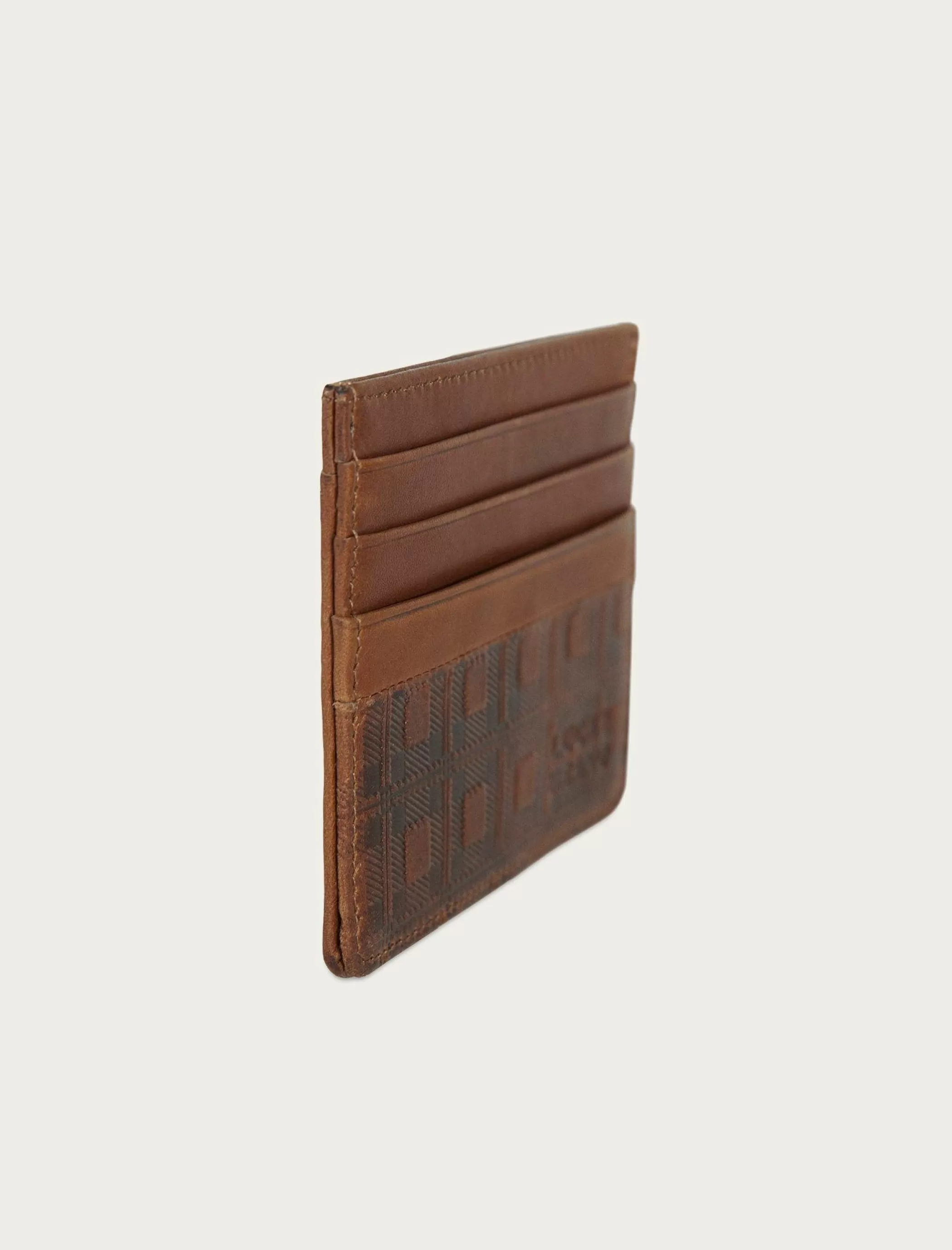 Made with multiple compartments and showcasing a plaid embossed design, this leather trifold wallet features several card slots to keep ID, cash and credit cards safe.