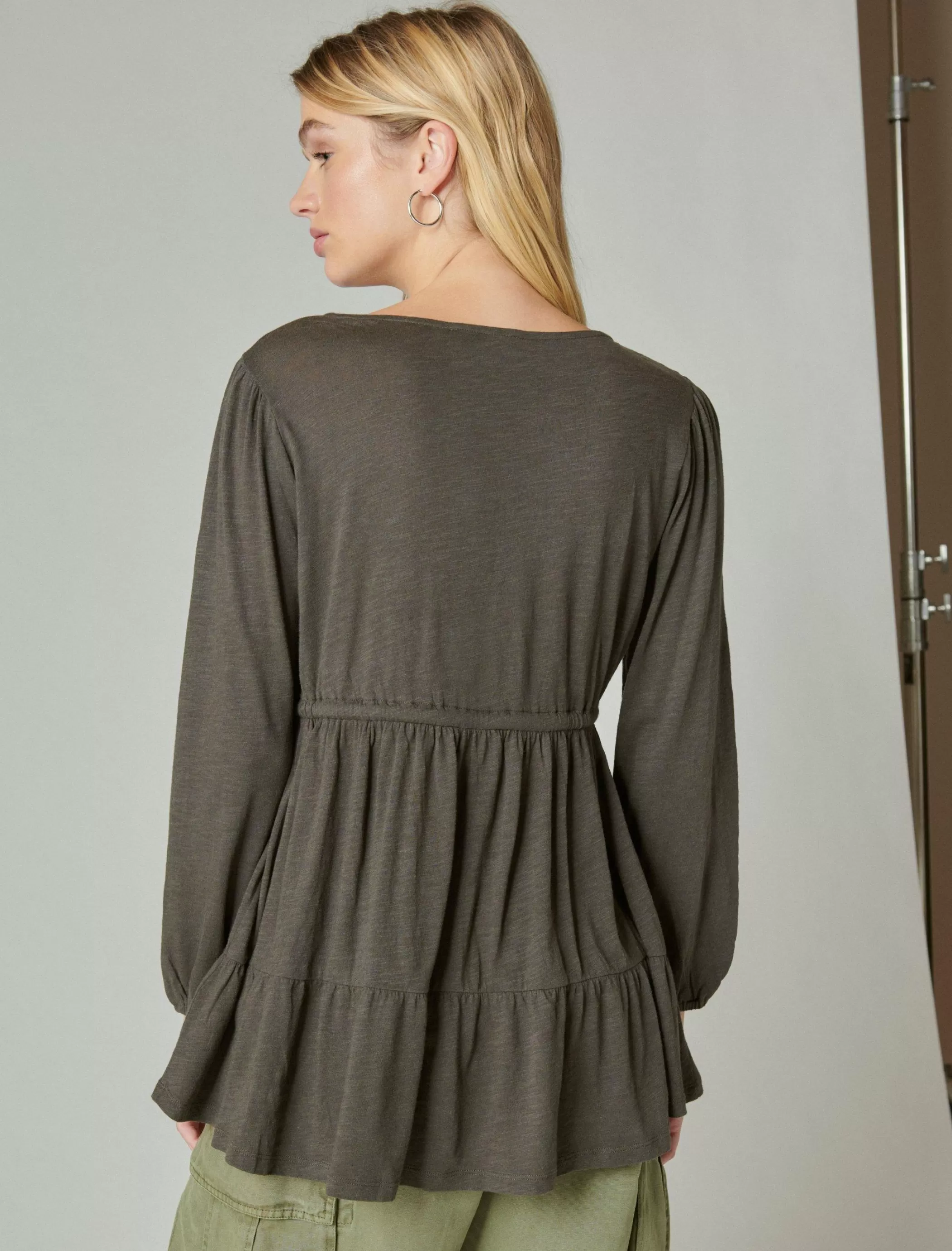 Forever timeless in a tiered silhouette, this tunic-length top features an intricate embroidered design and drawstring tie right below the chest for a perfectly-cinched ‘fit.