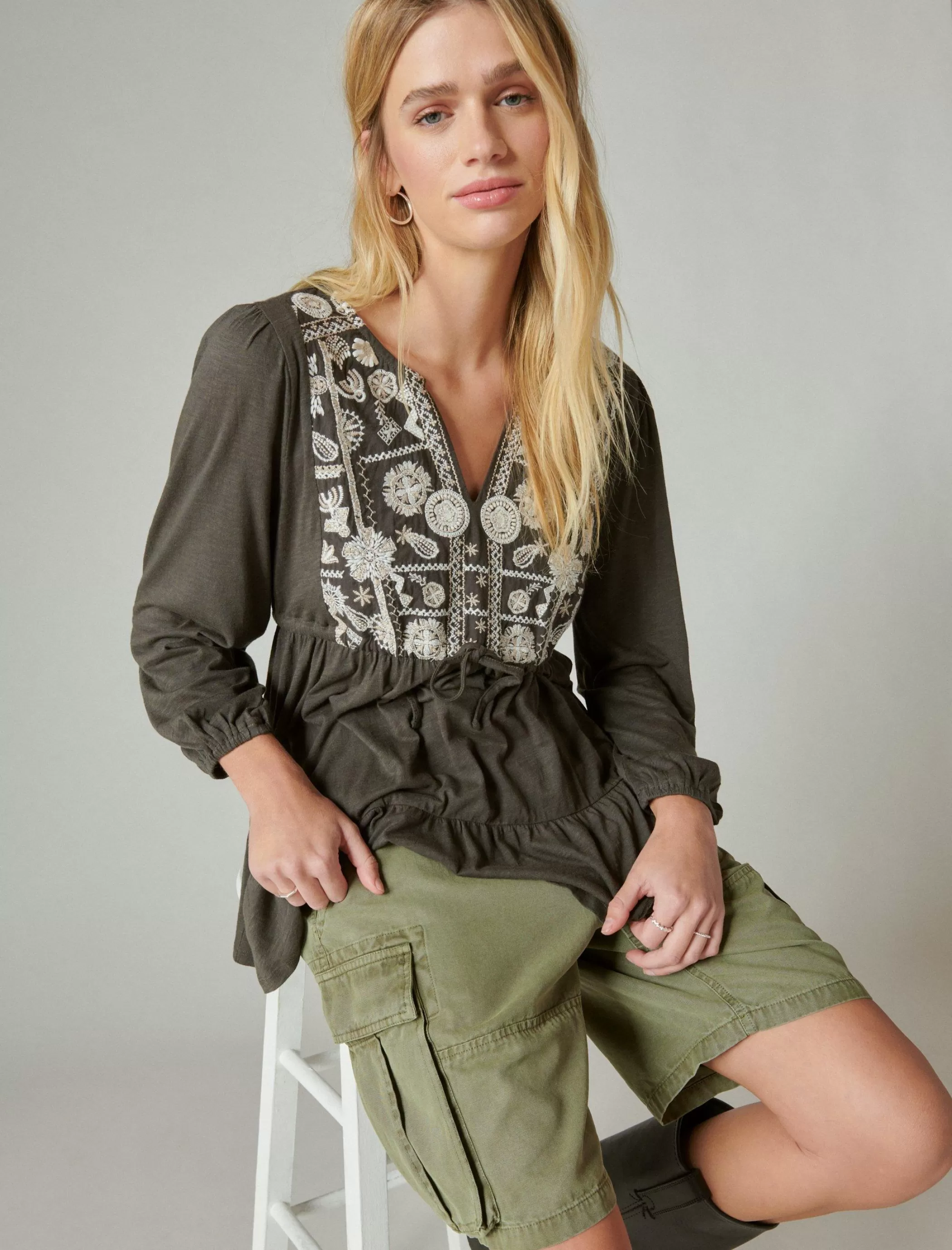 Forever timeless in a tiered silhouette, this tunic-length top features an intricate embroidered design and drawstring t…