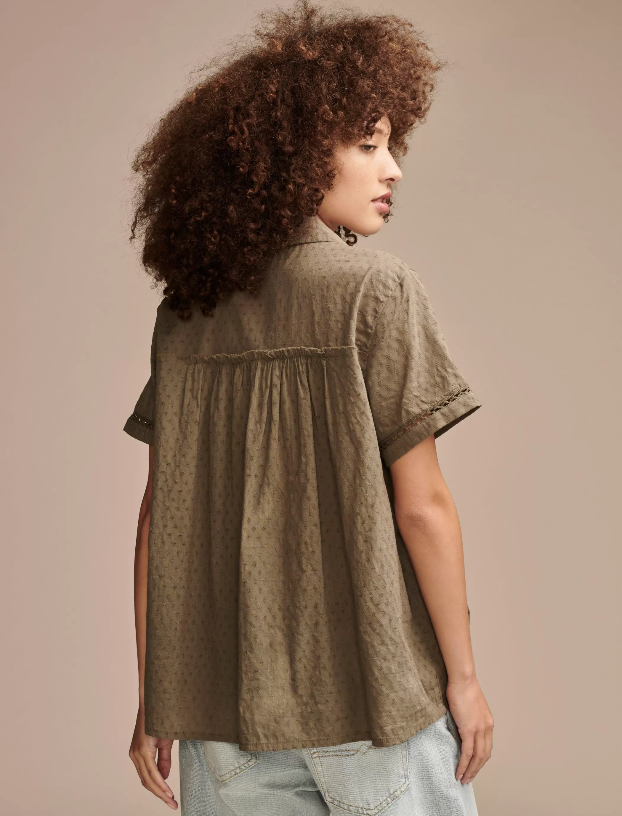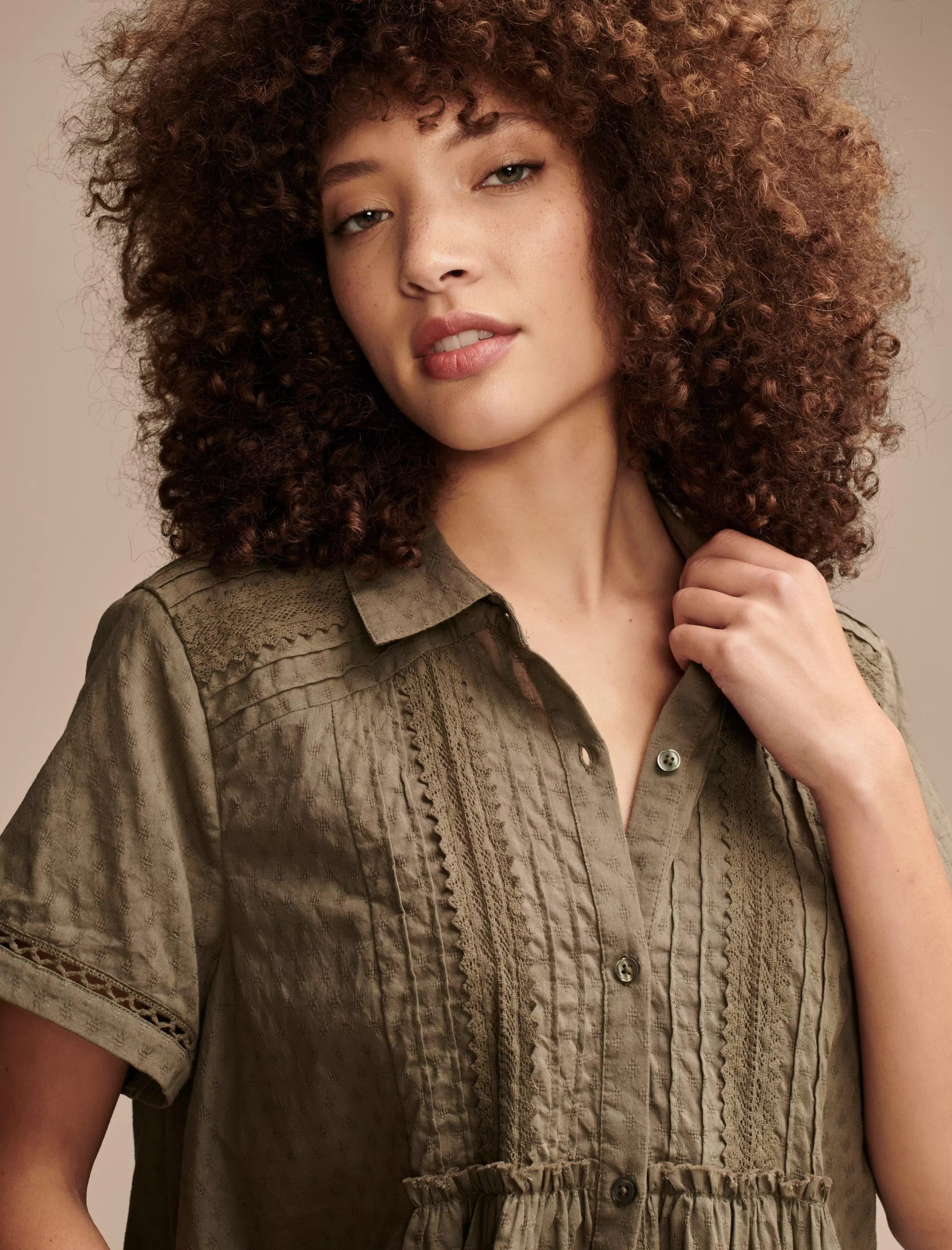 It’s all in the details. Woven of soft, one hundred percent cotton, this button down shirt keeps your look cute with pretty lace motif and fun ruffles throughout.
