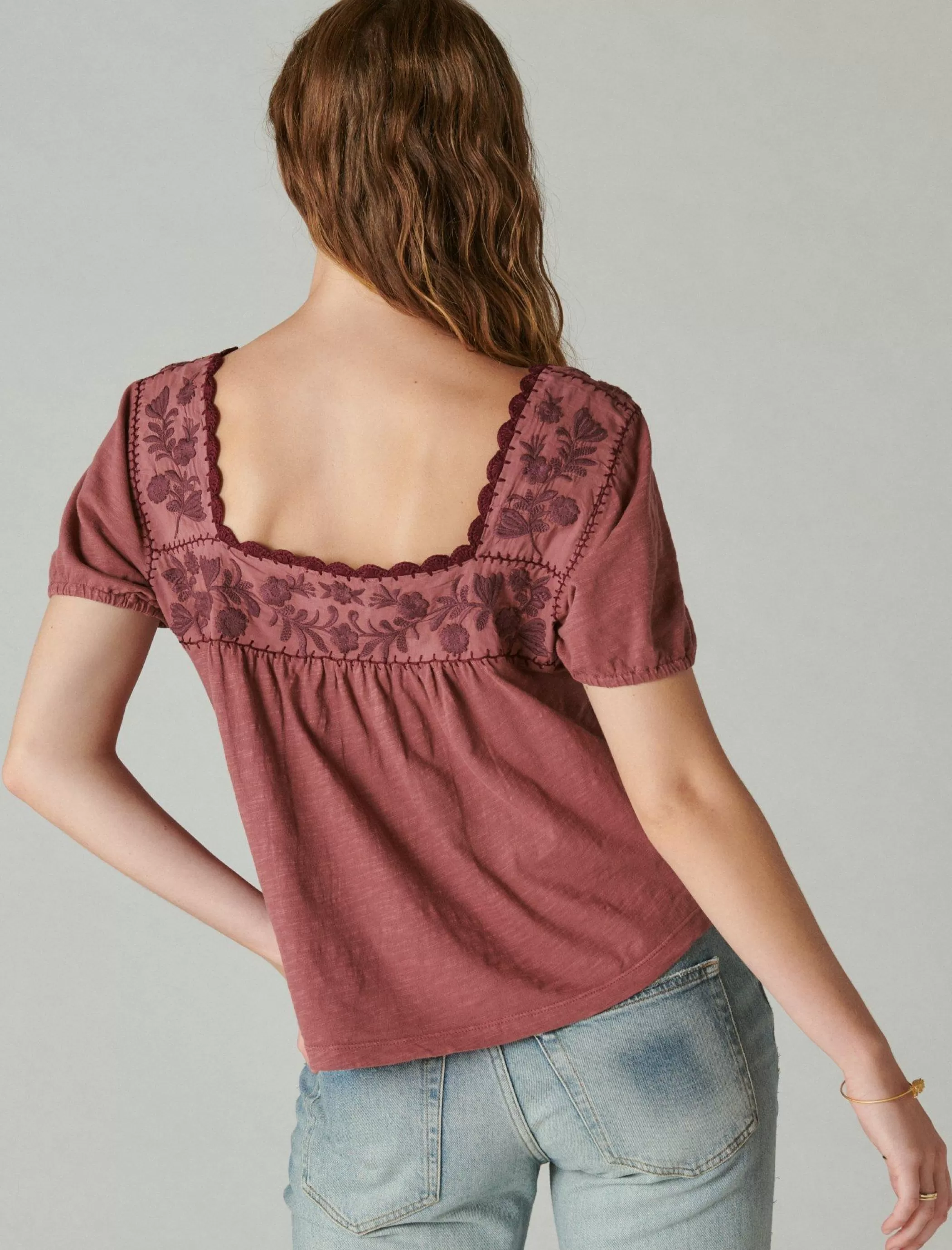 Detailed with a stunning embroidered floral design, this peasant-style top features a flattering square neckline with so pretty scallop edging.