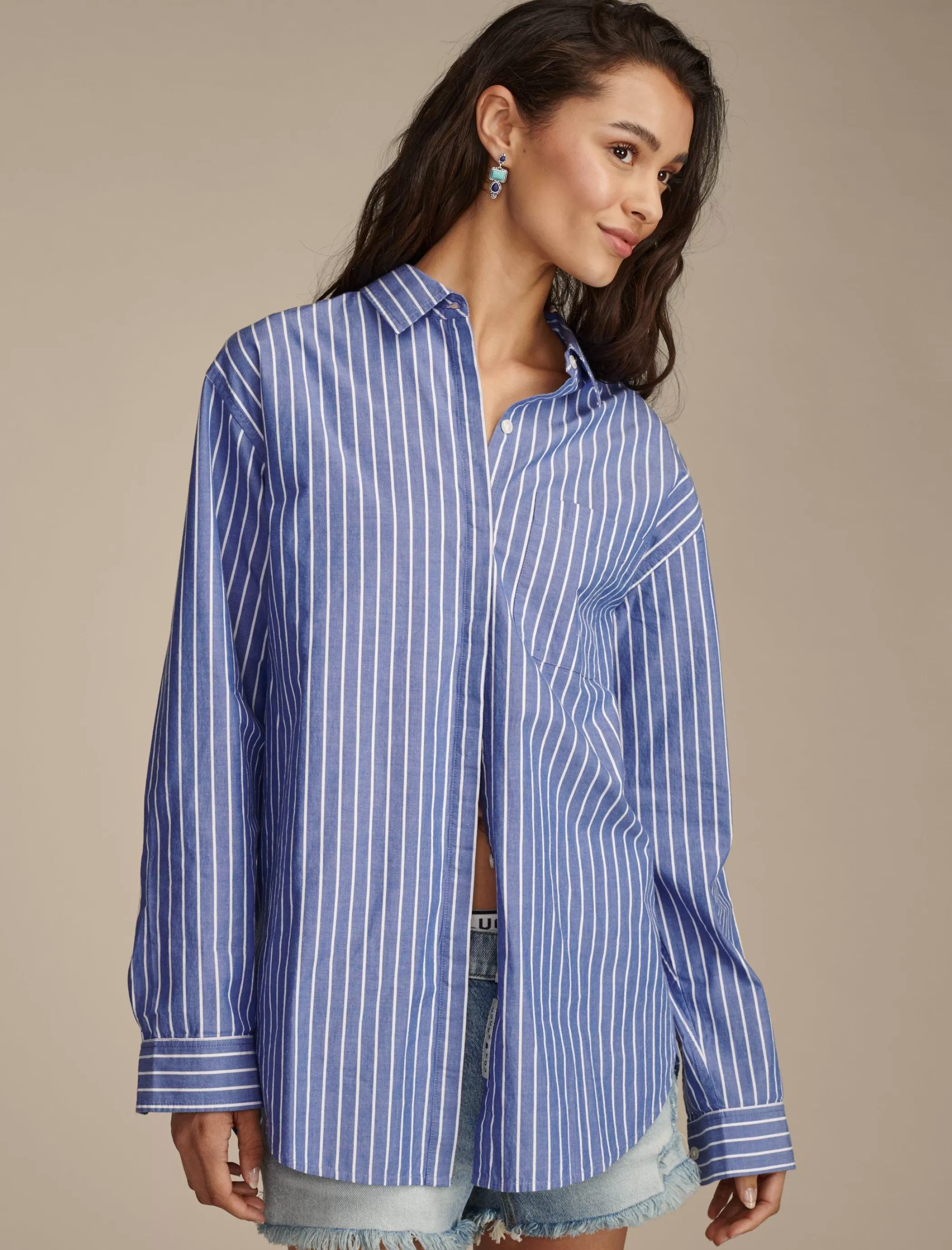 Move over, basic button down. Soft and comfy in one hundred percent cotton, this long sleeve style is updated with a roomy, oversized fit and fun buttoned backside.