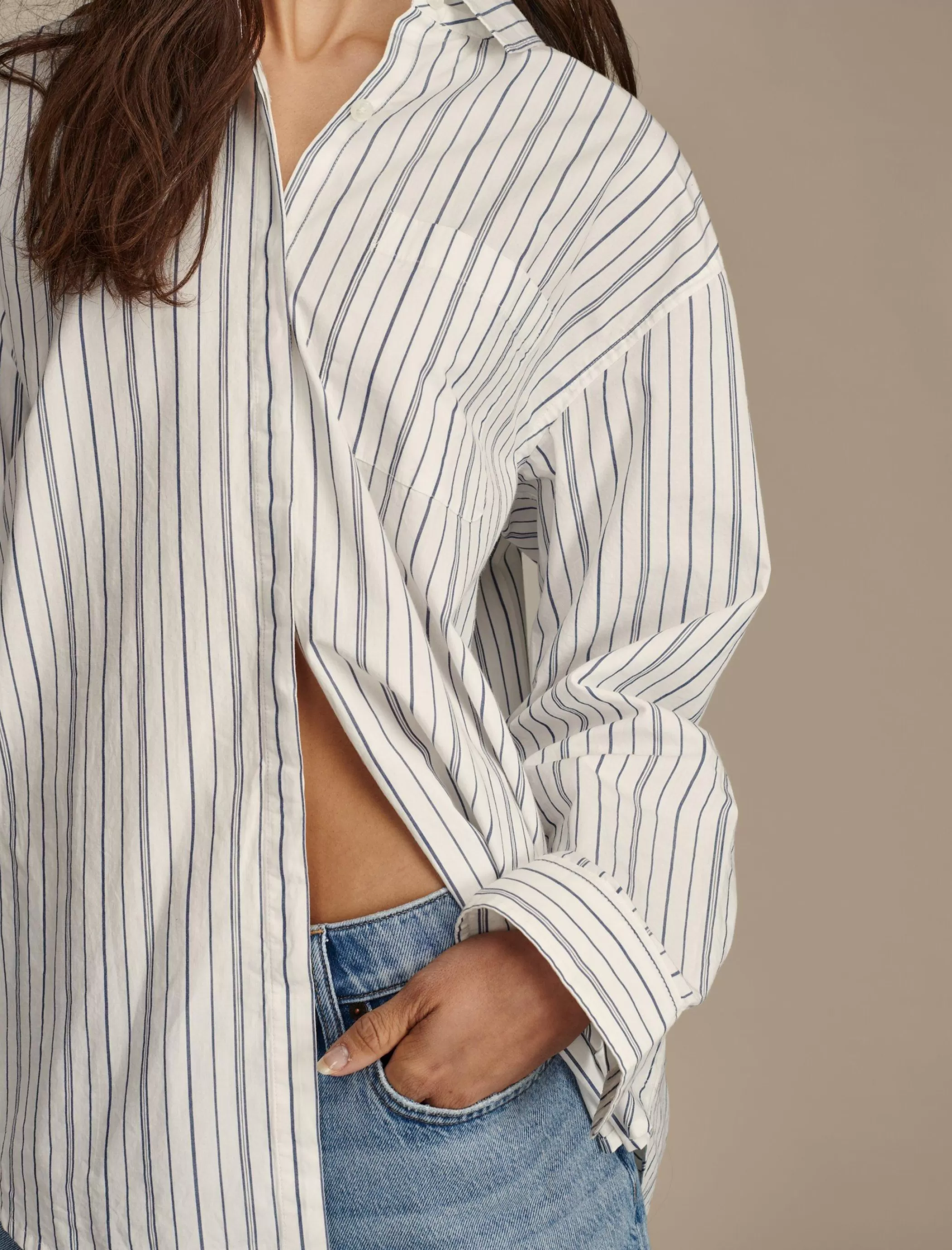Move over, basic button down. Soft and comfy in one hundred percent cotton, this long sleeve style is updated with a roomy, oversized fit and fun buttoned backside.
