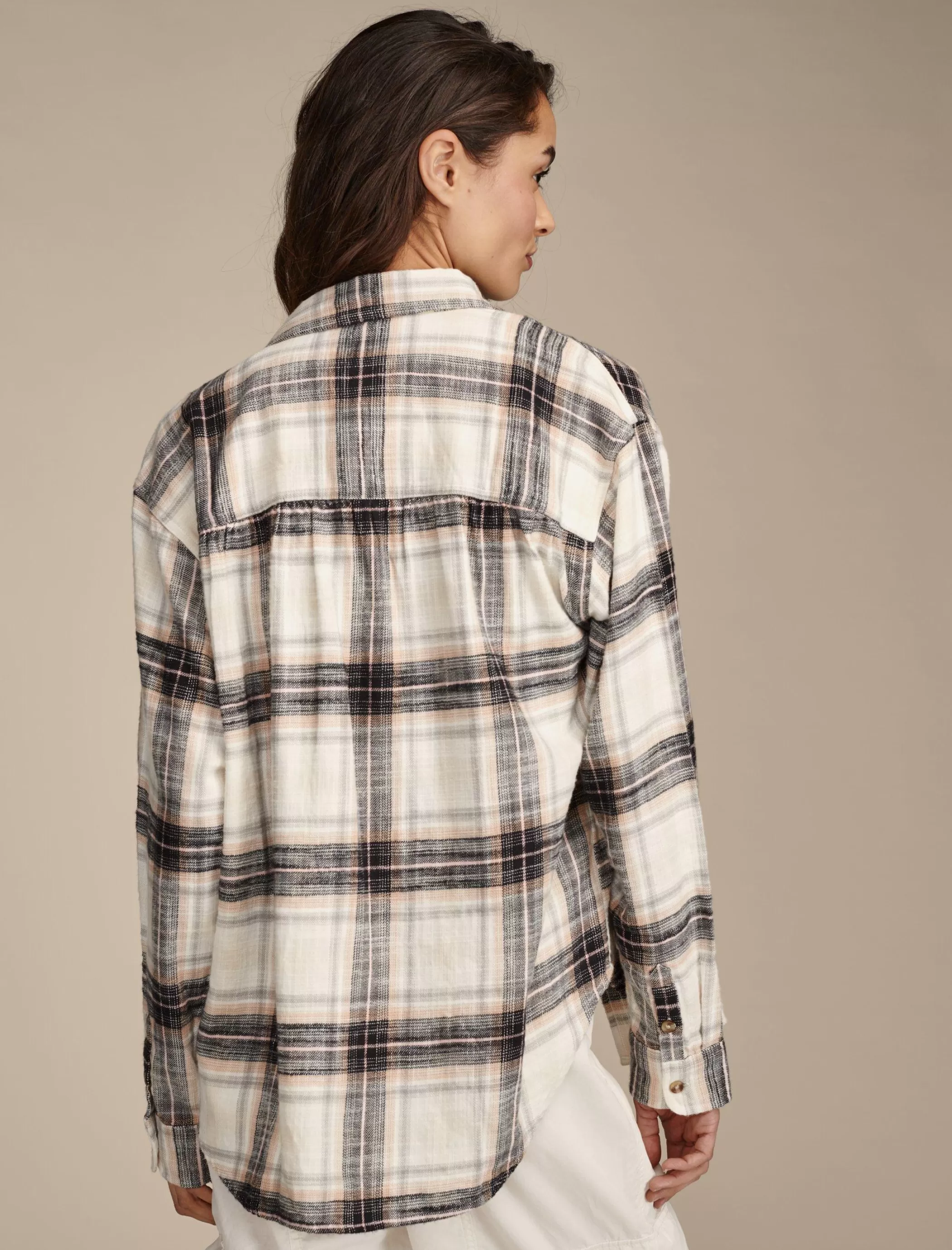 Perfectly oversized in soft, one hundred percent cotton, this boyfriend shirt is cut for a comfy oversized fit, complete with a patch pocket, full button front and classic plaid print.
