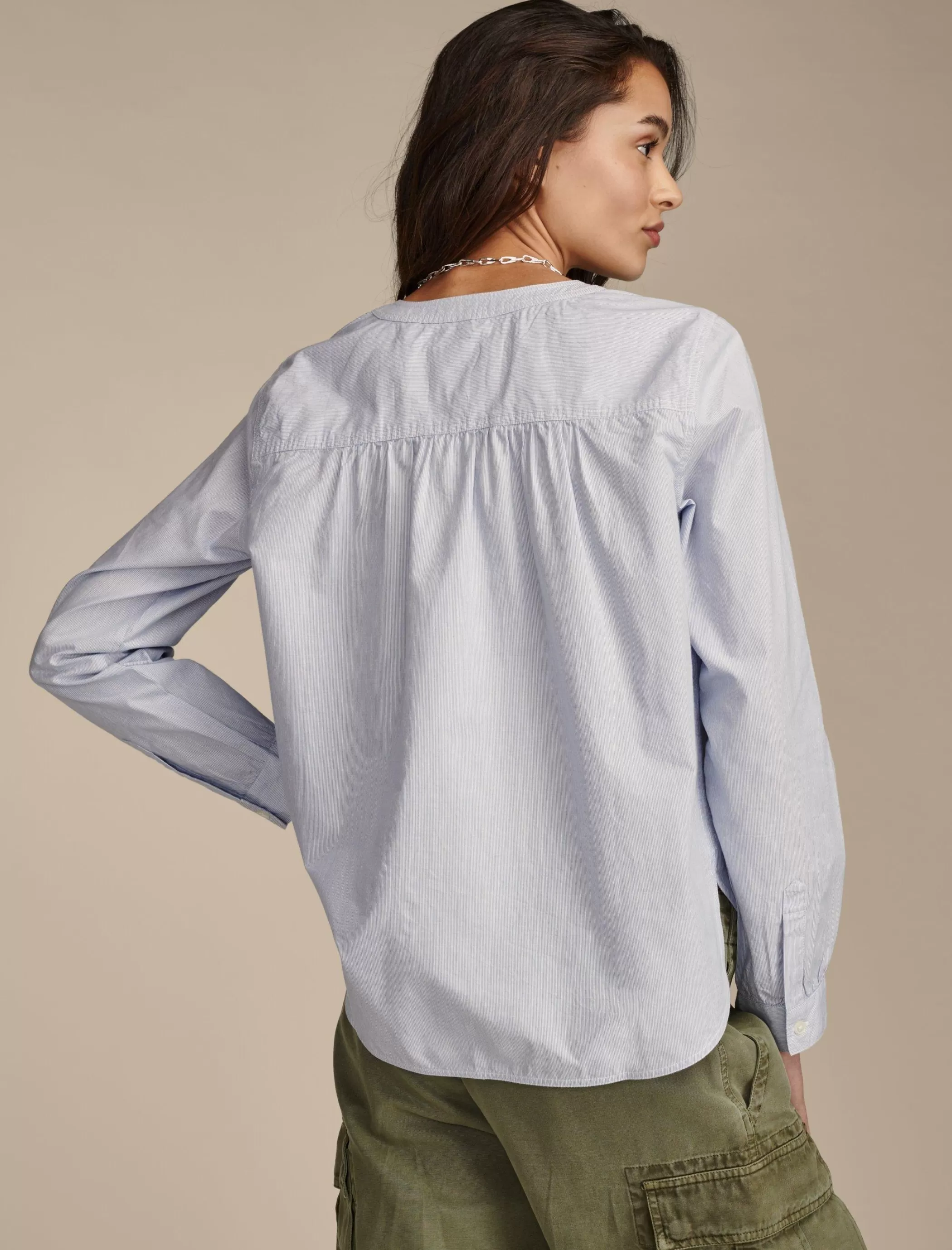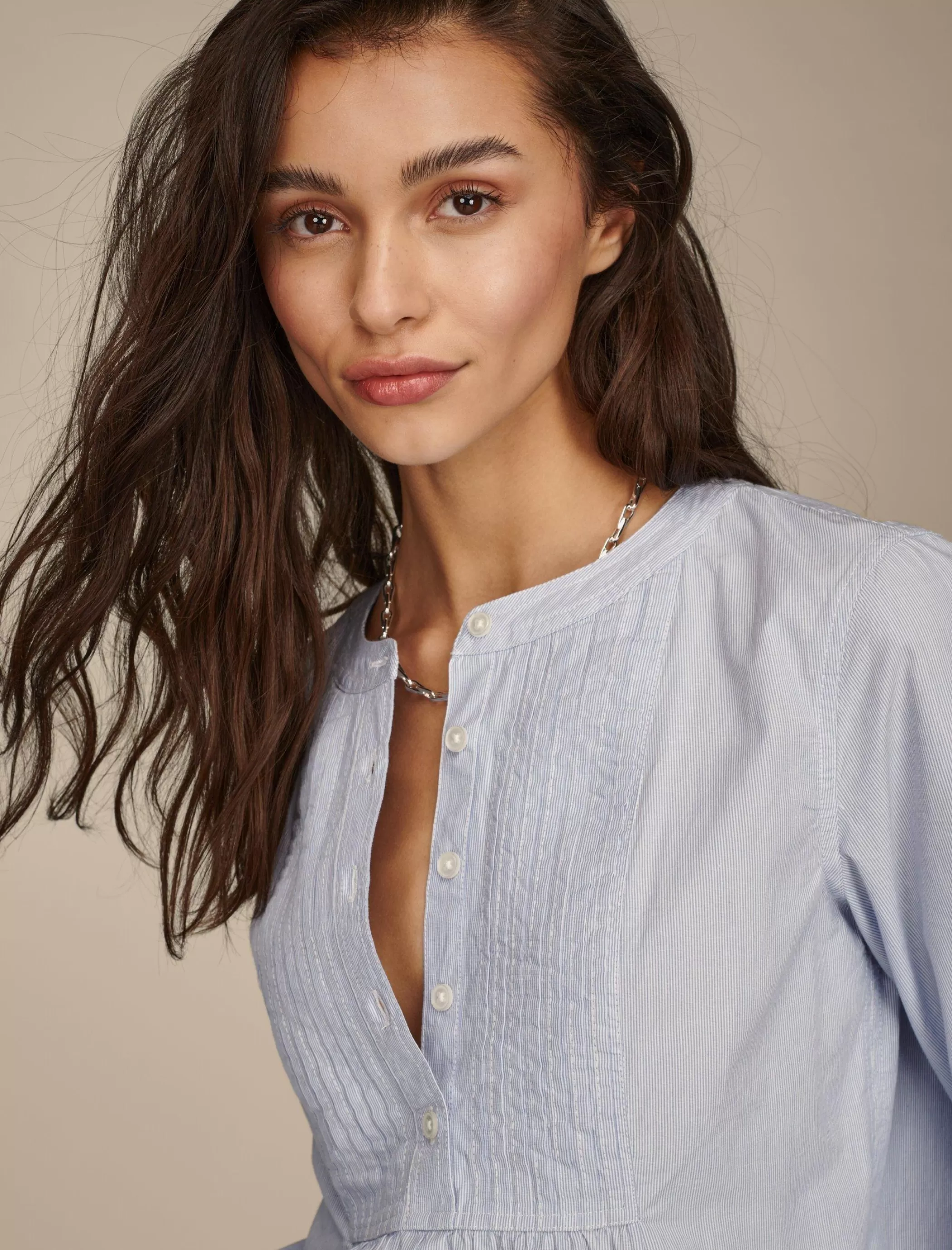Cut from one hundred percent cotton, this long sleeve bib blouse shows off pretty pintuck details down the front and a c…