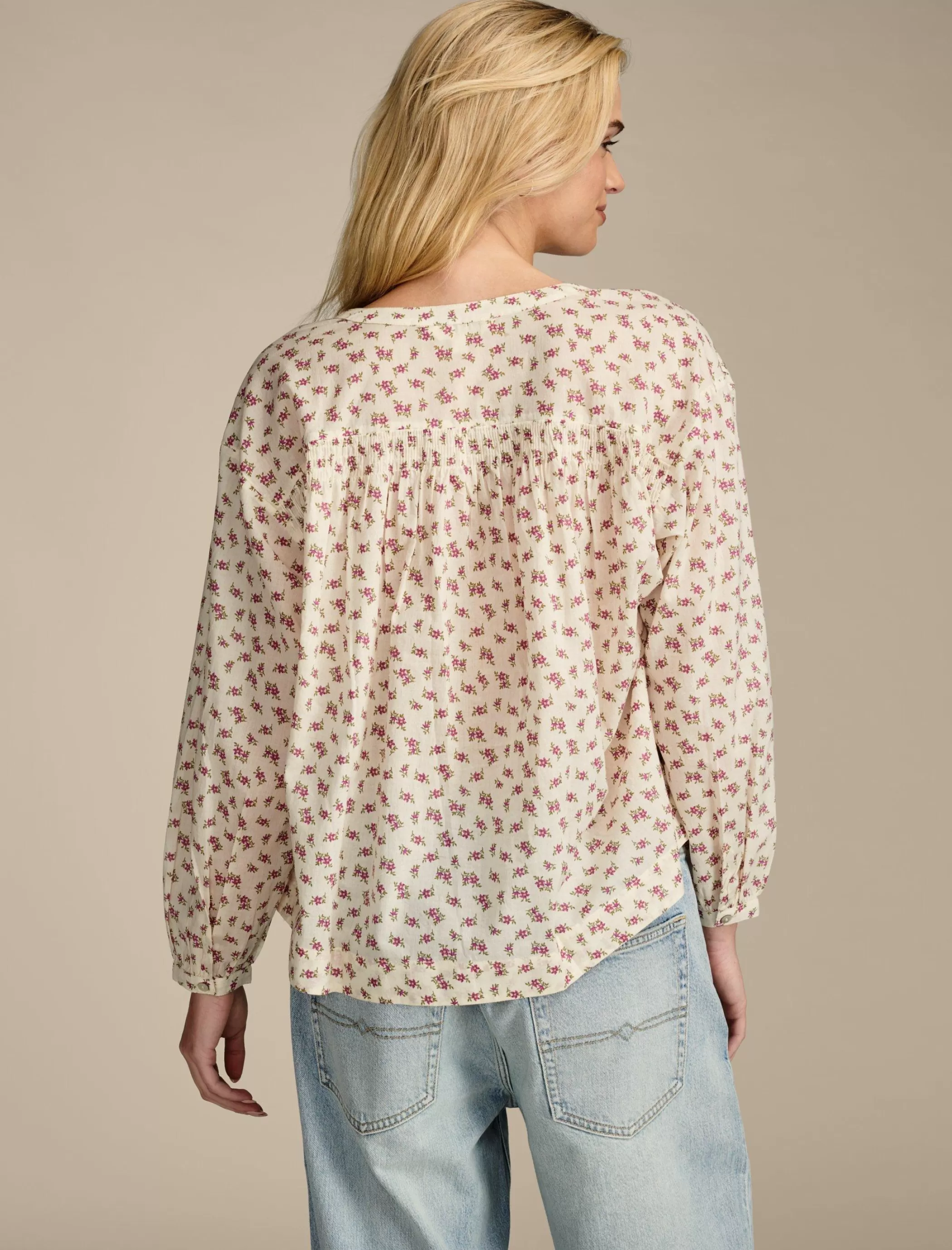 Cut from soft, one hundred percent cotton, this long sleeve buttoned blouse shows off a pretty all-over print and subtle smocking at the back.