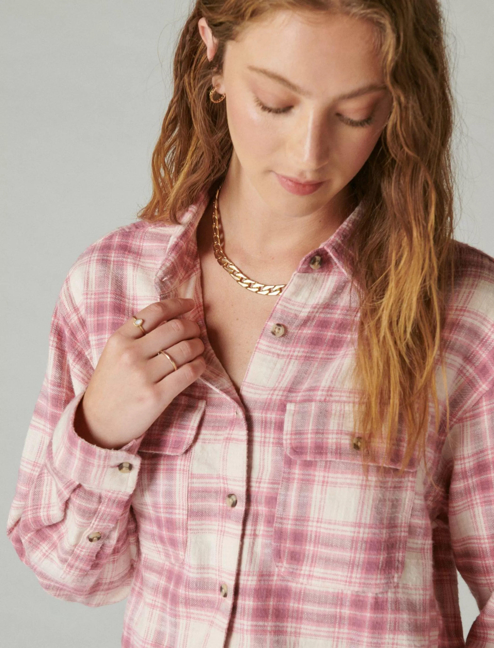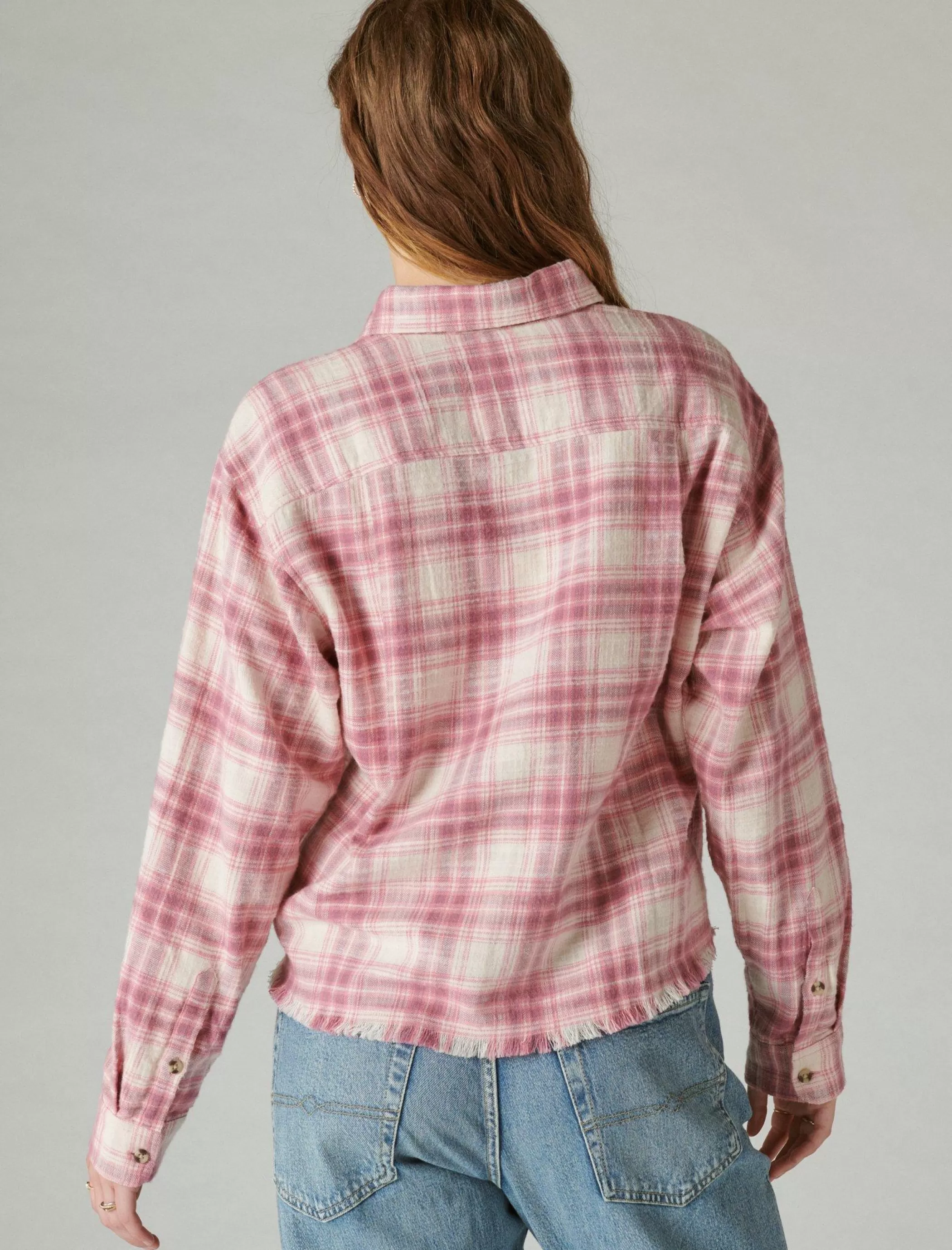Pretty in plaid, but make it rad. Perfectly cropped at the waist, this cool-weather closet staple is refreshed with double button-flap pockets and a raw edge hem for added edge.