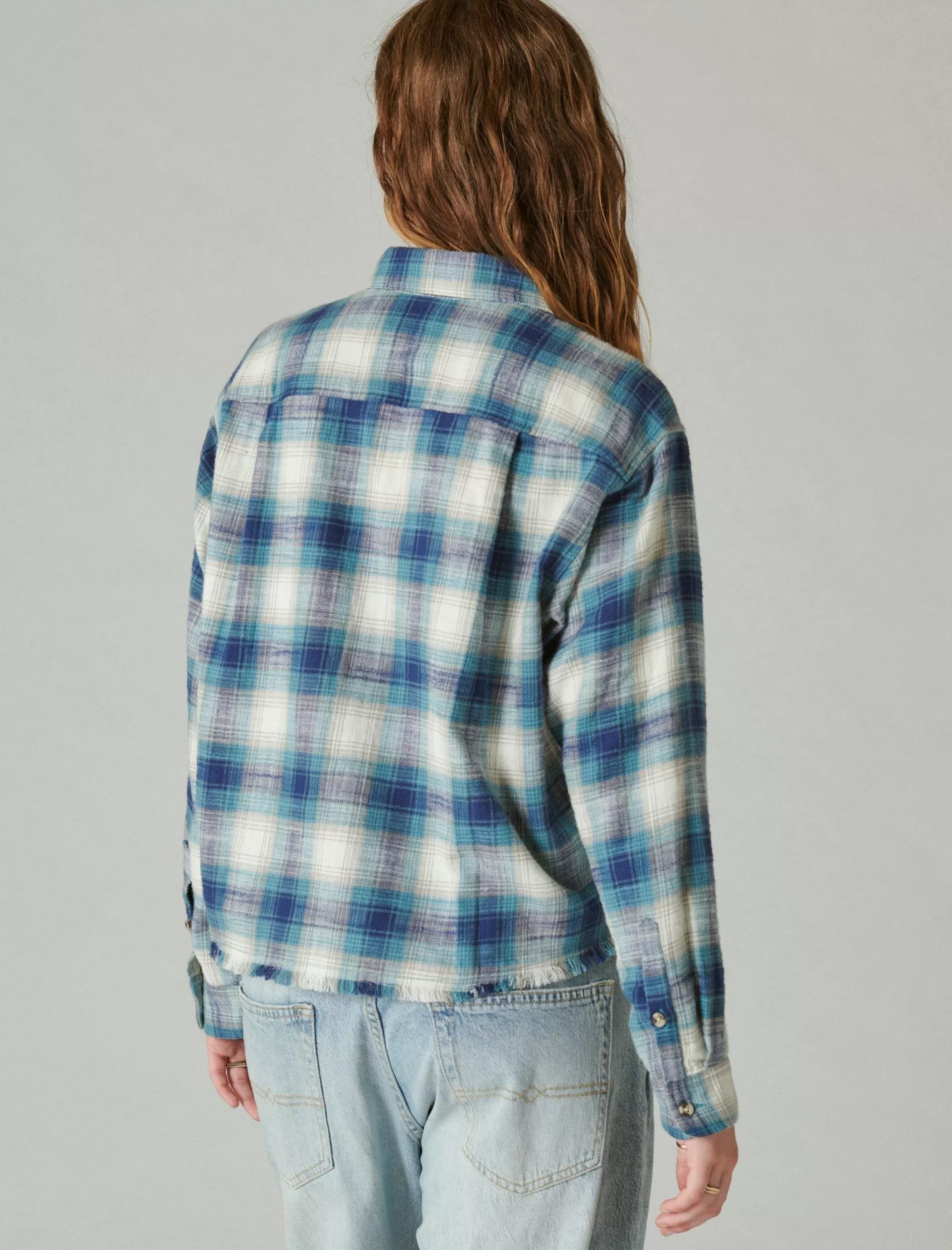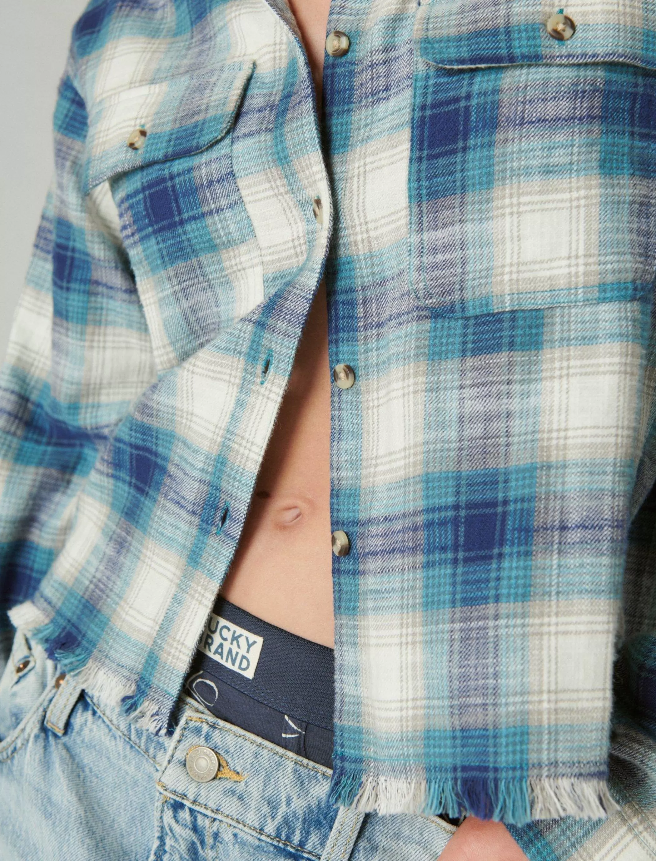 Pretty in plaid, but make it rad. Perfectly cropped at the waist, this cool-weather closet staple is refreshed with double button-flap pockets and a raw edge hem for added edge.