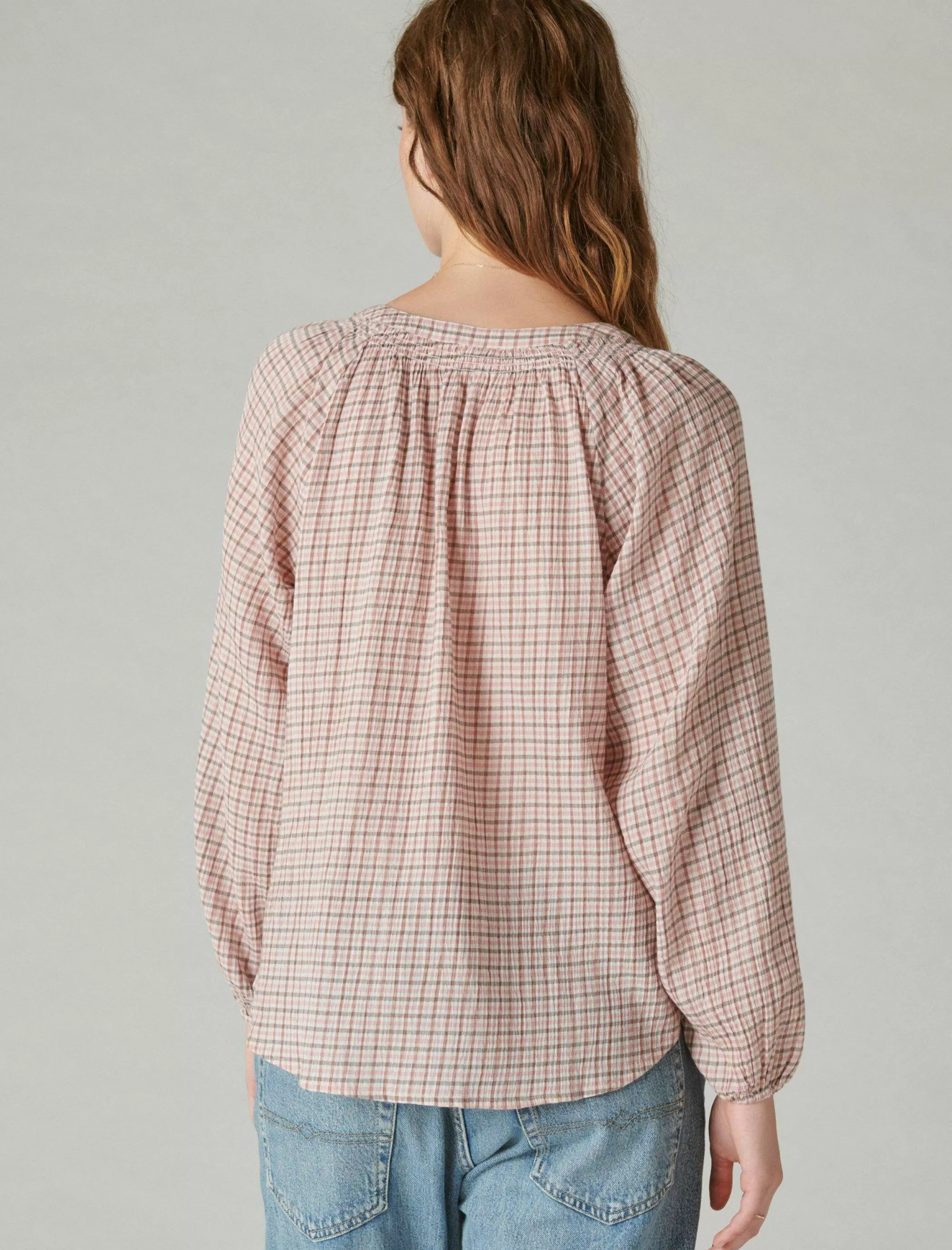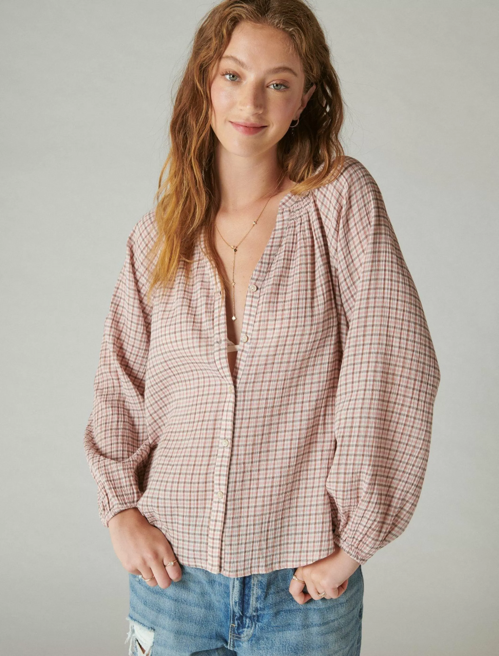 So easy and effortless, this open neck shirt keeps your look casual and cute with a classic plaid print and slouchy-like, relaxed-fit silhouette.