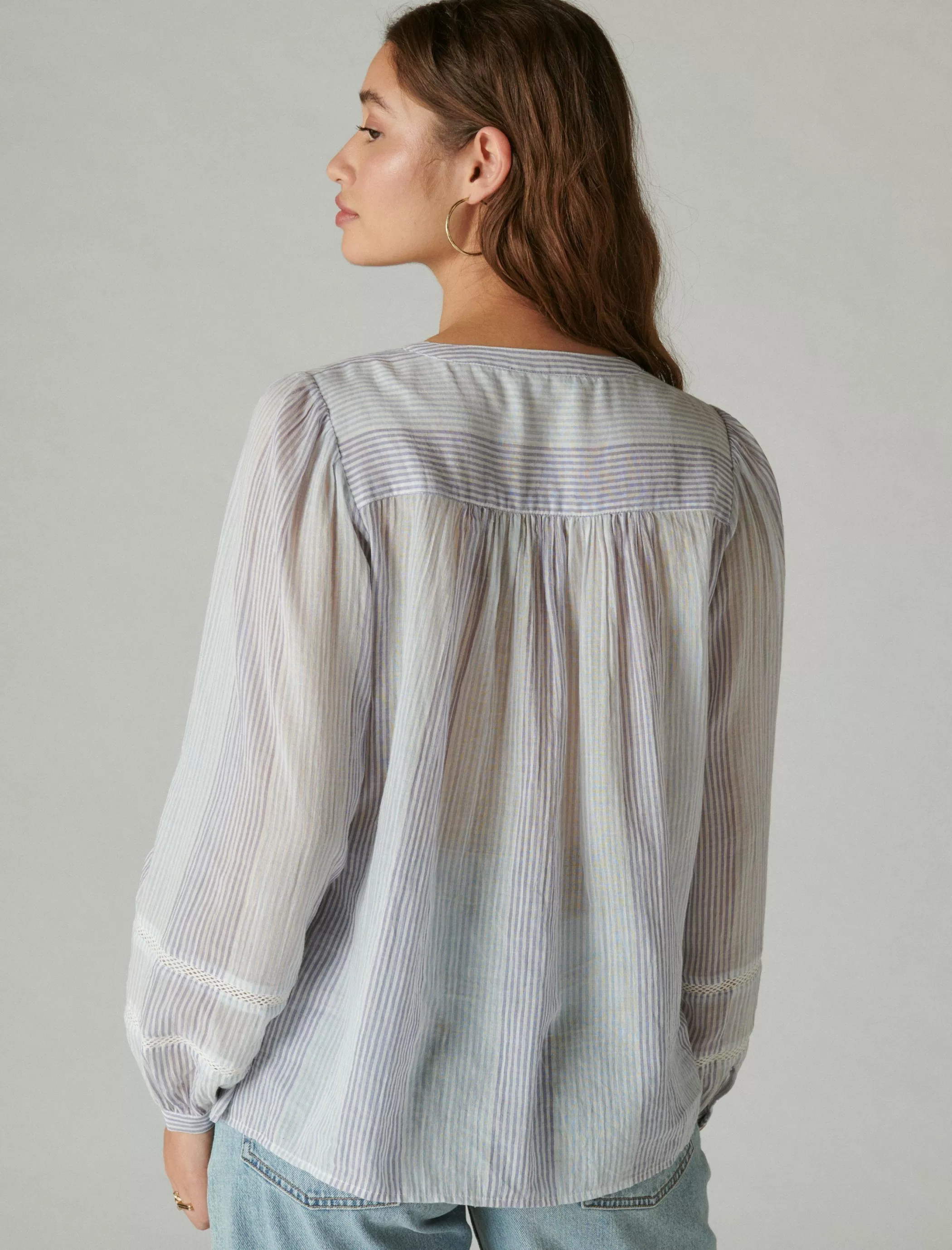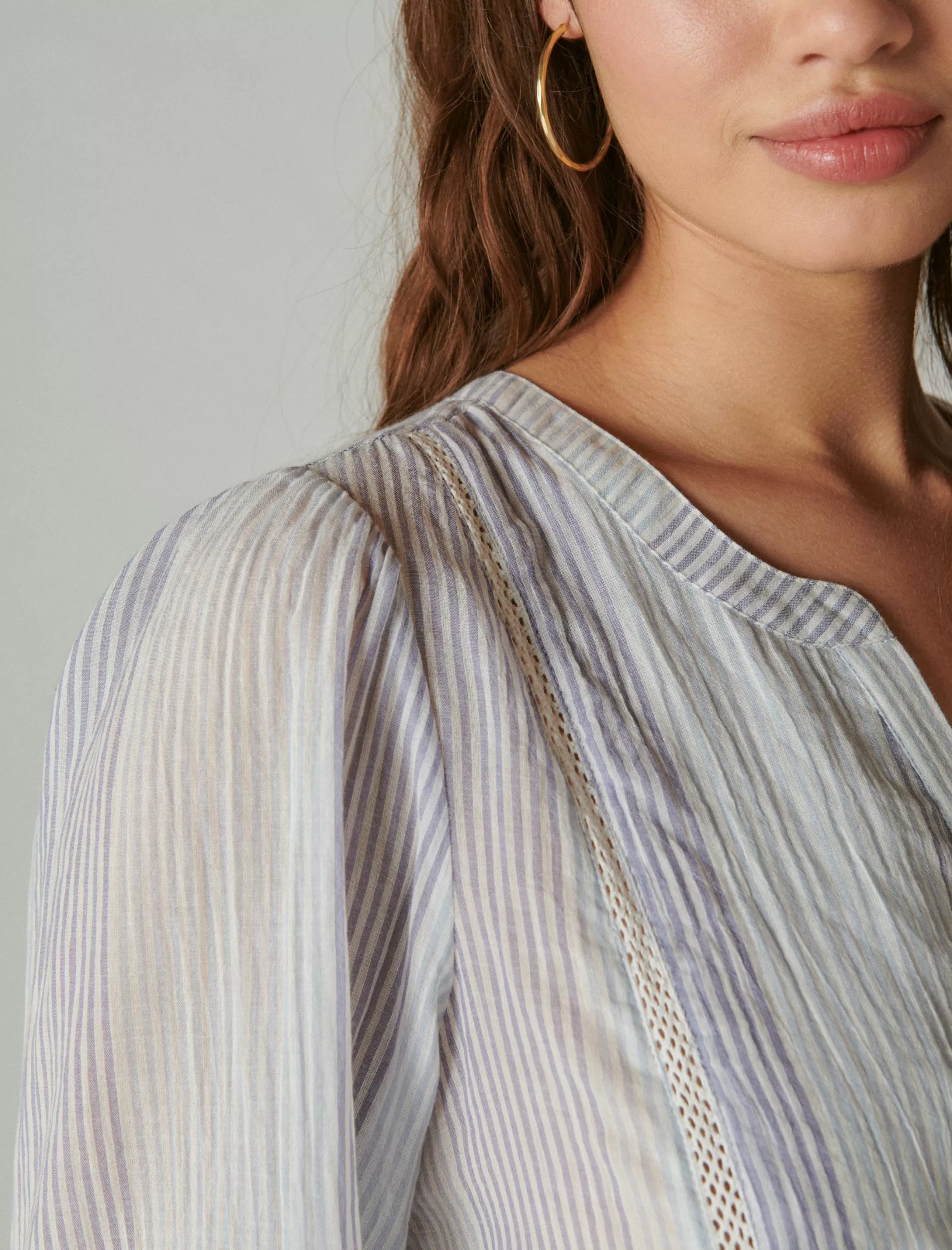 Made of soft, lightweight cotton, this striped blouse has a flattering split neckline, three-button front and pretty lace details throughout.