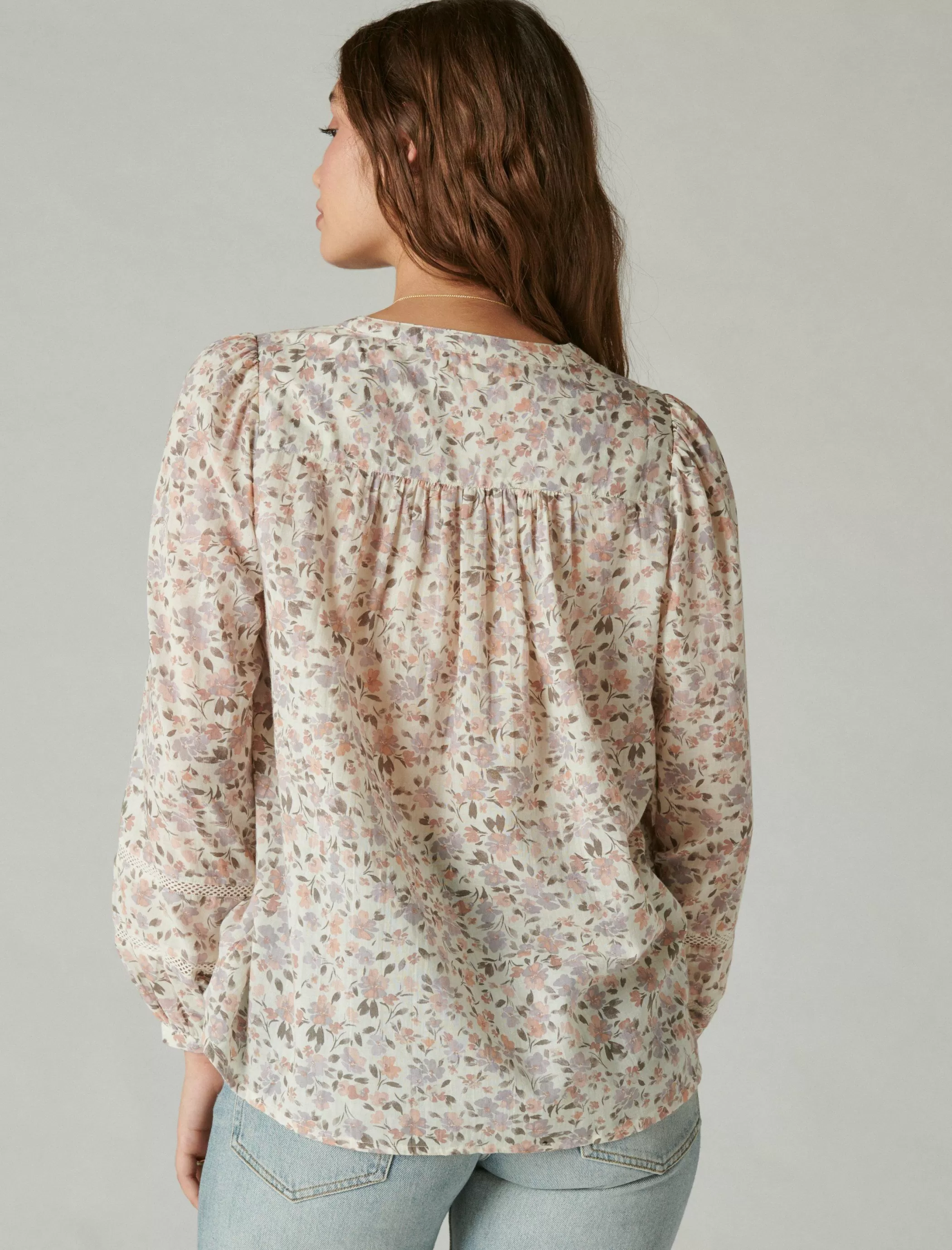 Made of soft, lightweight cotton, this striped blouse has a flattering split neckline, three-button front and pretty lace details throughout.