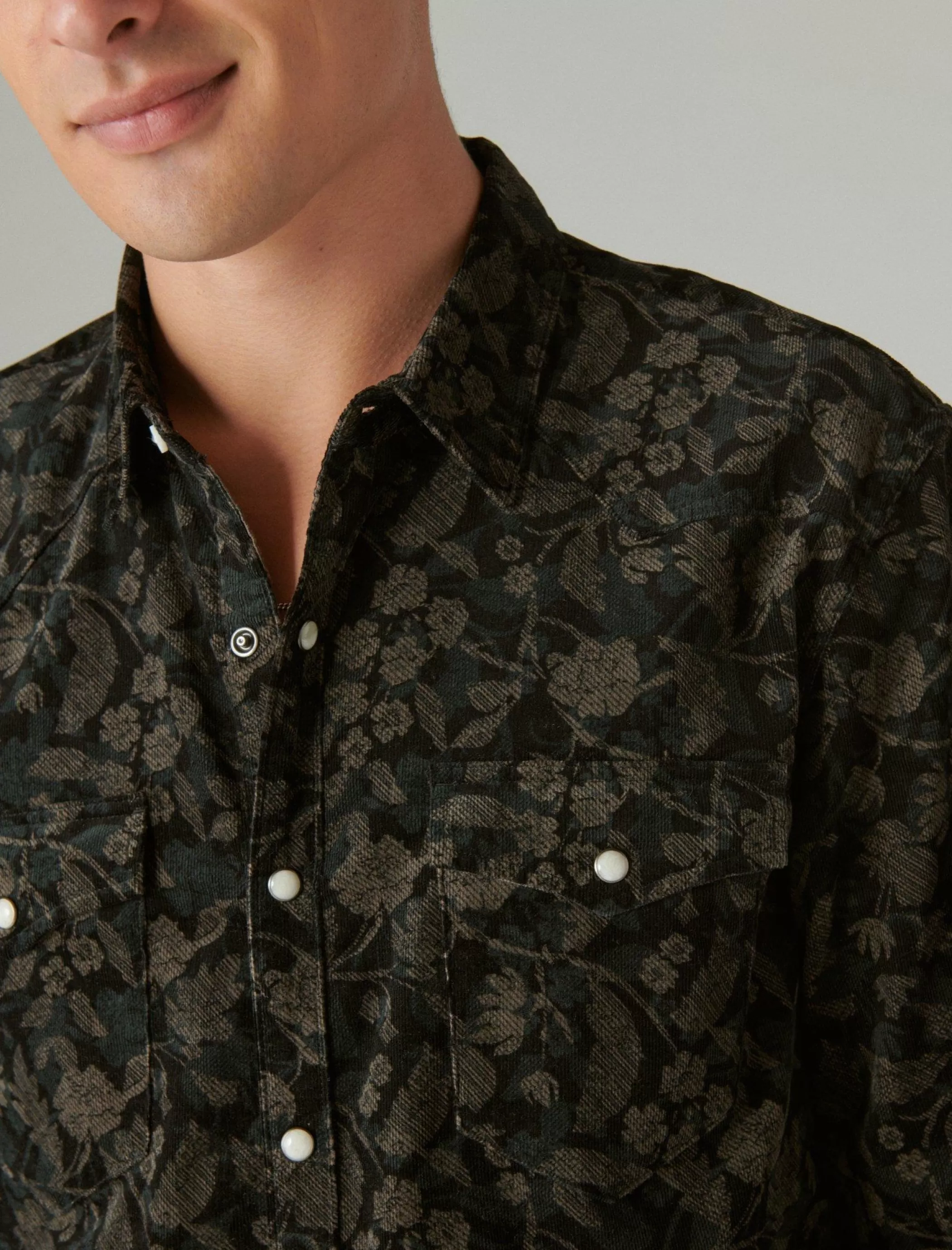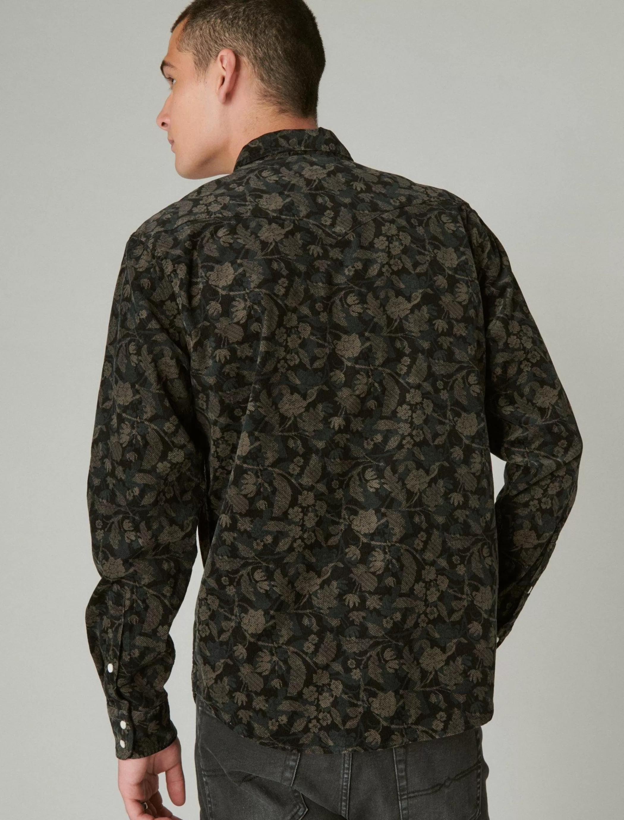 Move over, basic button-down. Featured in soft corduroy, this long sleeve shirt has an all-over floral pattern and western-inspired detailing like snap-button flap pockets and buttoned cuffs.