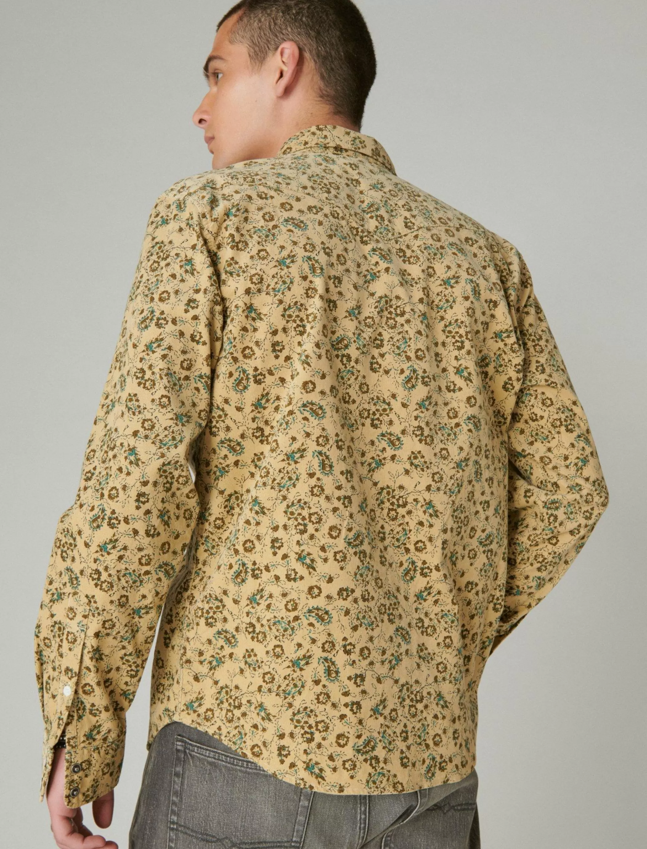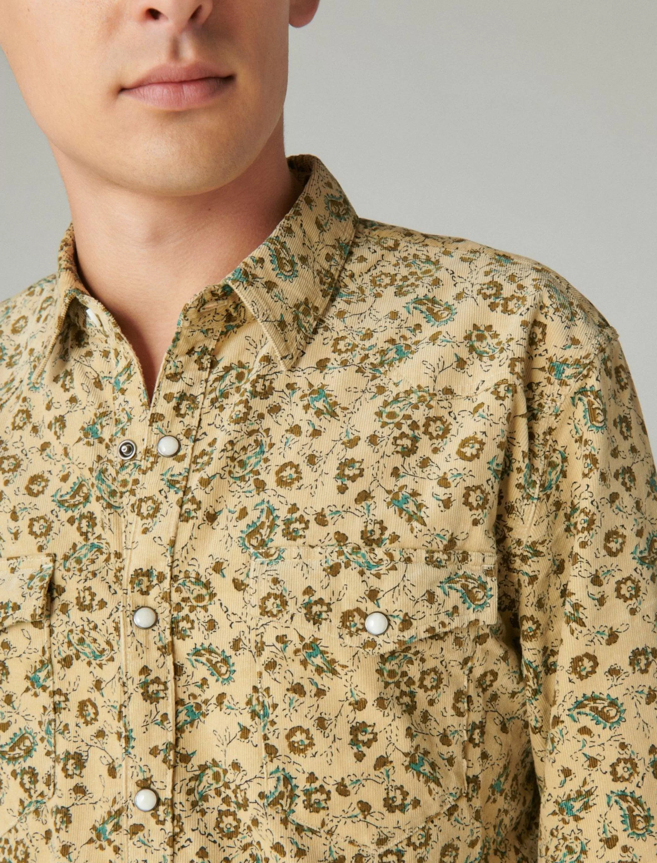 Move over, basic button-down. Featured in soft corduroy, this long sleeve shirt has an all-over floral pattern and western-inspired detailing like snap-button flap pockets and buttoned cuffs.