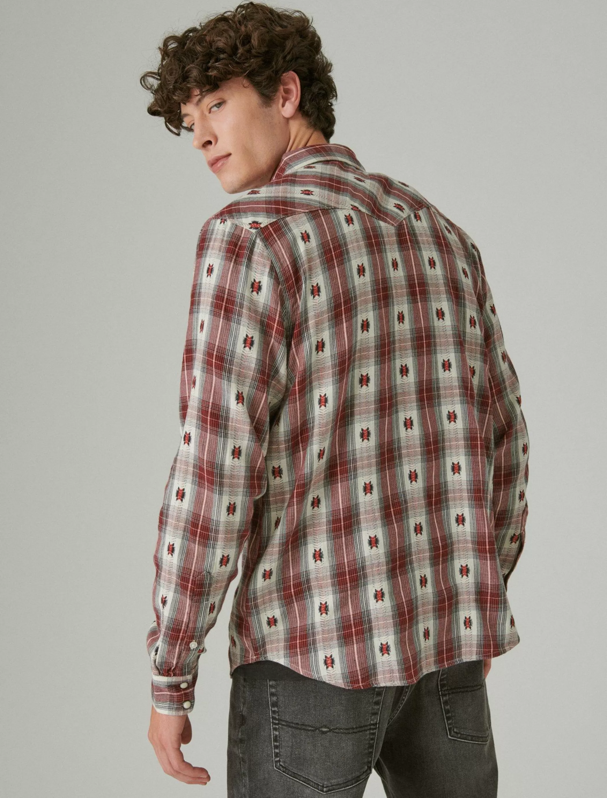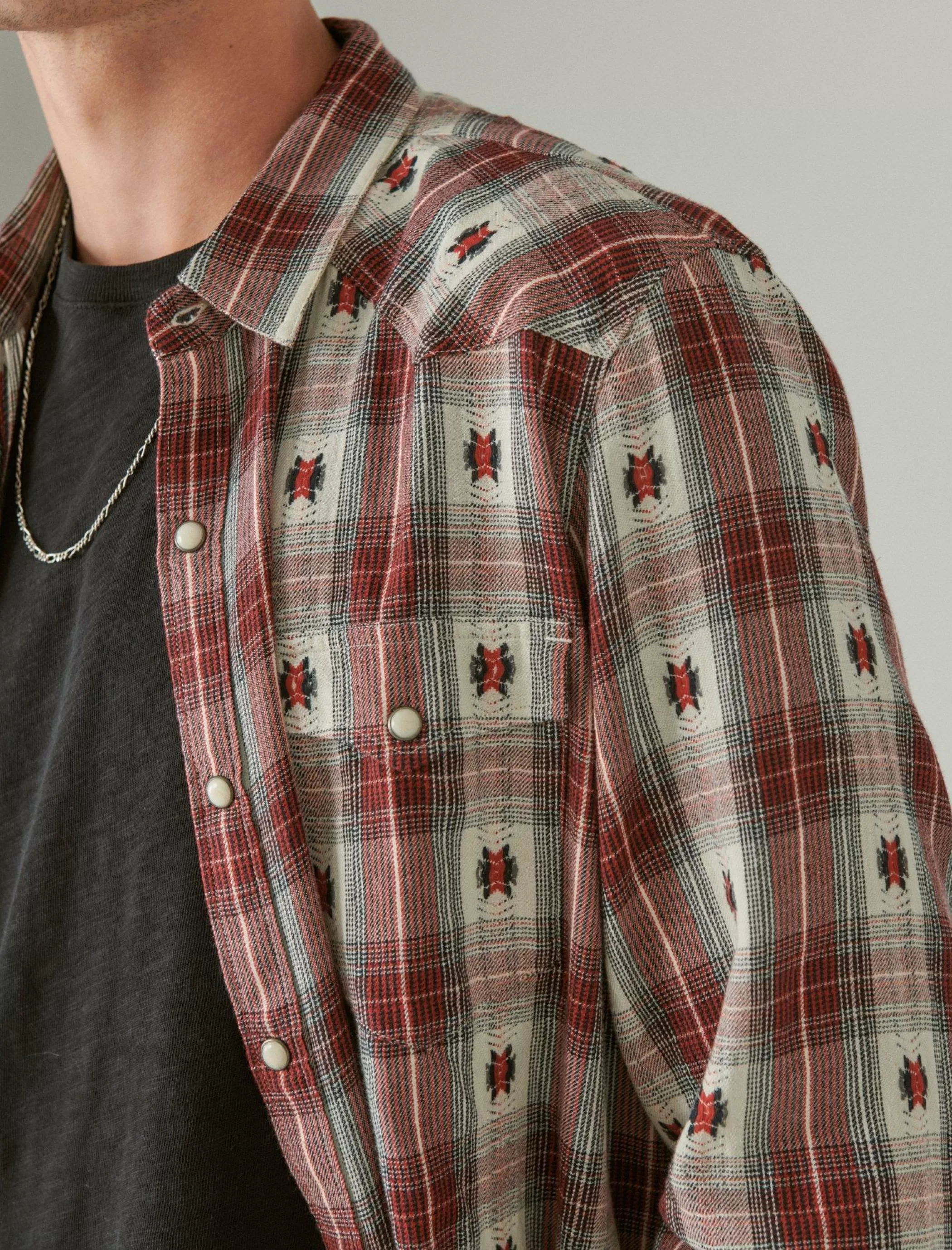 Give your graphic tee a break and reach for this western-inspired shirt instead. Made of soft dobby cotton, this plaid button-down is complete with snap-button pockets and a slightly curved hem.