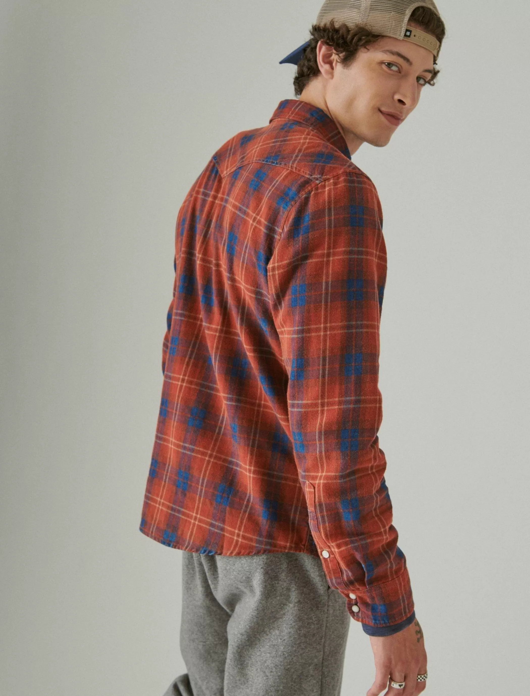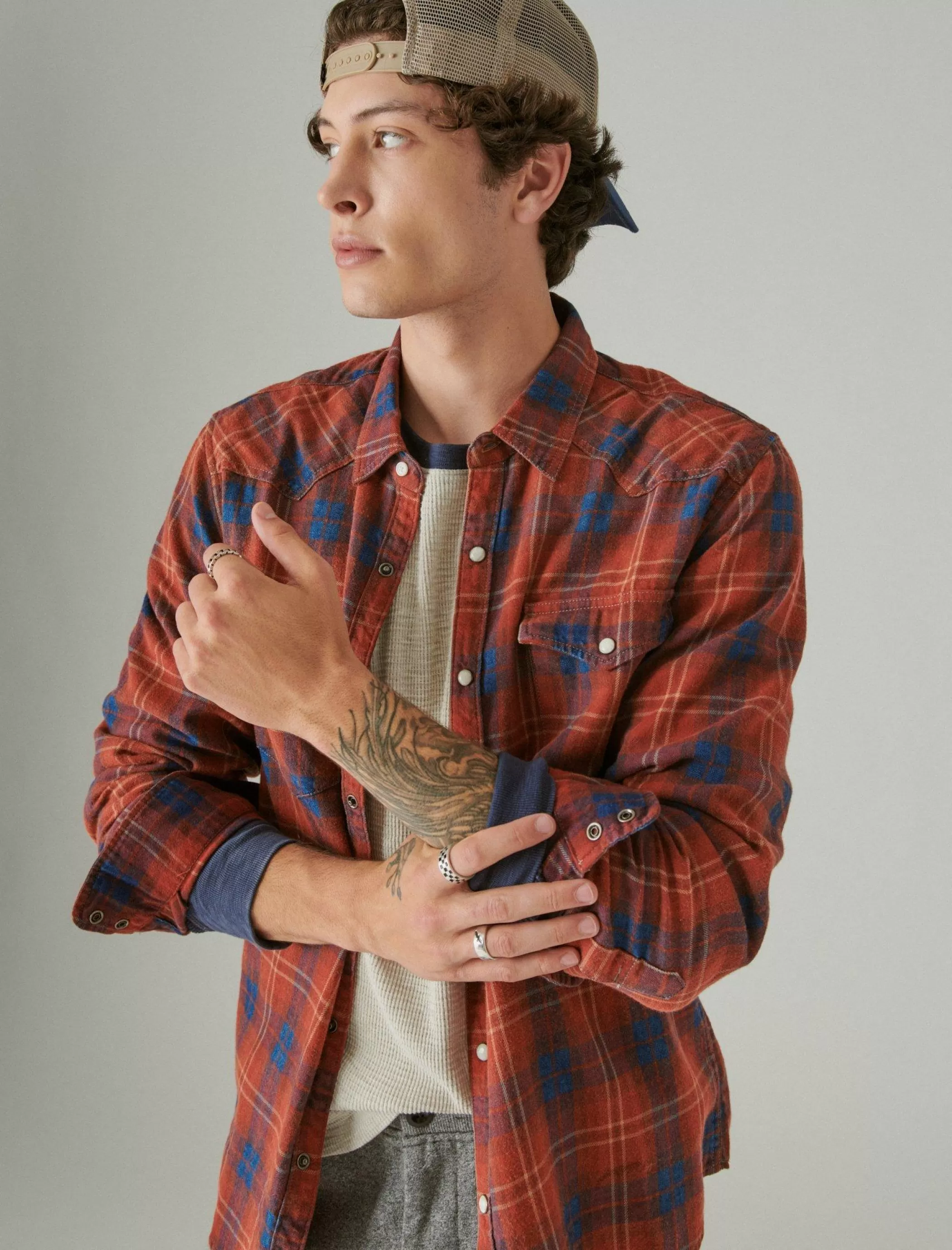 Dyed with indigo for a one-of-a-kind appearance, this long sleeve shirt evokes western-inspired style with all-over plaid patterning, a spread collar and double snap-button pockets. Dress it up or dress it down depending on your mood.