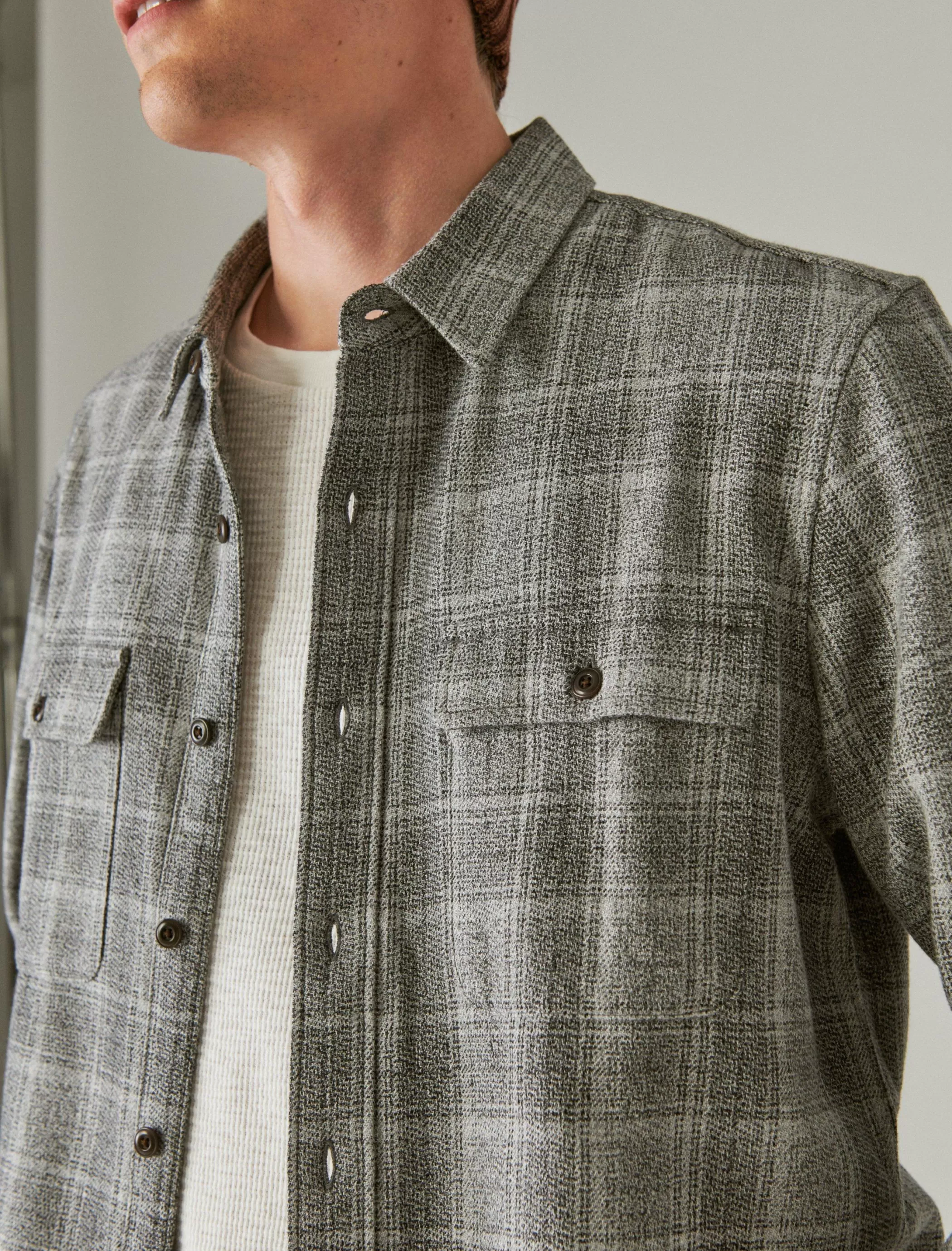 Knit from 100% cotton, this utility-inspired button down flannel is designed with a classic plaid pattern, spread collar and double button-flap chest pockets.
