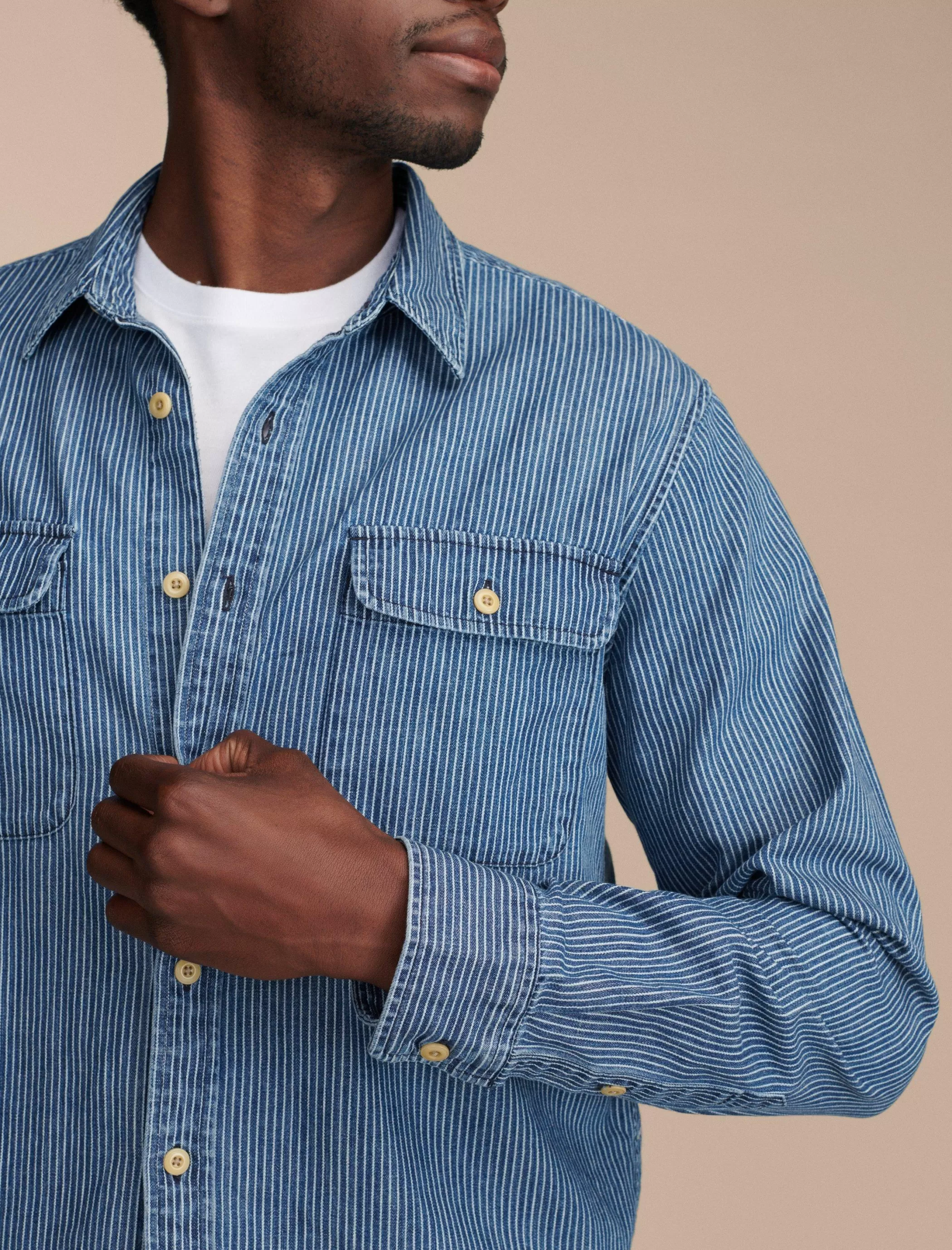 With utility detailing and railroad stripes in one hundred percent cotton, this denim button-down is a go-to choice for any day of the week.
