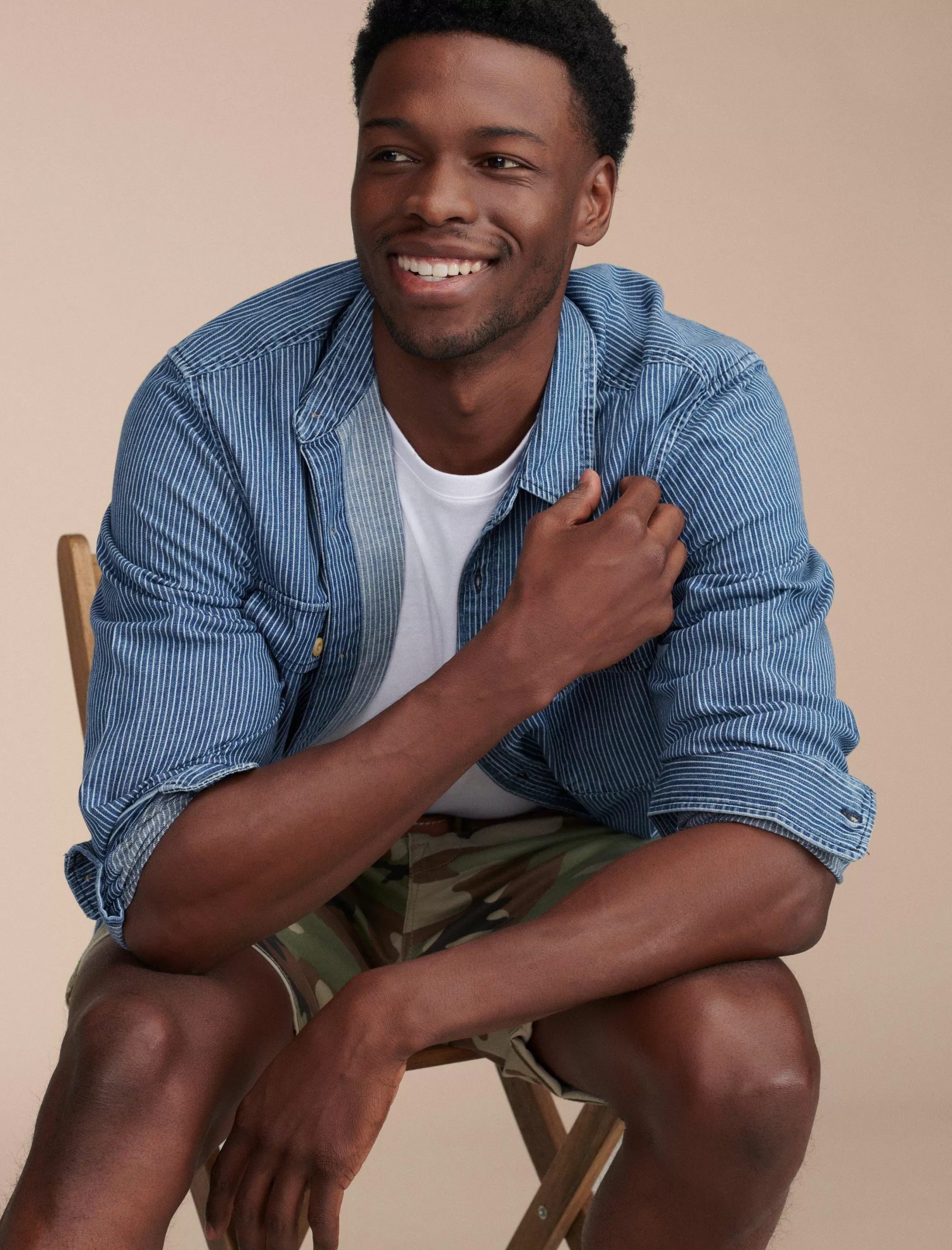 With utility detailing and railroad stripes in one hundred percent cotton, this denim button-down is a go-to choice for …