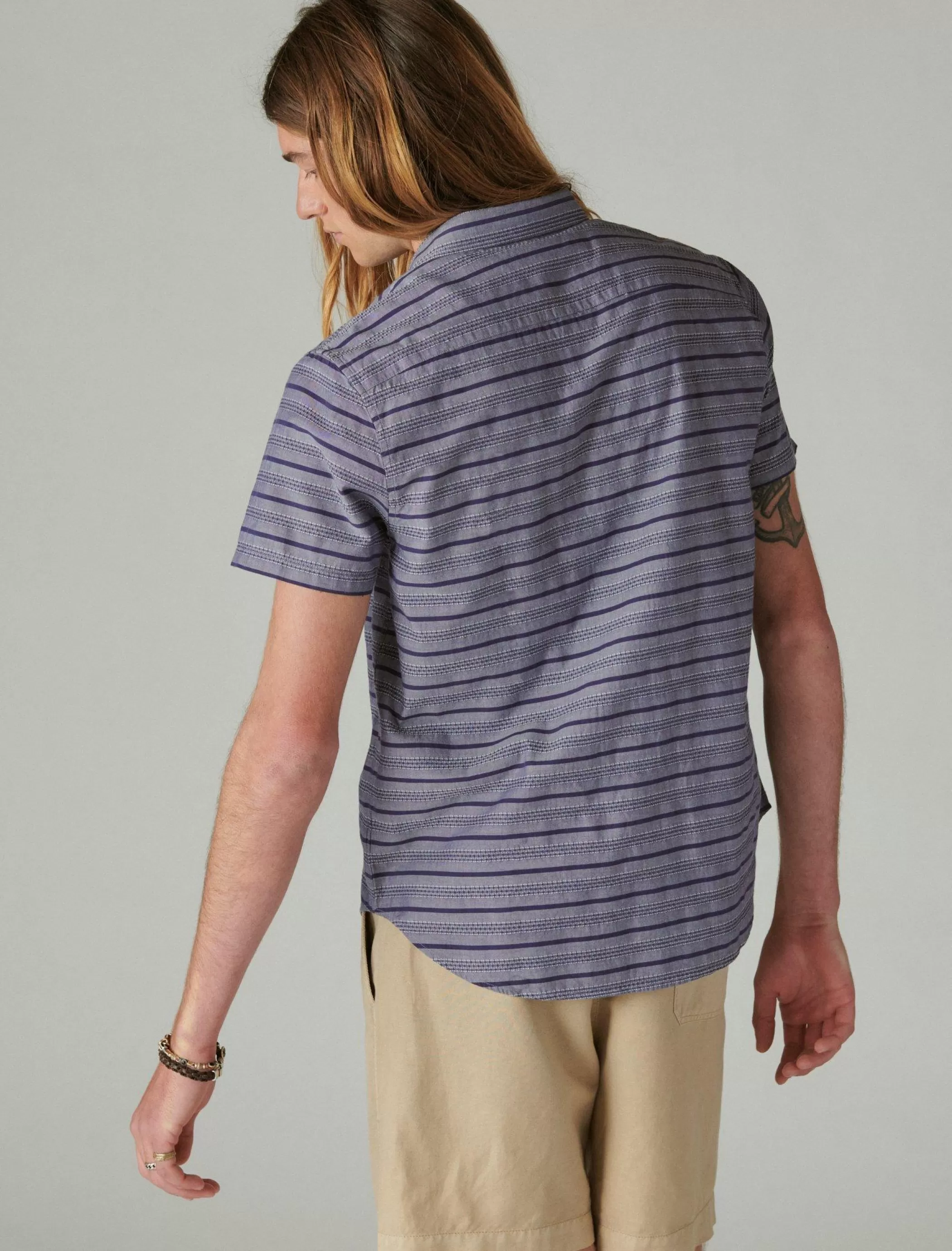 Mix up your everyday style with this striped workwear-inspired shirt featuring a spread collar, button-down front and do…
