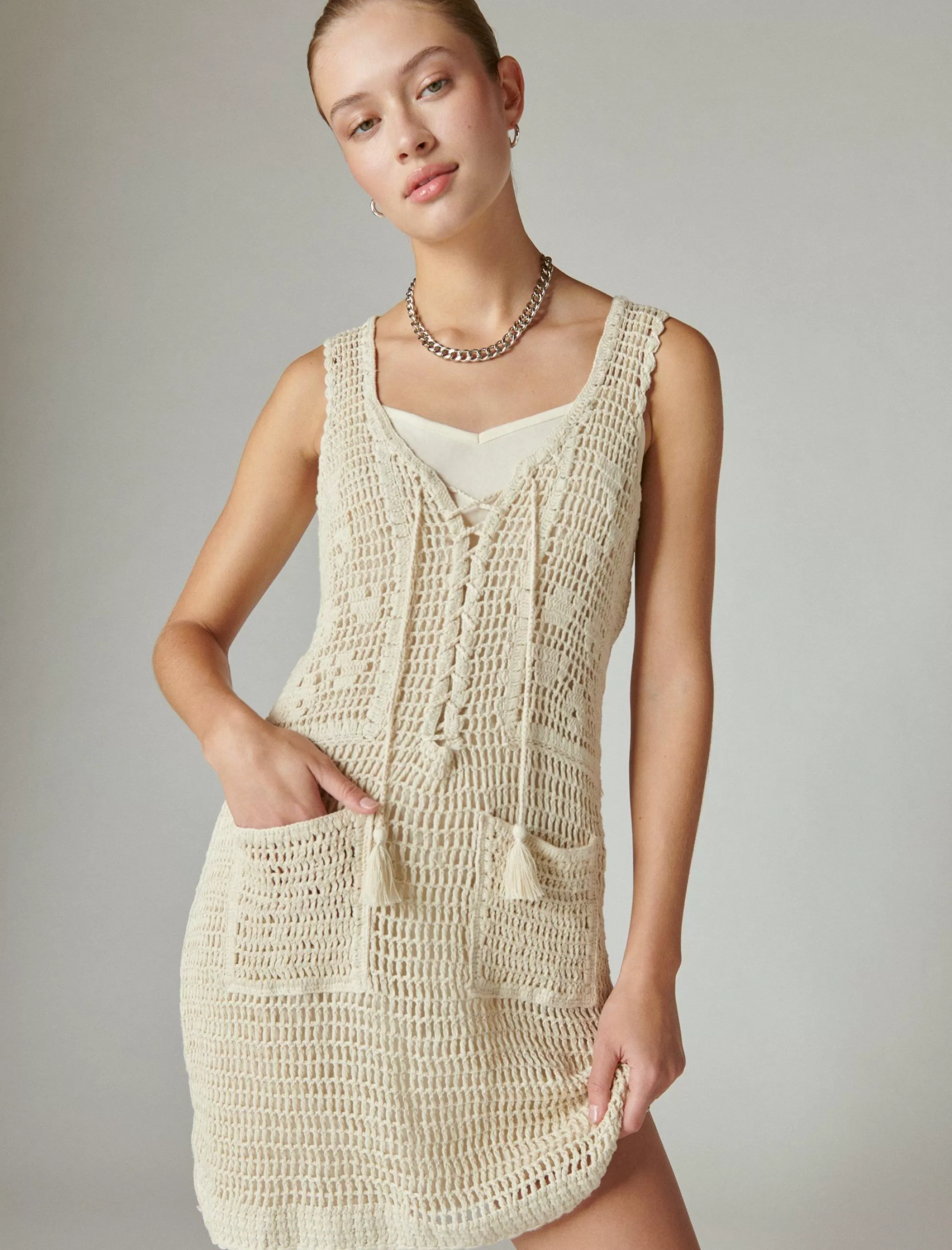 New for the season, this tunic-length dress is woven of comfy cotton crochet with a lace-up front and perfectly boho drawstring ties.