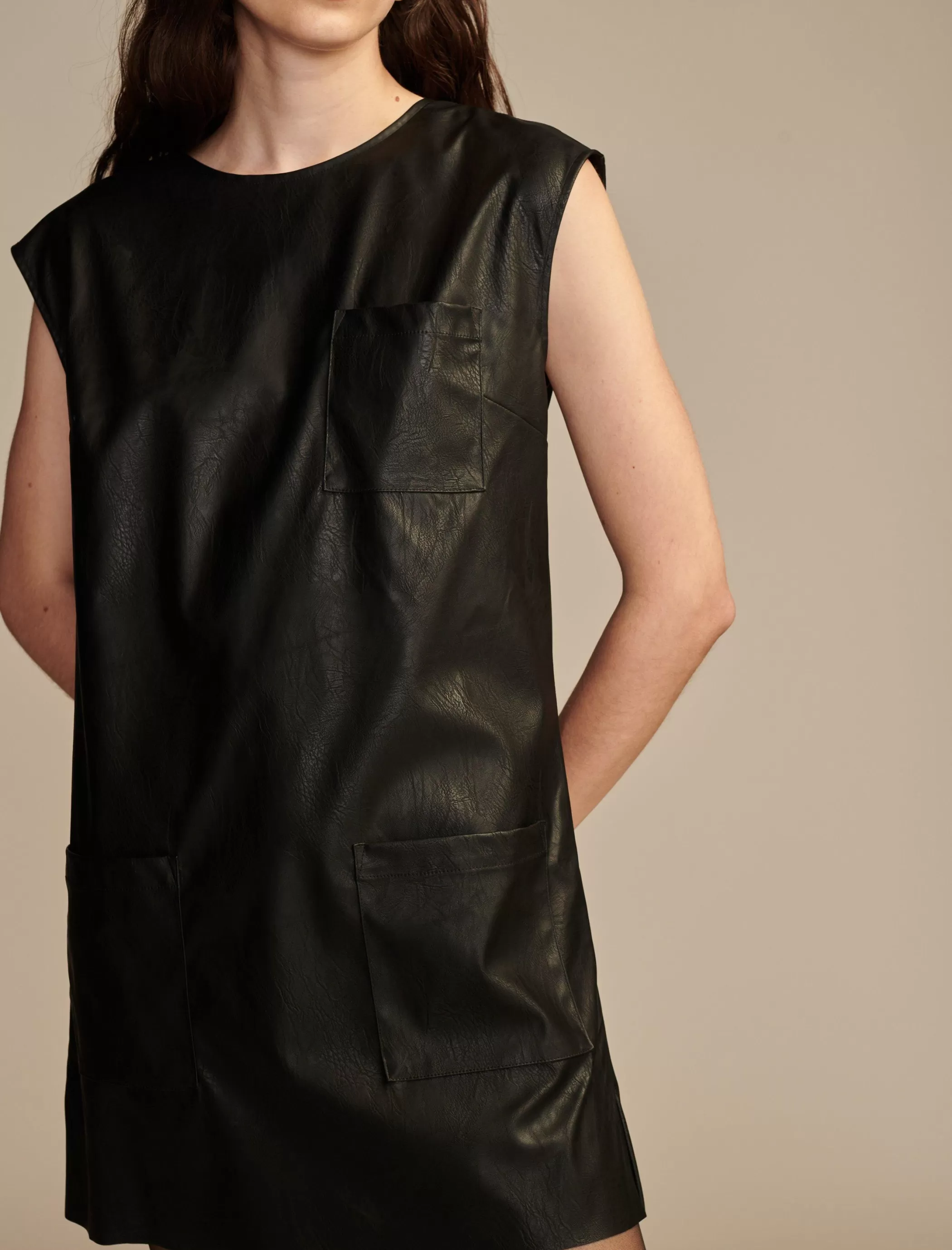 Complement your unique style with this faux leather dress featuring multiple pockets and a side-slit hem.Crew neckPatch …