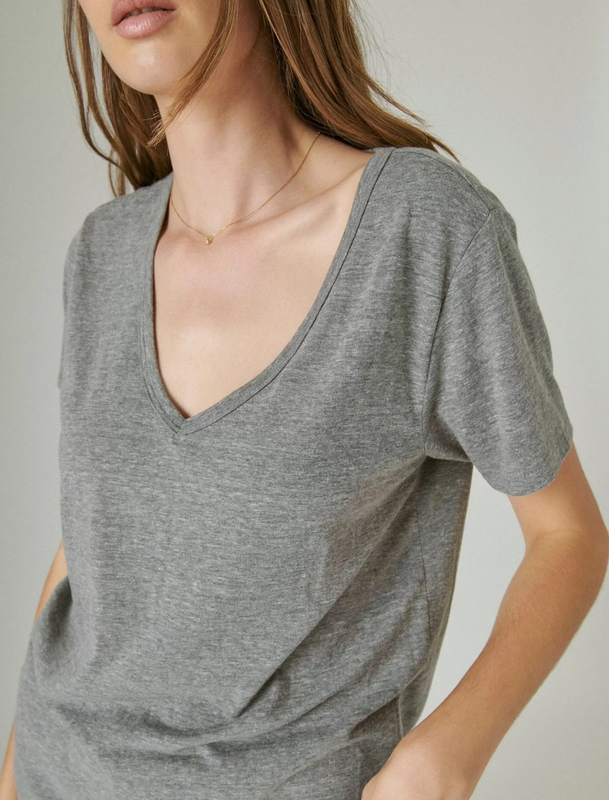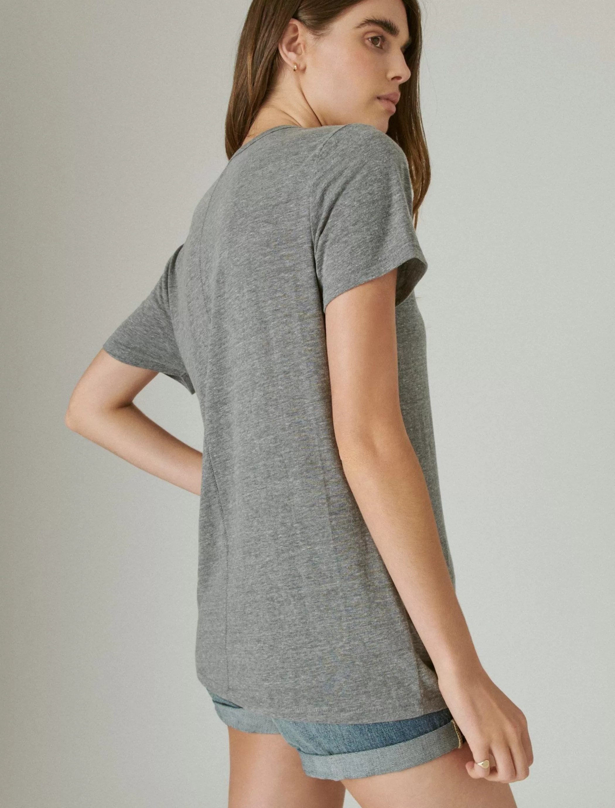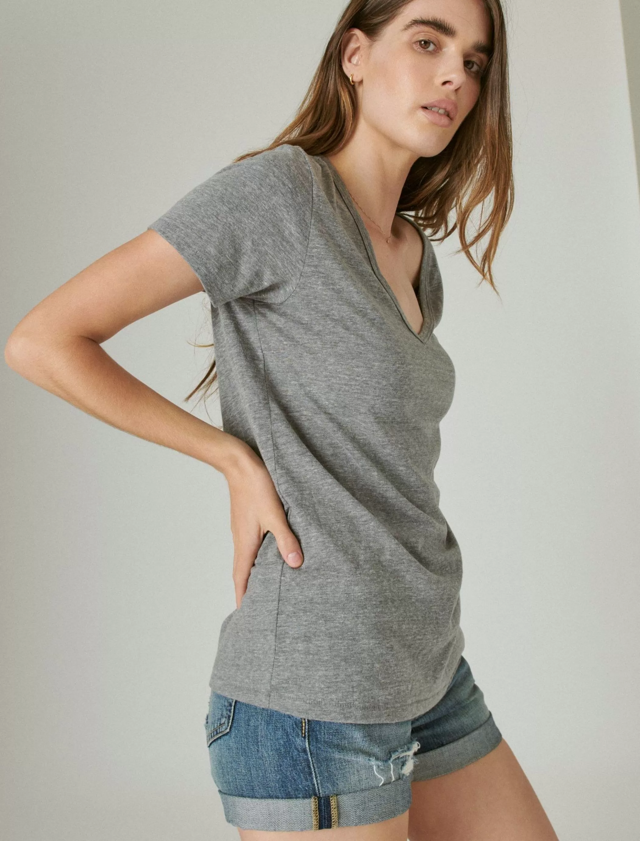 Make things simpler in this ultra-soft, all day, everyday cotton tee dressed up in gorgeous colors and a long and low V-neck. Pair with your fave Lucky denim shorts and you’ve got your any-season look.