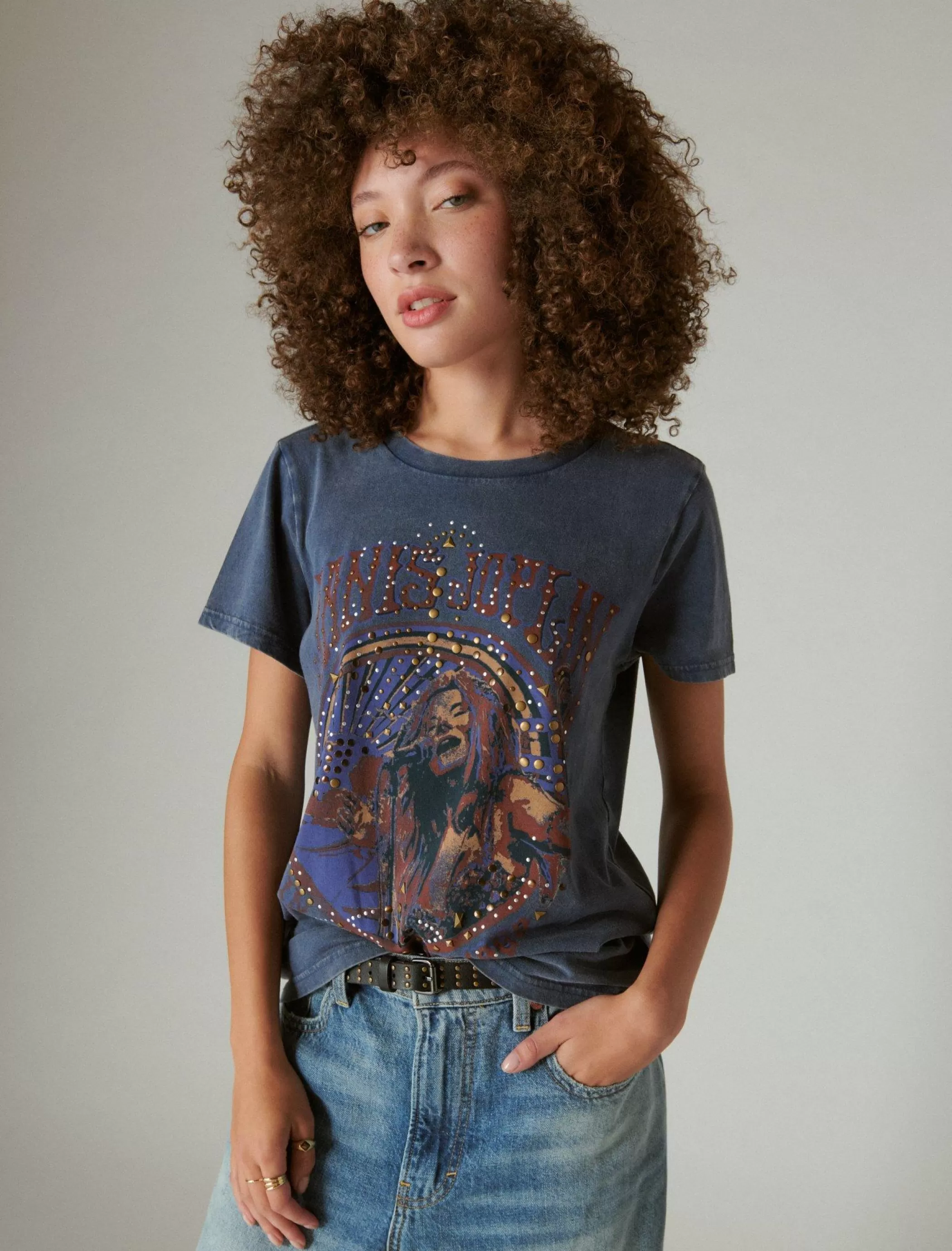 Cut for a just-right classic fit, this crewneck tee is made from soft 100% cotton and shows off a so stunning Janis Joplin graphic with gold- and silver-tone studded details.