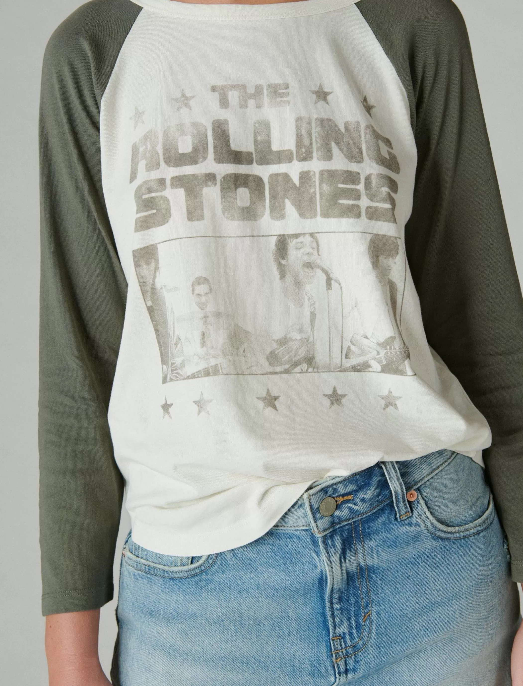 Rock looks good on you. From the limited edition The Rolling Stones x Lucky Brand collab, this raglan sleeve tee features archive tour graphics at the front and back in super soft, washed-and-worn cotton jersey fabric.