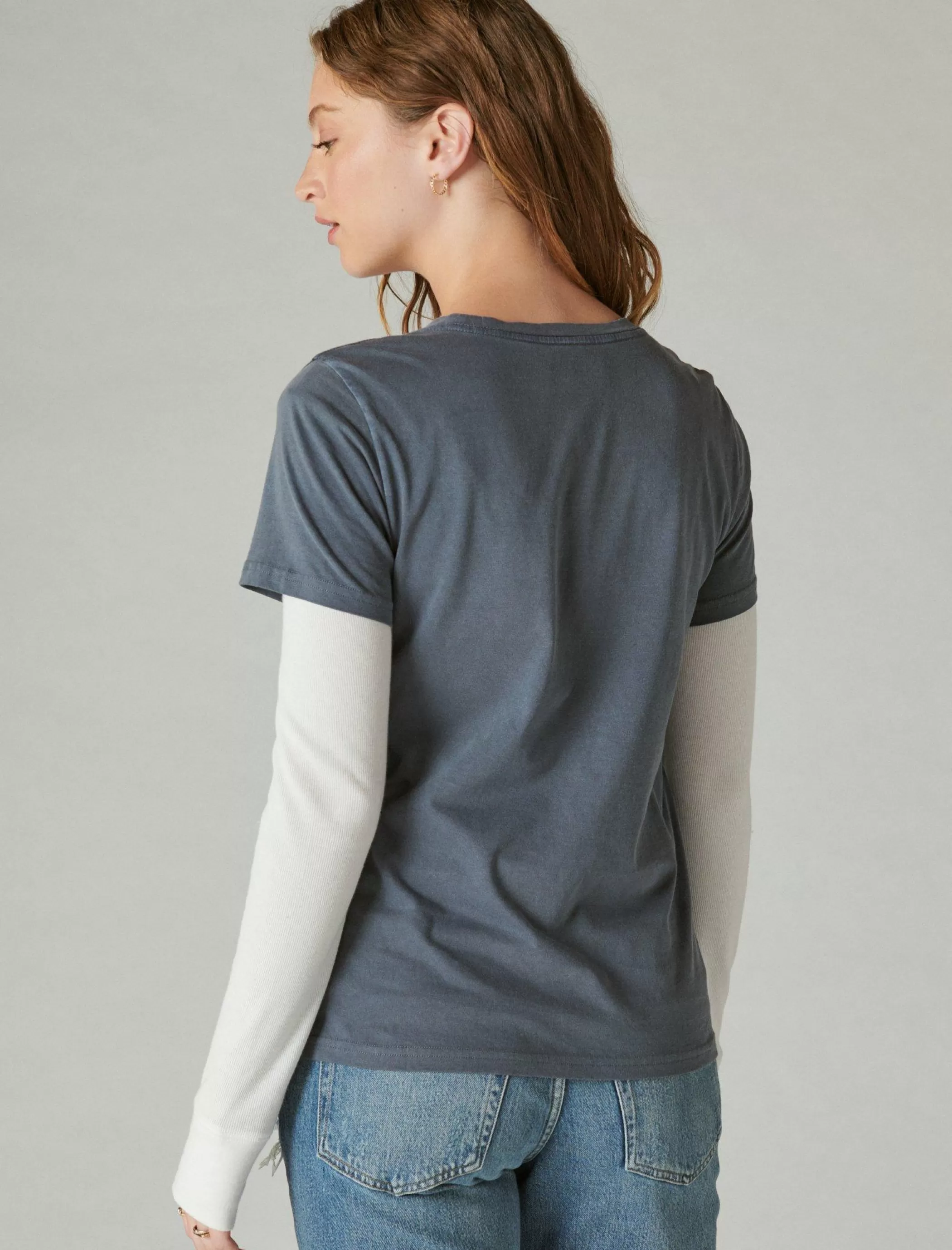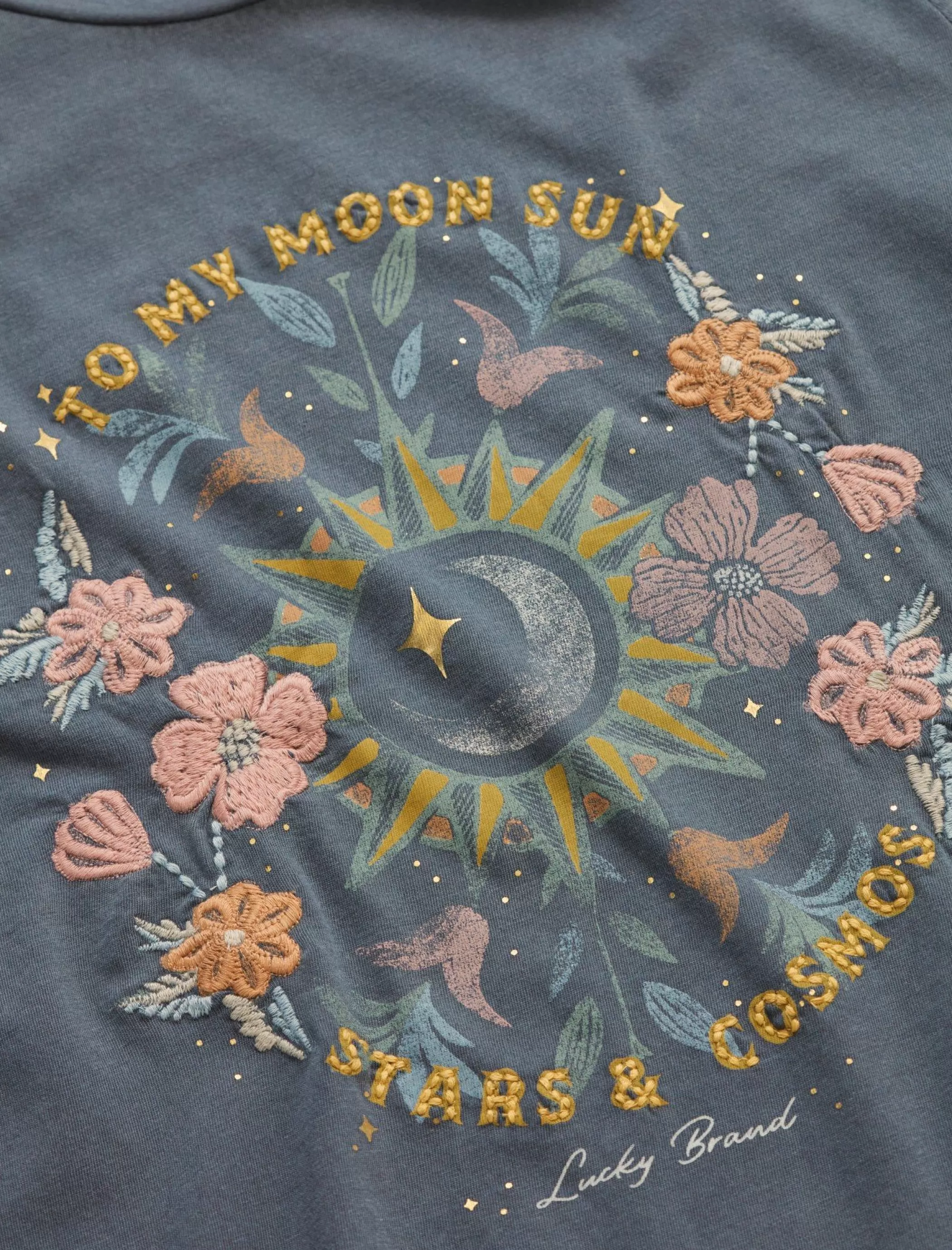 Channeling the cosmos never looked cuter. Cut for a just-right classic fit, this crewneck tee has a large sun and moon graphic with pretty embroidered floral details that pop.