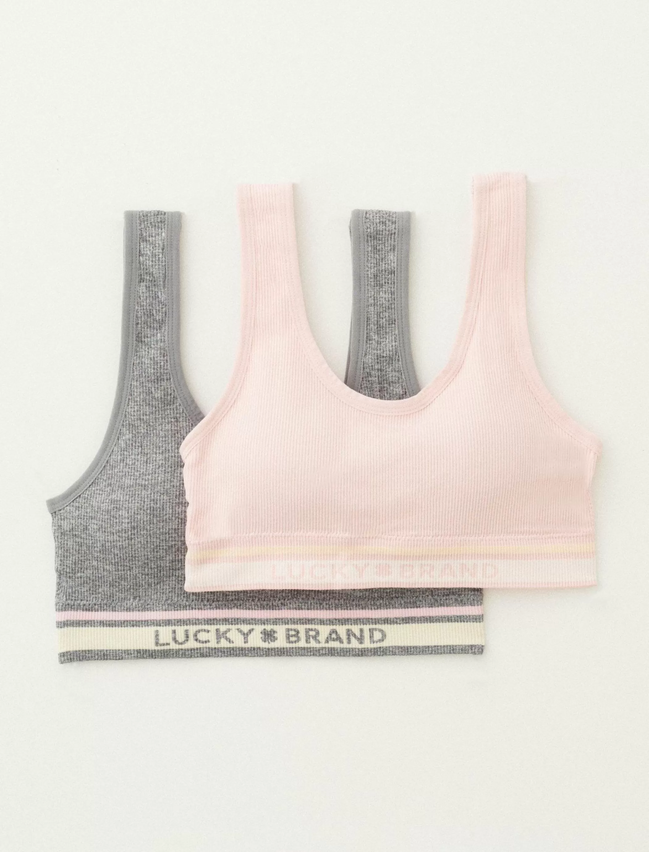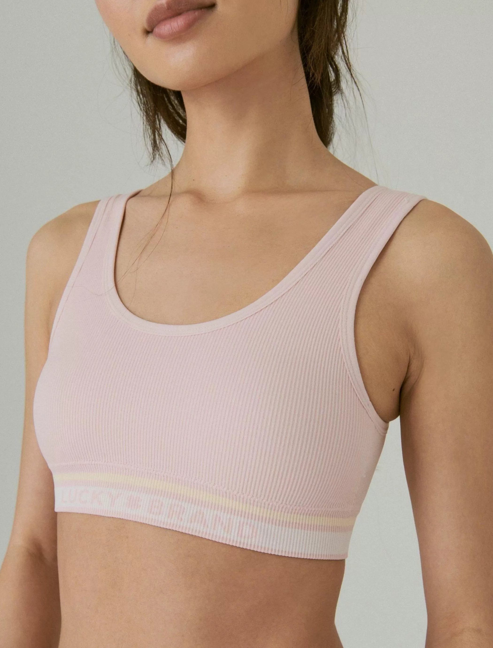 Seamless and soft, this ribbed knit bra features a scoop neck design with wide straps and a Lucky Brand graphic at the band.