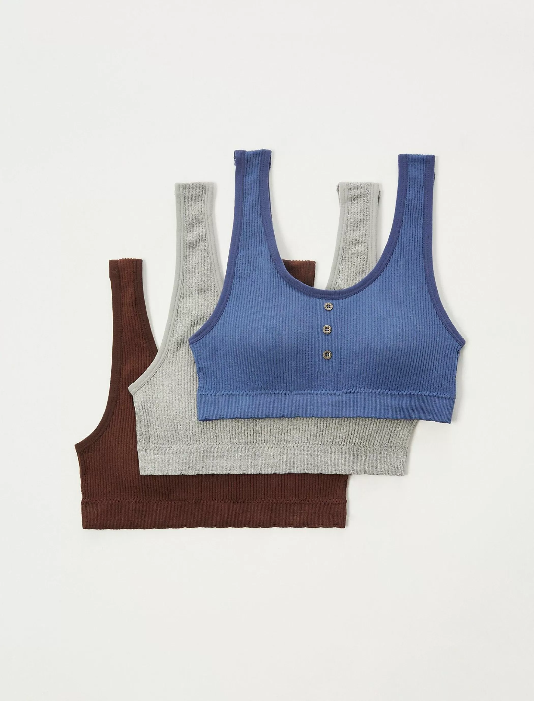 Make your first layer count with these 3-pack ribbed bras made of a feel-good cotton-blend and featuring logo-embossed buttons at the chest for a flirty look.