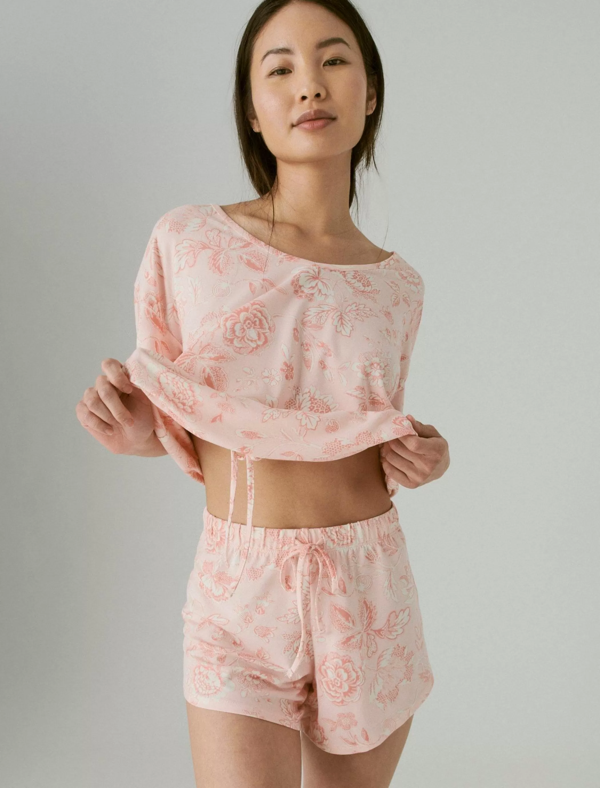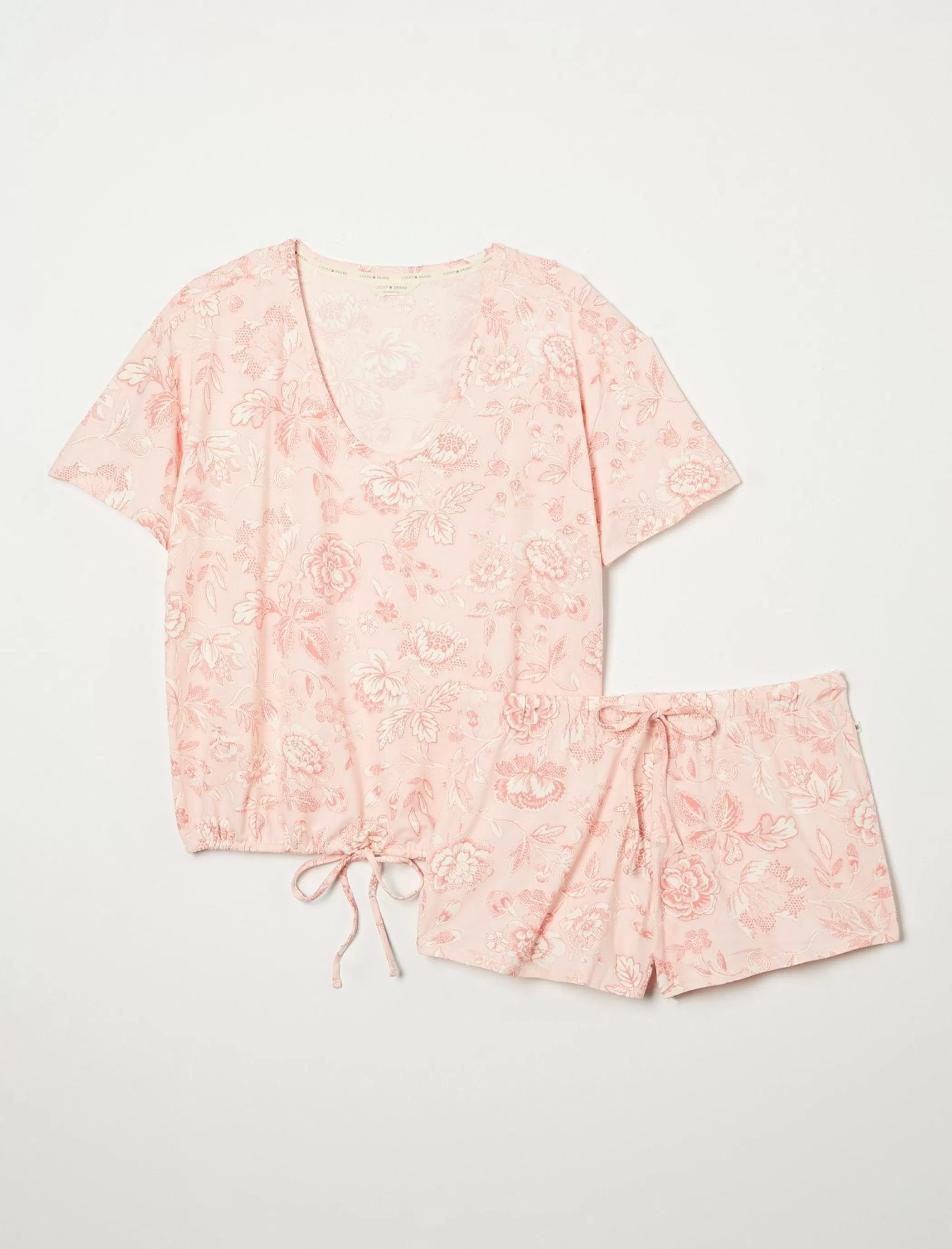 Catch some ZZZs with this 2-piece sleep set featured in so-soft stretch-knit with a top that cinches at the elastic-drawstring waist and coordinating printed drawstring shorts.