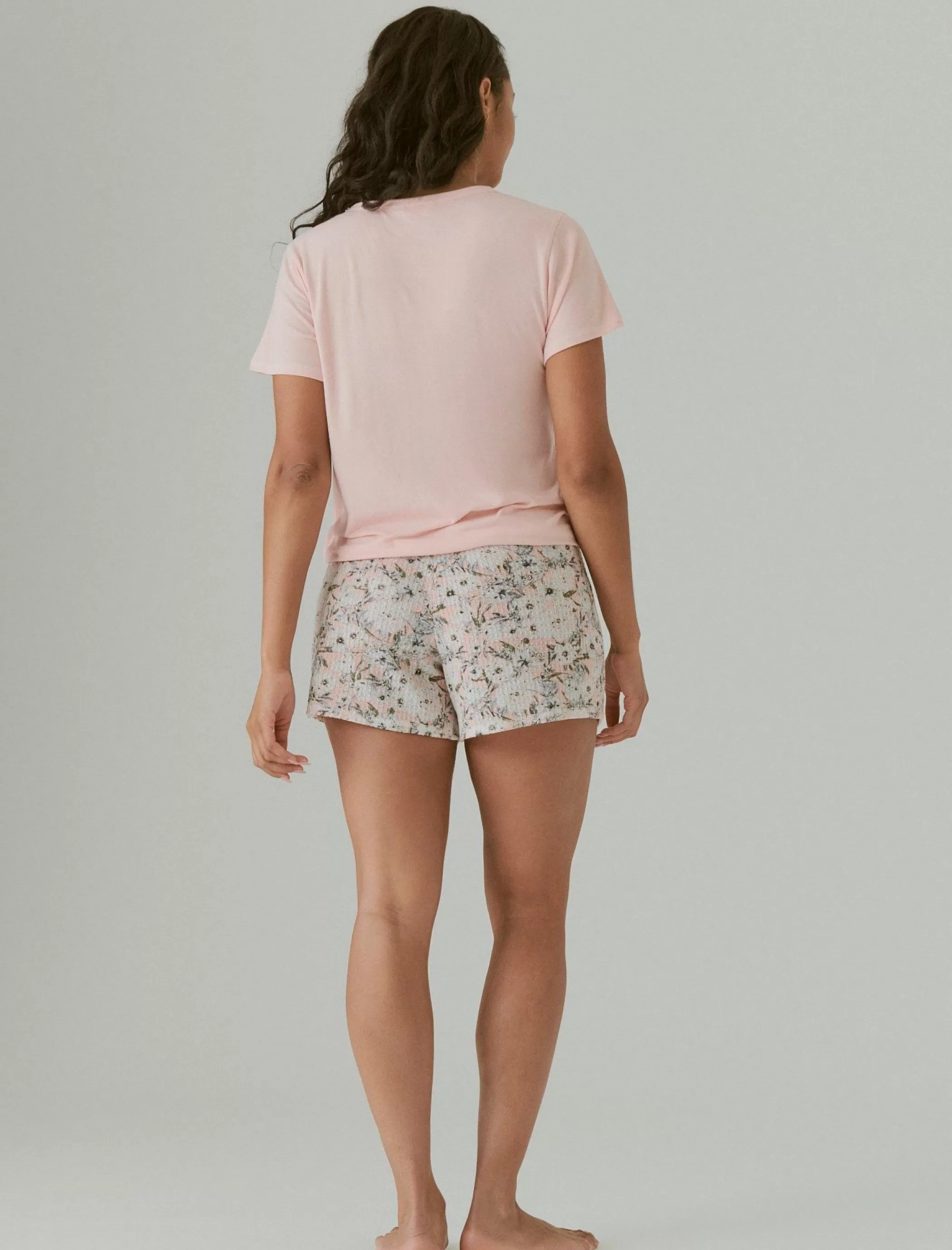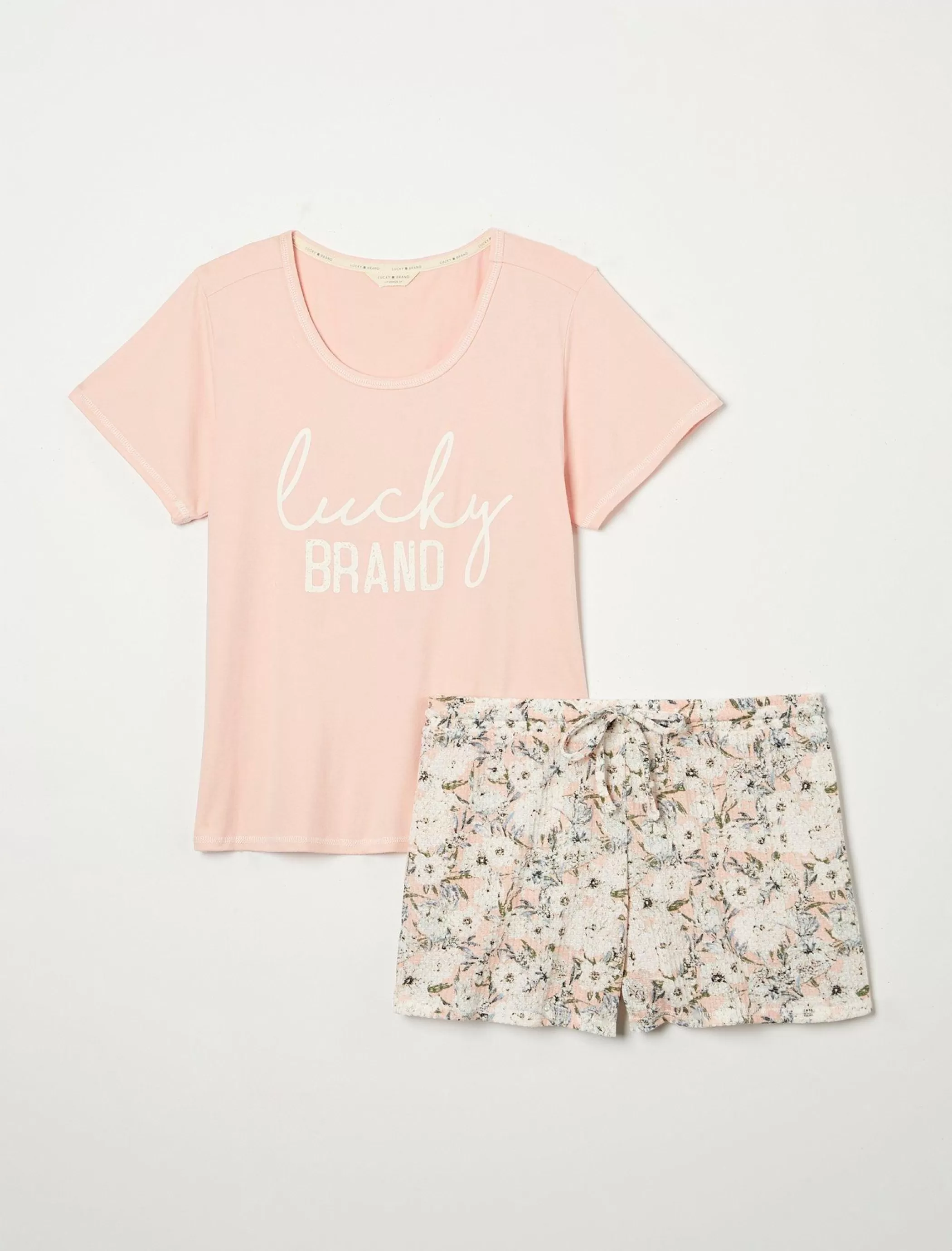 Cuddle up or lounge out at home with this ultra-soft 2-piece sleep set featuring a classic scoop neck graphic tee and coordinating printed pair of shorts in a cozy waffle pattern for added texture.