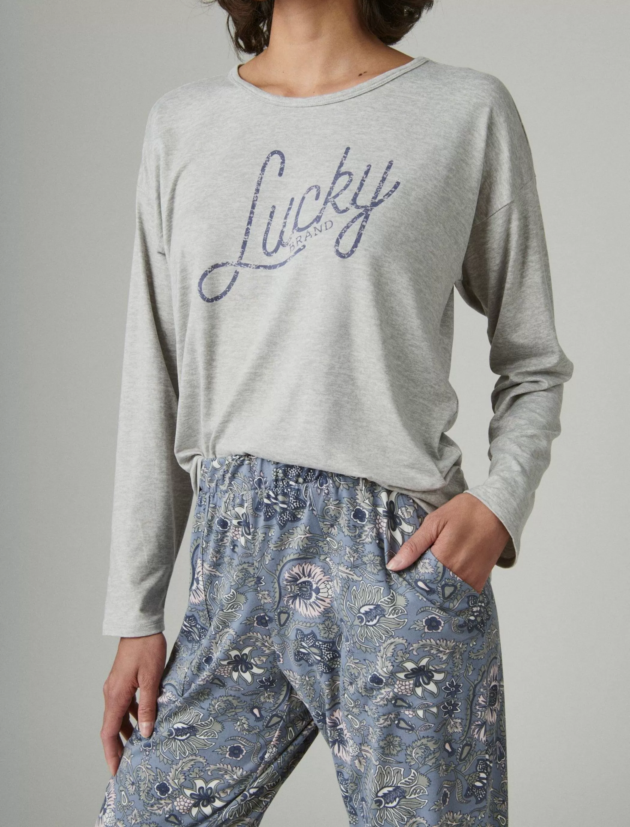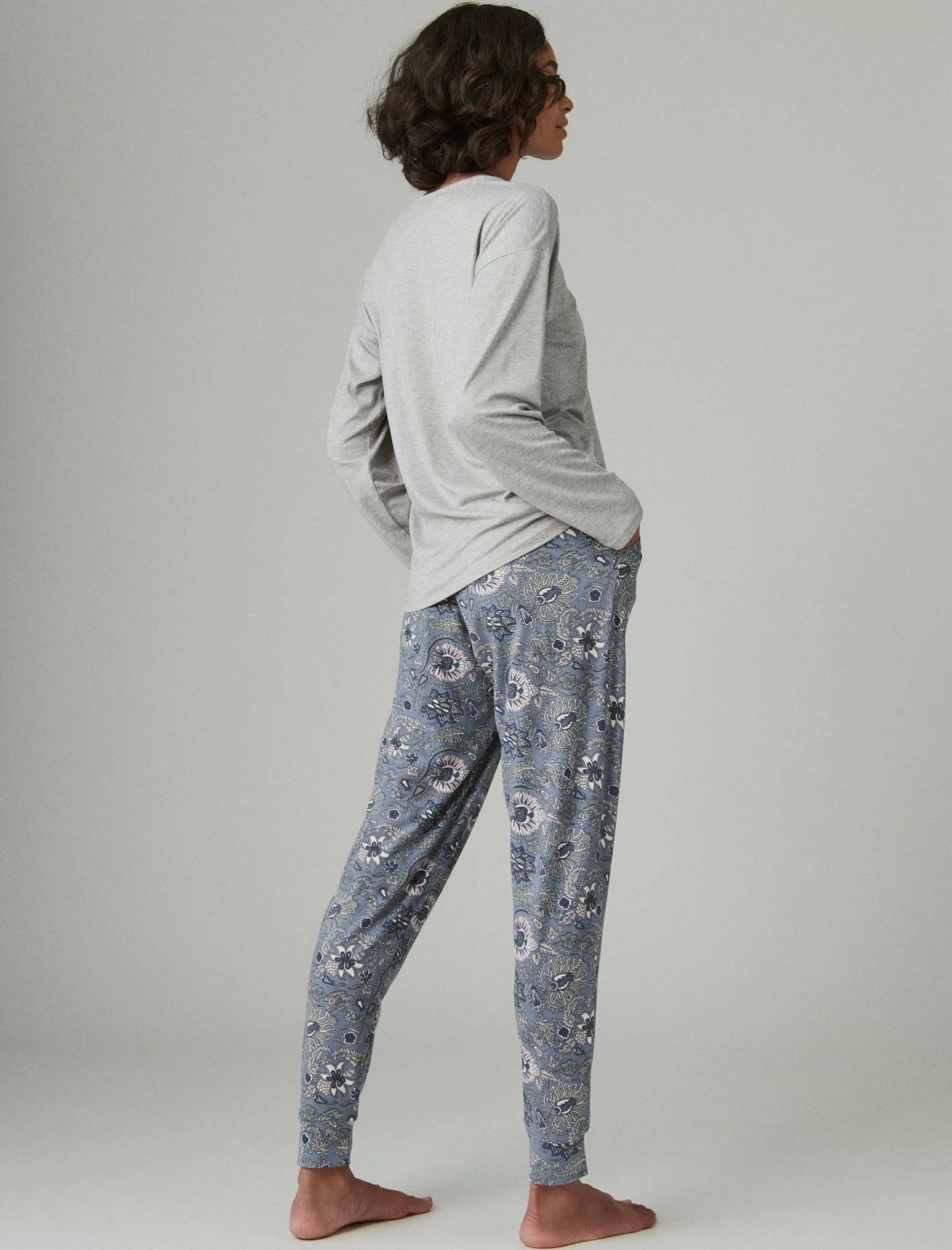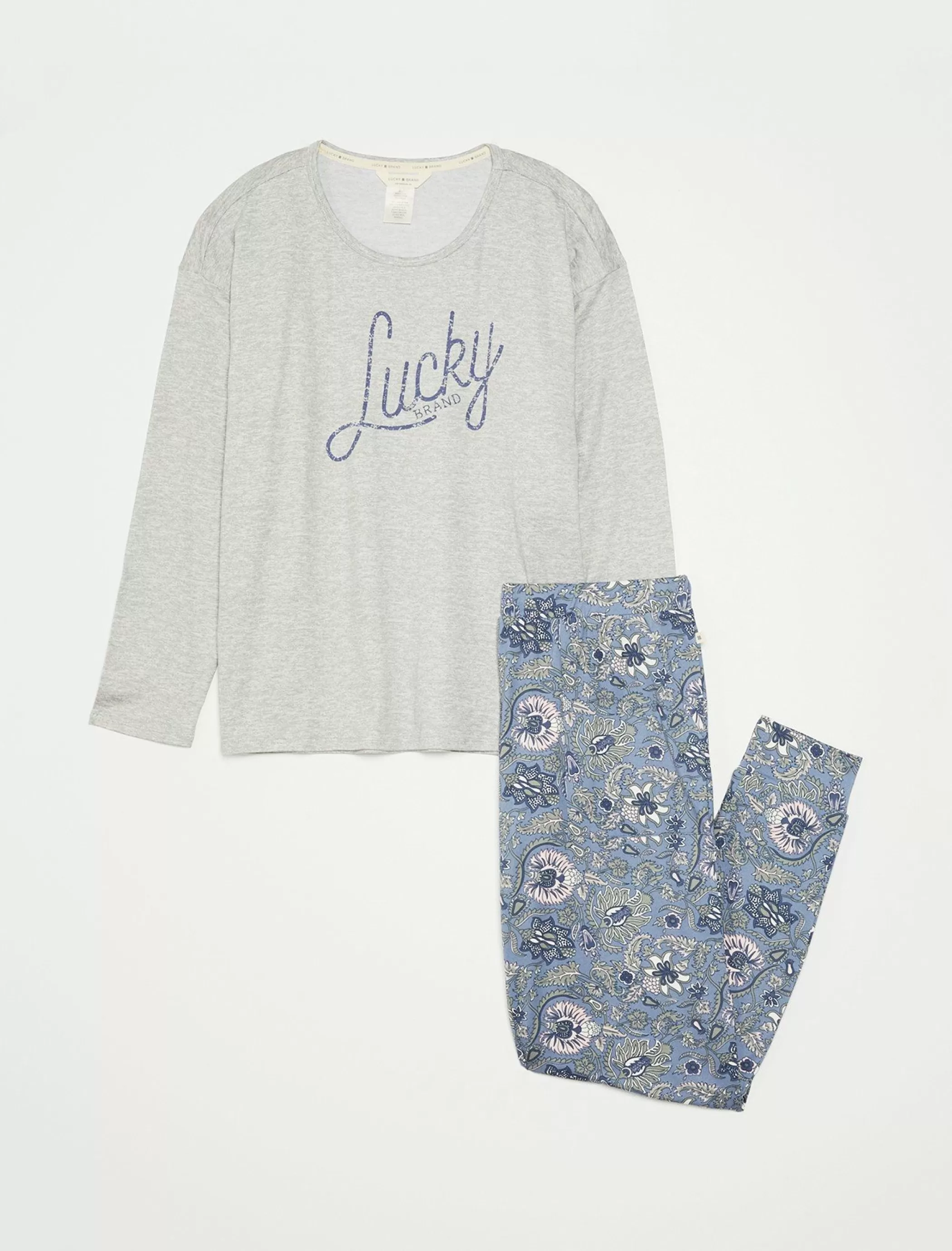 Cozy up to this 2-piece sleep set featuring a scoop-neck top with a script-style glitter logo and matching printed jogger pant made from soft cotton-knit.
