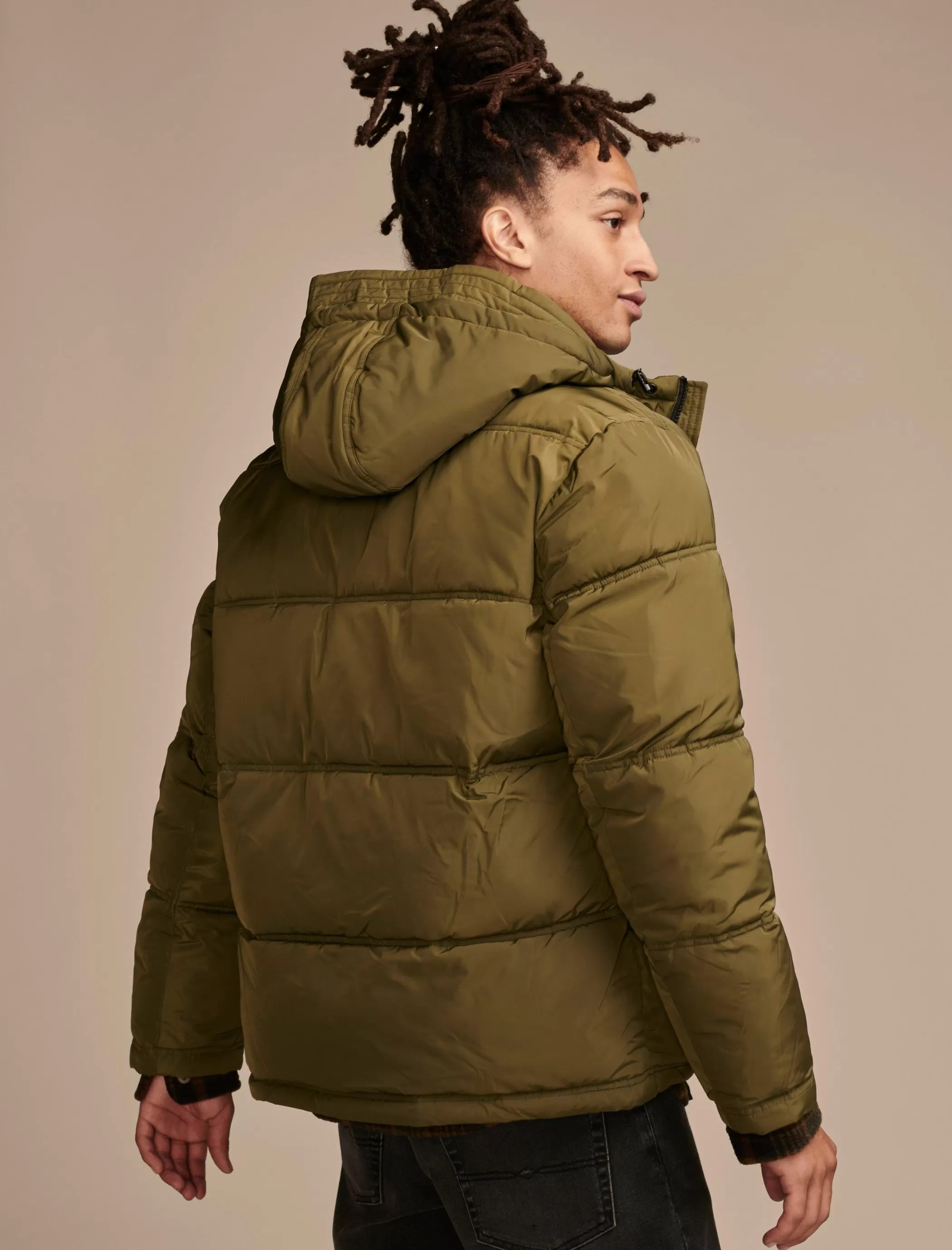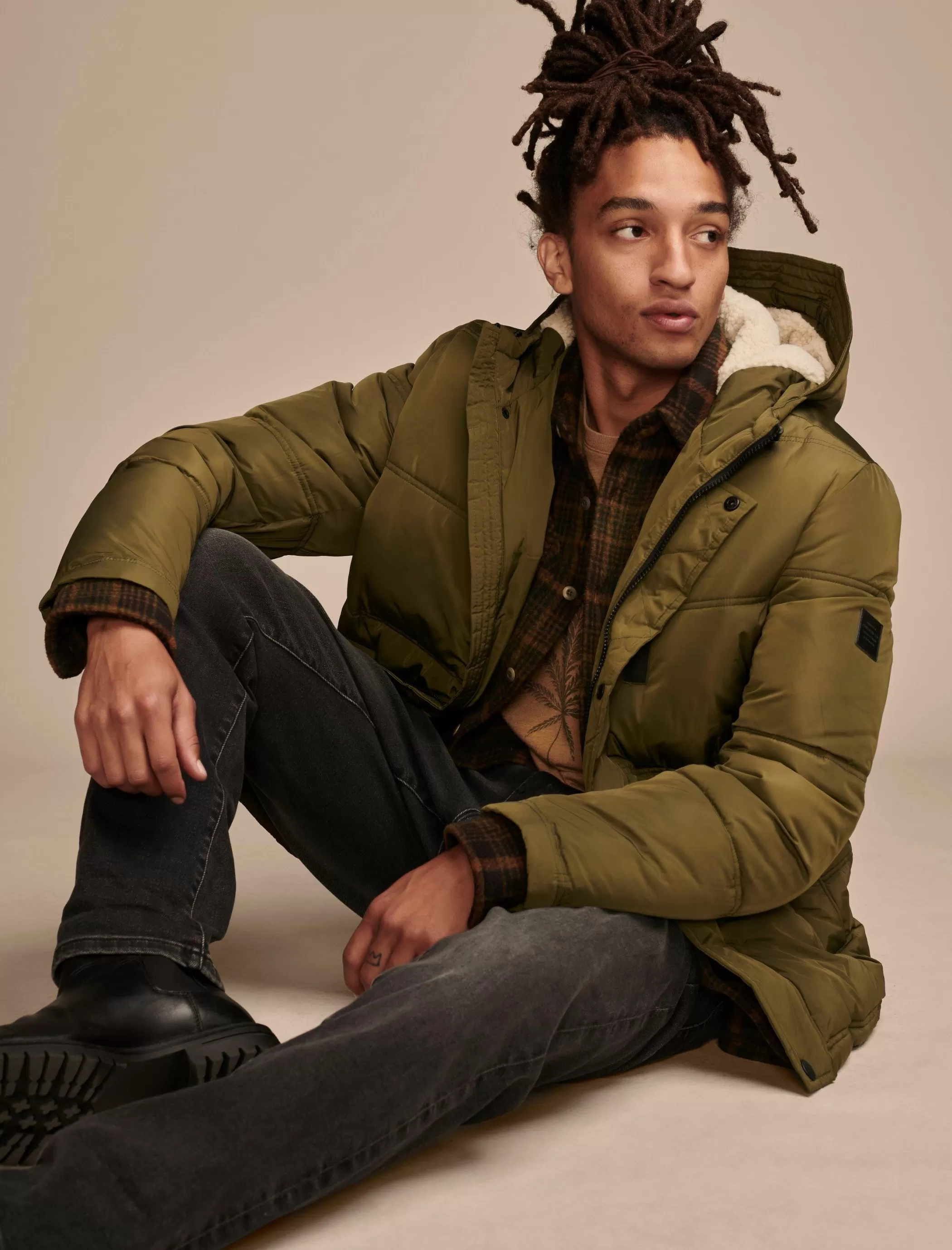 No cool-weather wardrobe is complete without a puffer. Featuring a faux shearling lined hood, this puffer jacket has a button-and-zip front and side pockets for your on-the-go essentials.