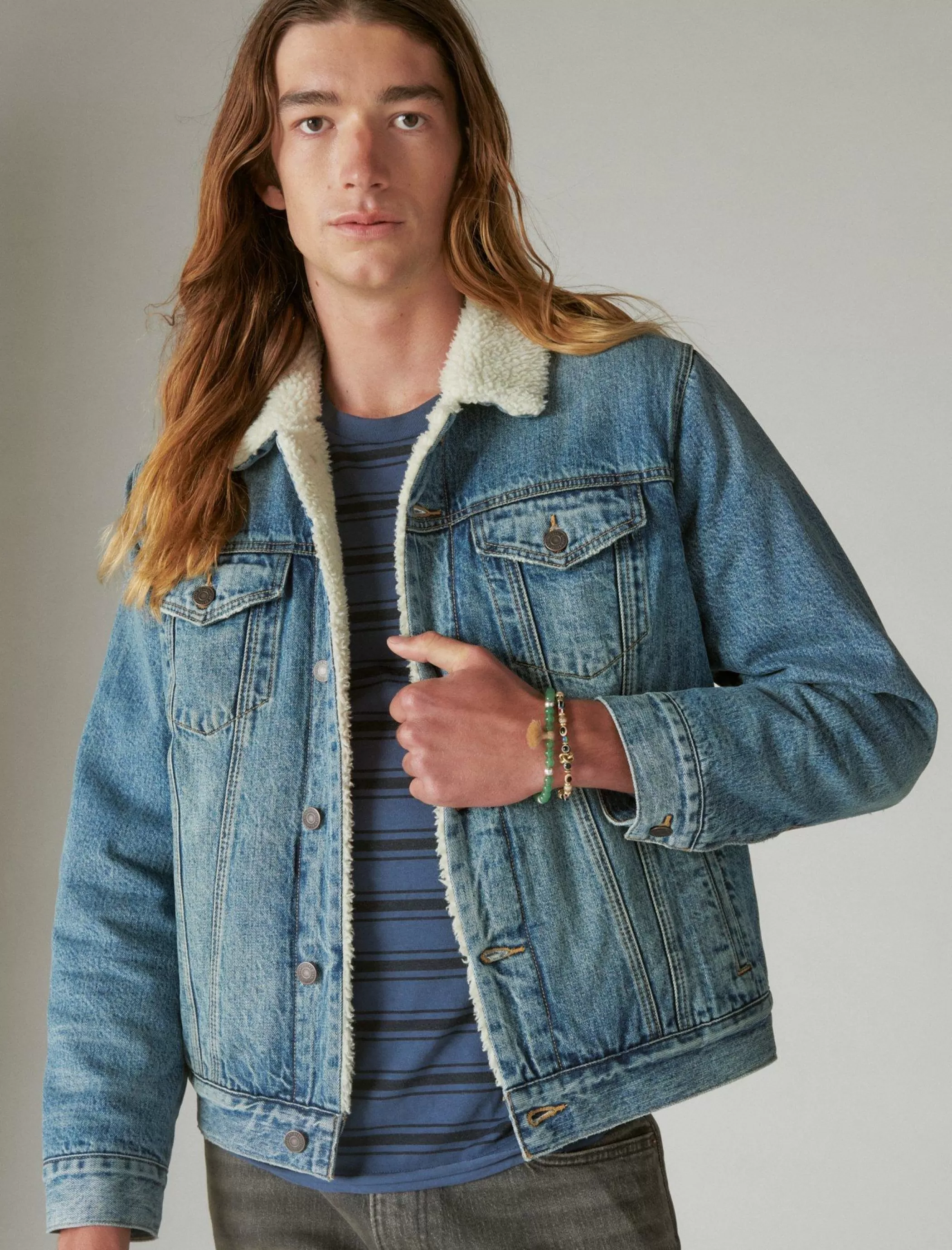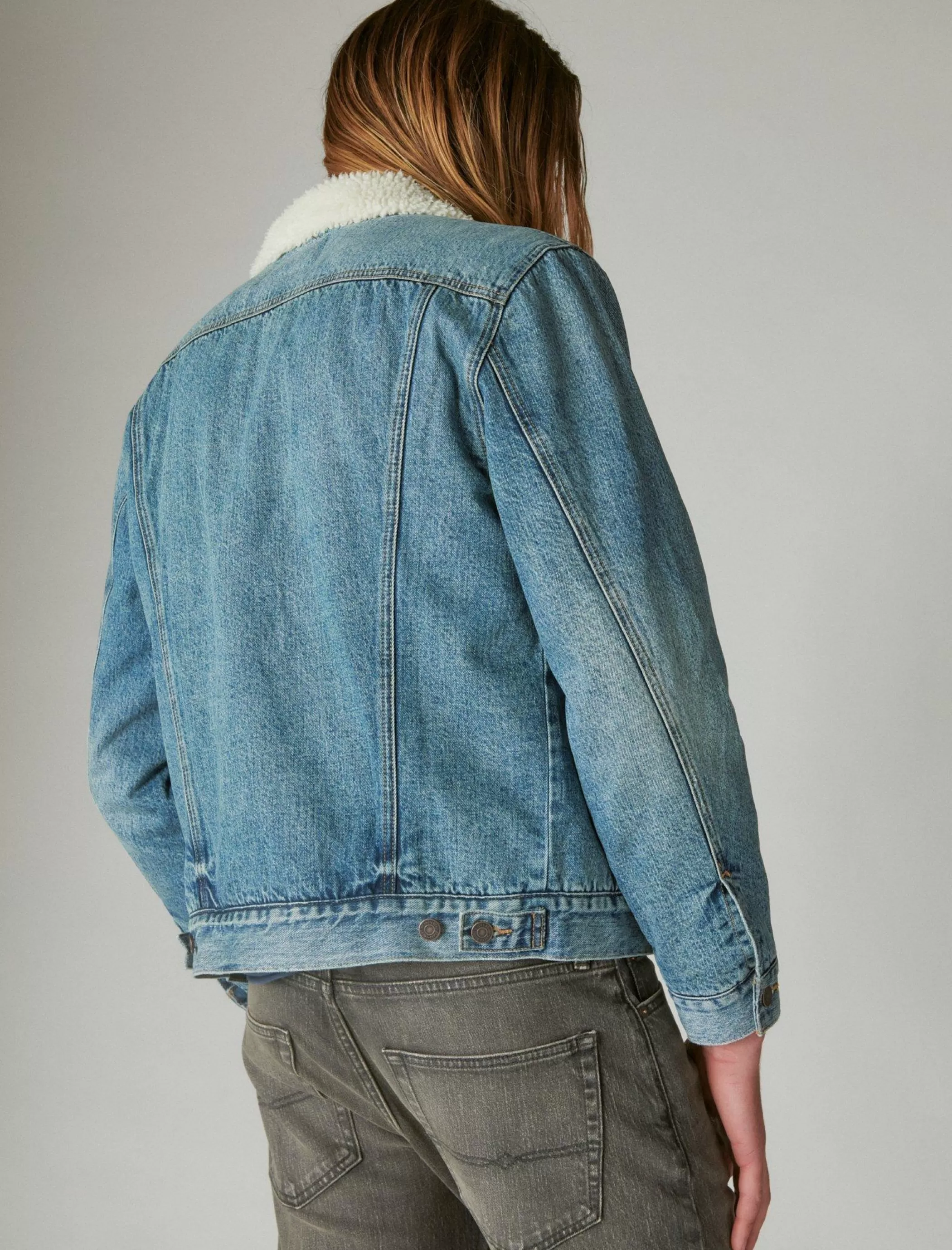 Our signature denim trucker is designed with a tailored, cropped cut that ends at the waist for an iconic fit that goes with everything. Featured in a timeless medium blue wash, this jacket is lined with faux shearling for an added touch of warmth perfect during the cool-weather season.