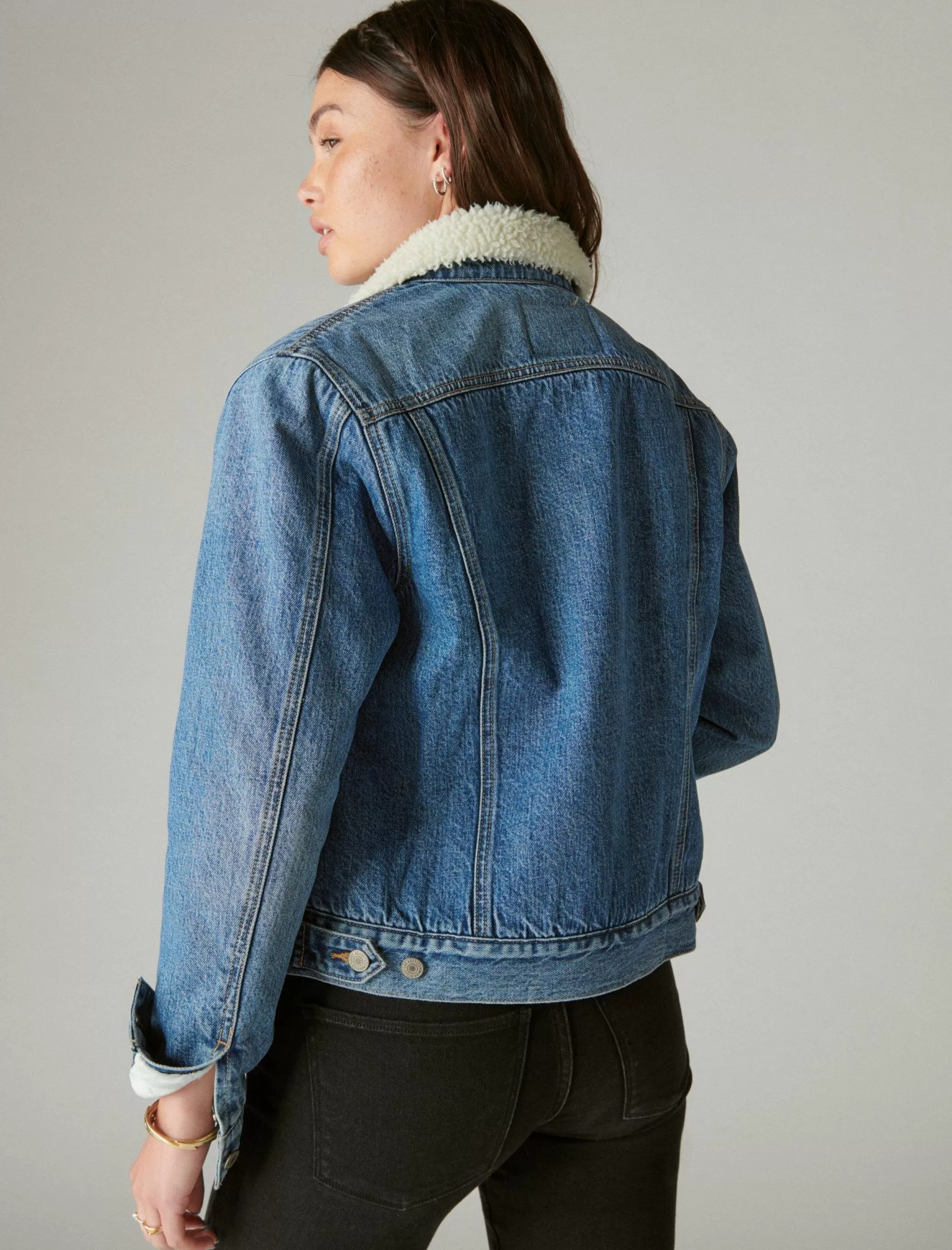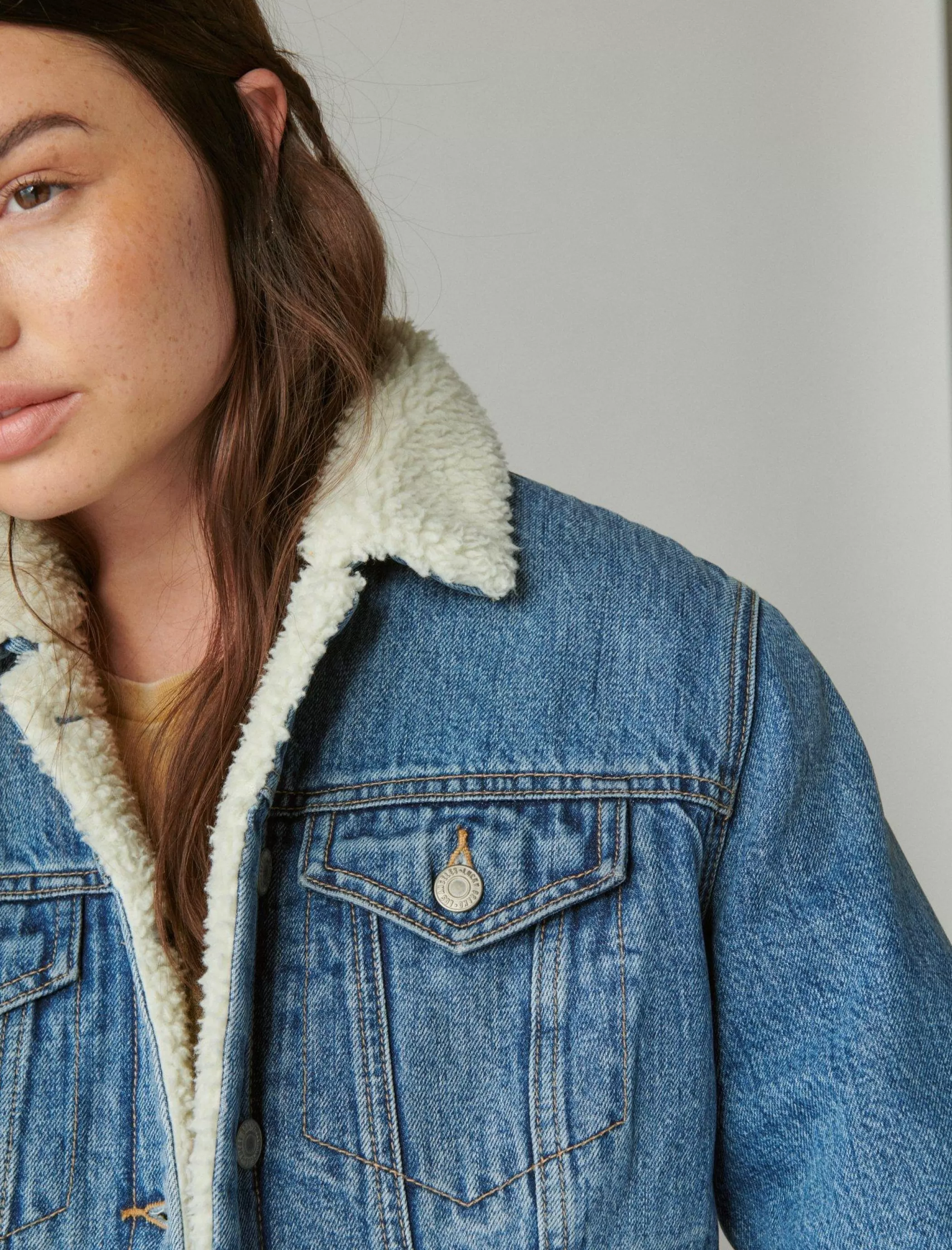 Featured in a classic trucker-inspired silhouette, this denim jacket is one you’ll reach for time and time again. The medium wash and cozy faux shearling lining make it a must-have for your all your cool-weather ‘fits.
