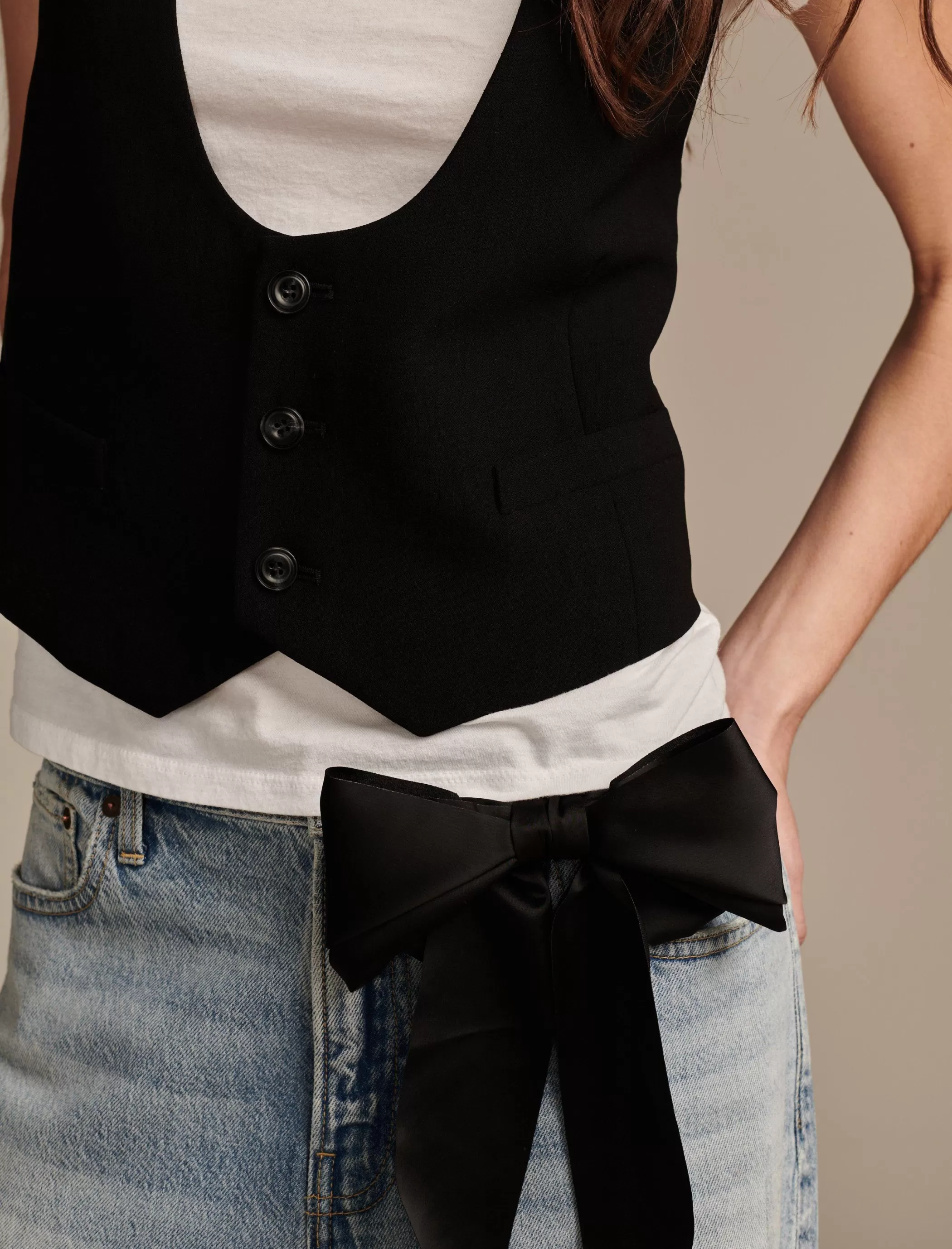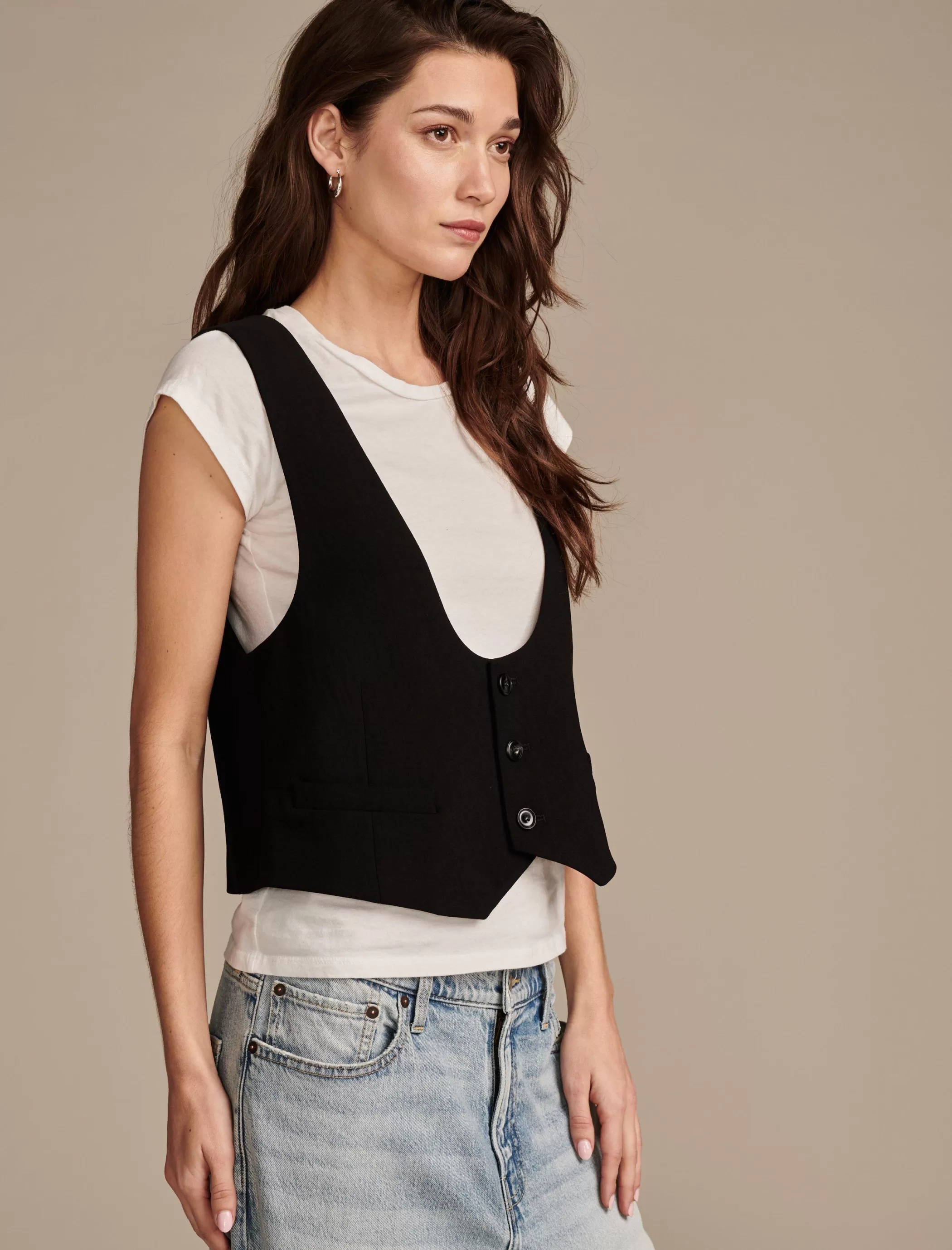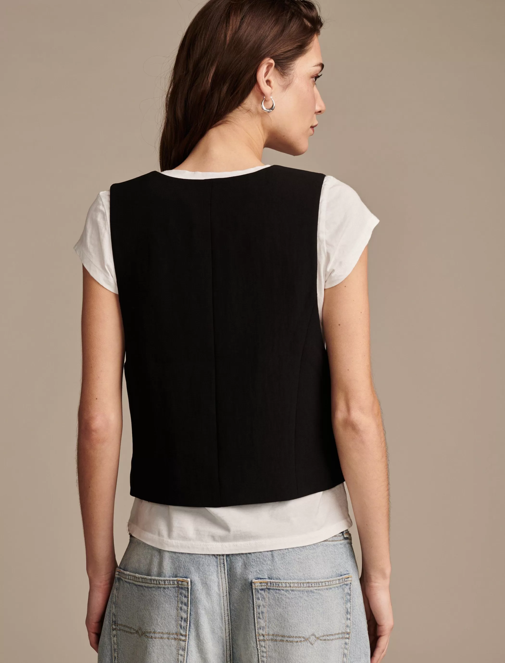 This longline vest highlights your unique style thanks to its dropped bodice, three-button front and pointed hem.