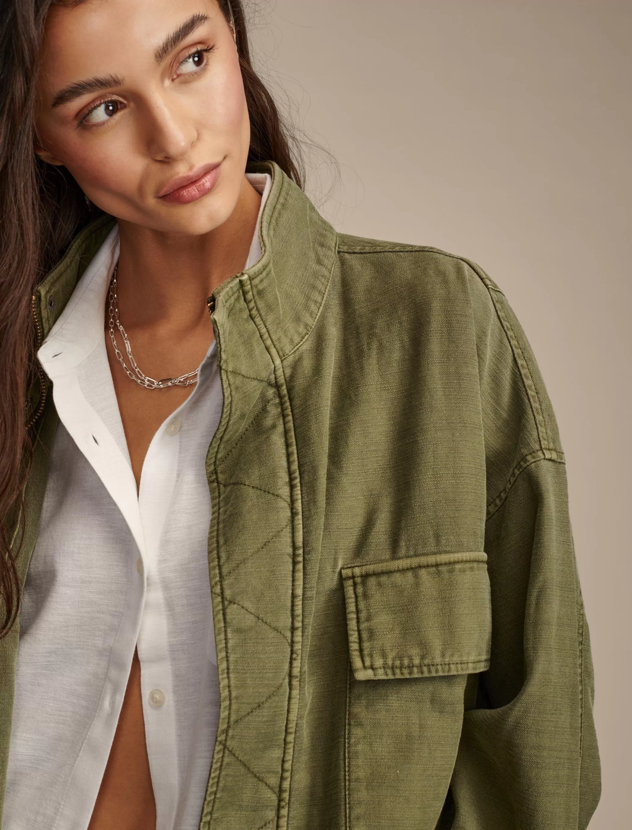 Meet our cropped trench jacket, AKA your new favorite wear-everywhere layer. Cut from TENCEL™ fabric, a naturally soft and lightweight fiber made from the wood pulp of trees sourced from responsibly managed forests, this jacket features classic utility styling like a dual button-and-zip front, drawcord hem and double flap pockets for your on-the-go essentials.