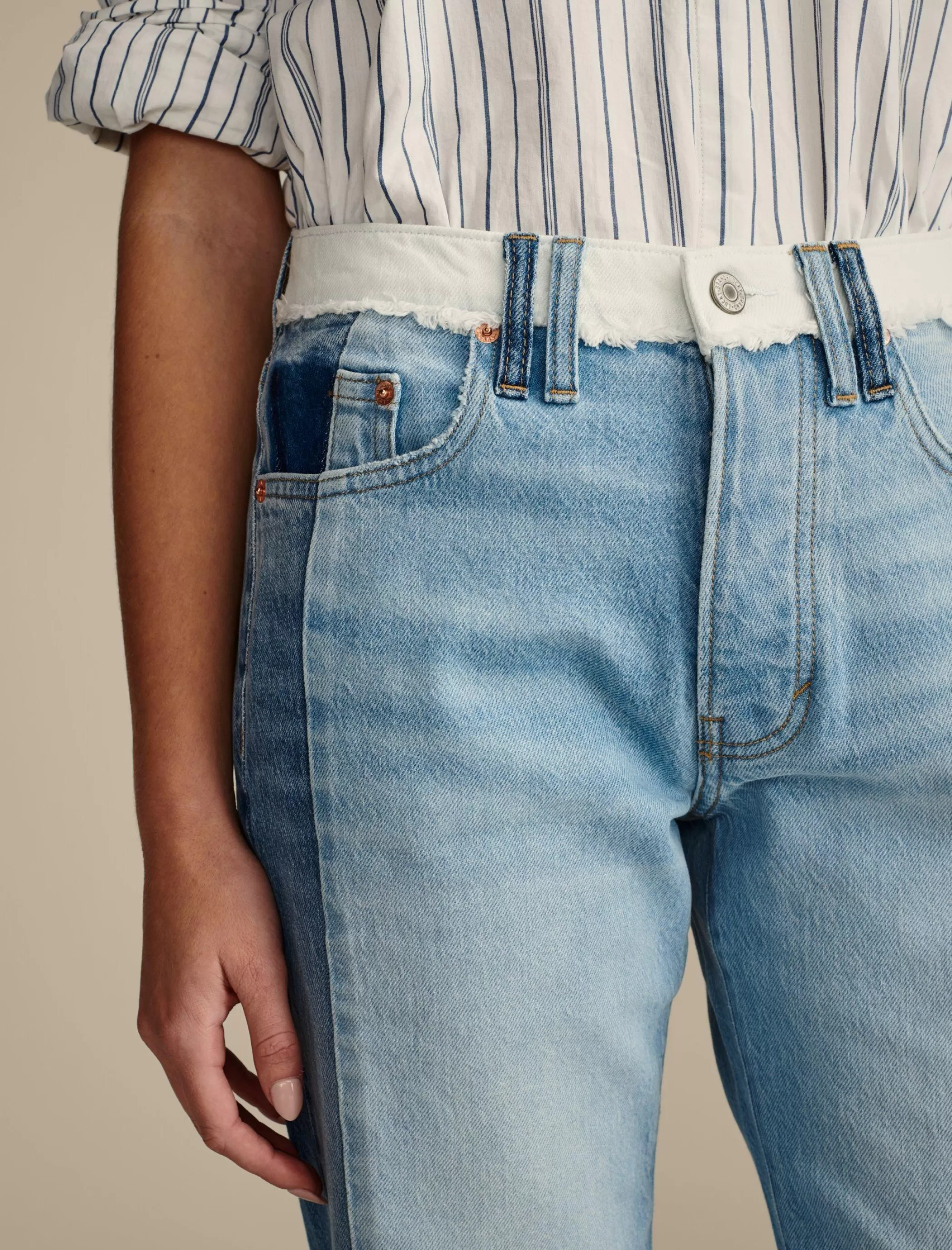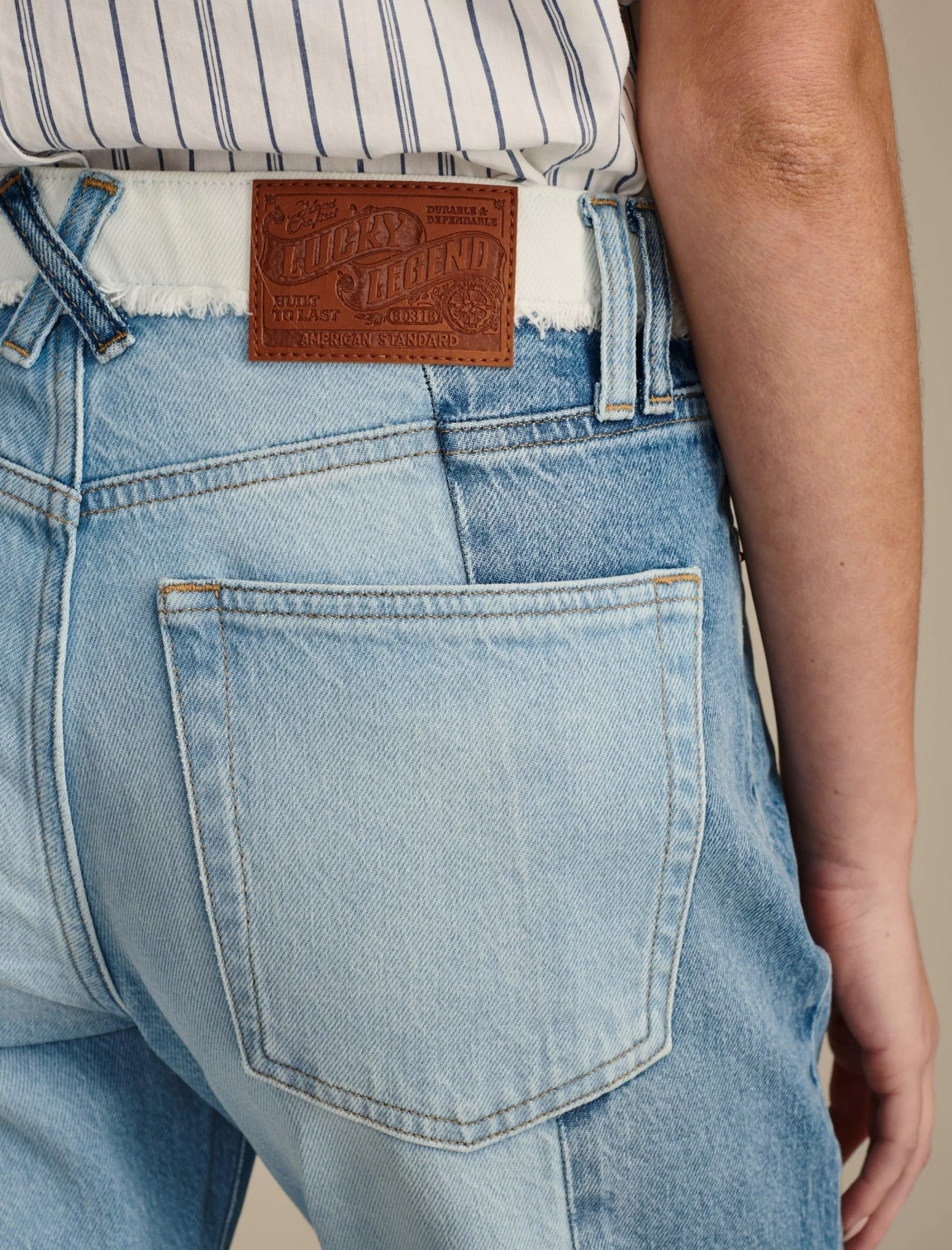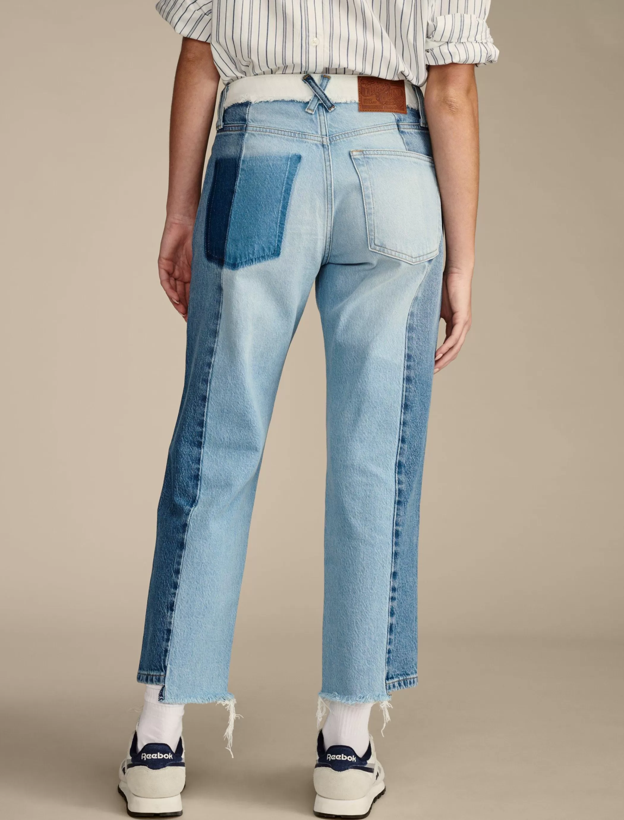 A modern update to a classic fit, the 90s Loose Crop is straight from knee to ankle with a cropped leg and easy high rise. From our limited edition Lucky Legend collection, this pair is updated with a rad pieced denim design and raw edge frayed cuffs.