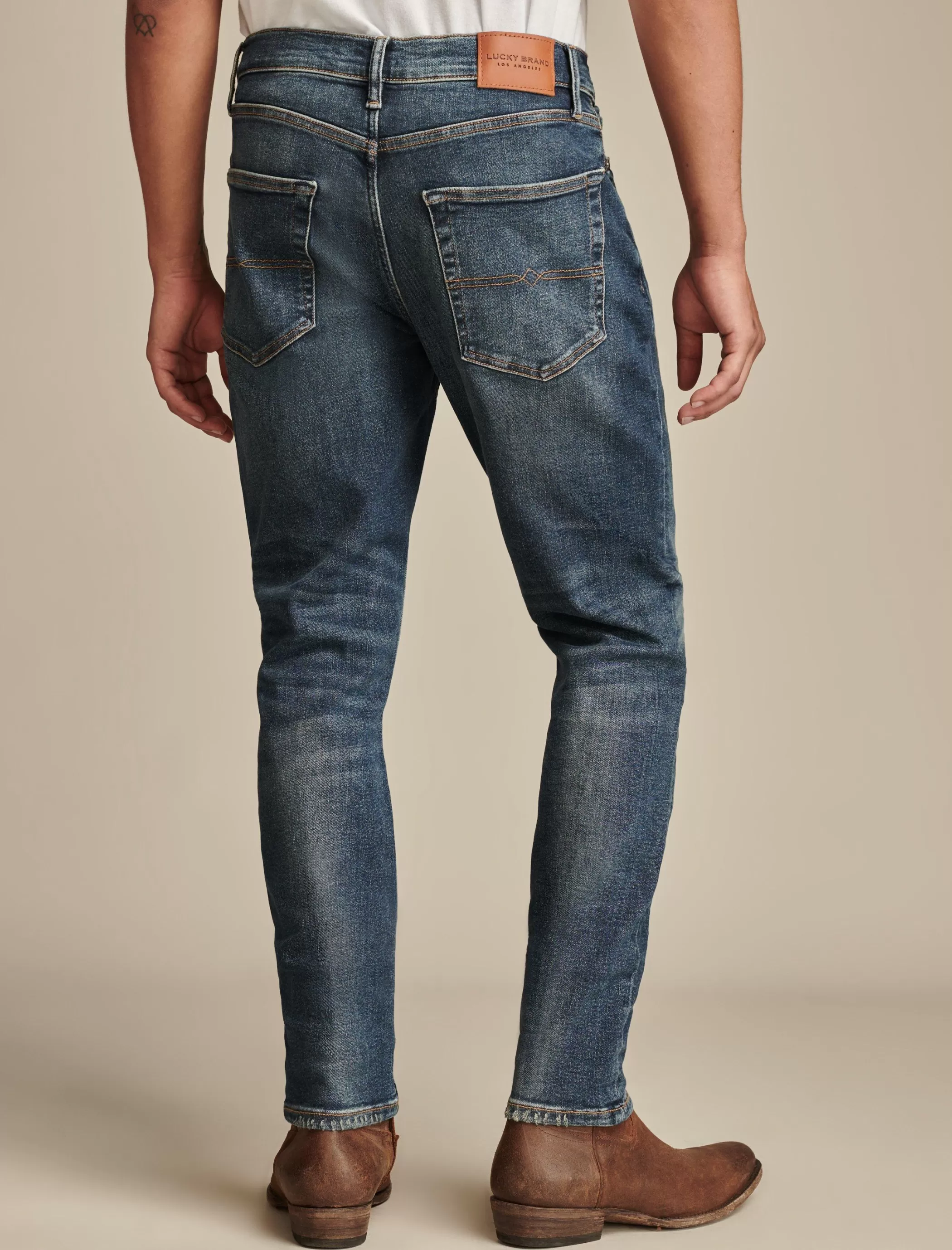 - Mid rise with a straight fit and tapered leg