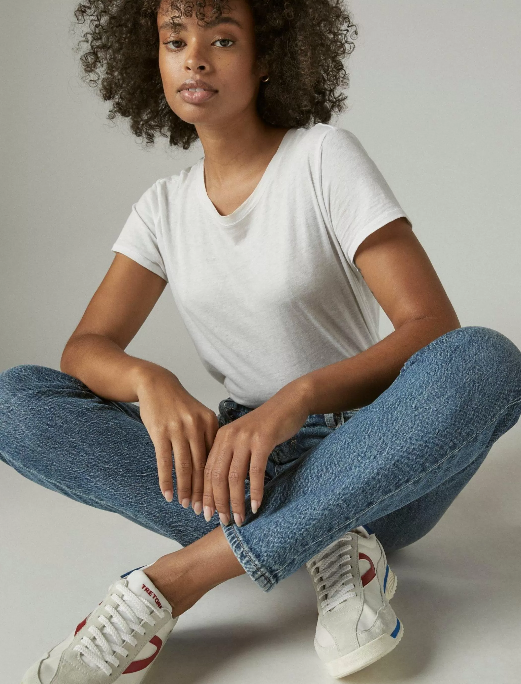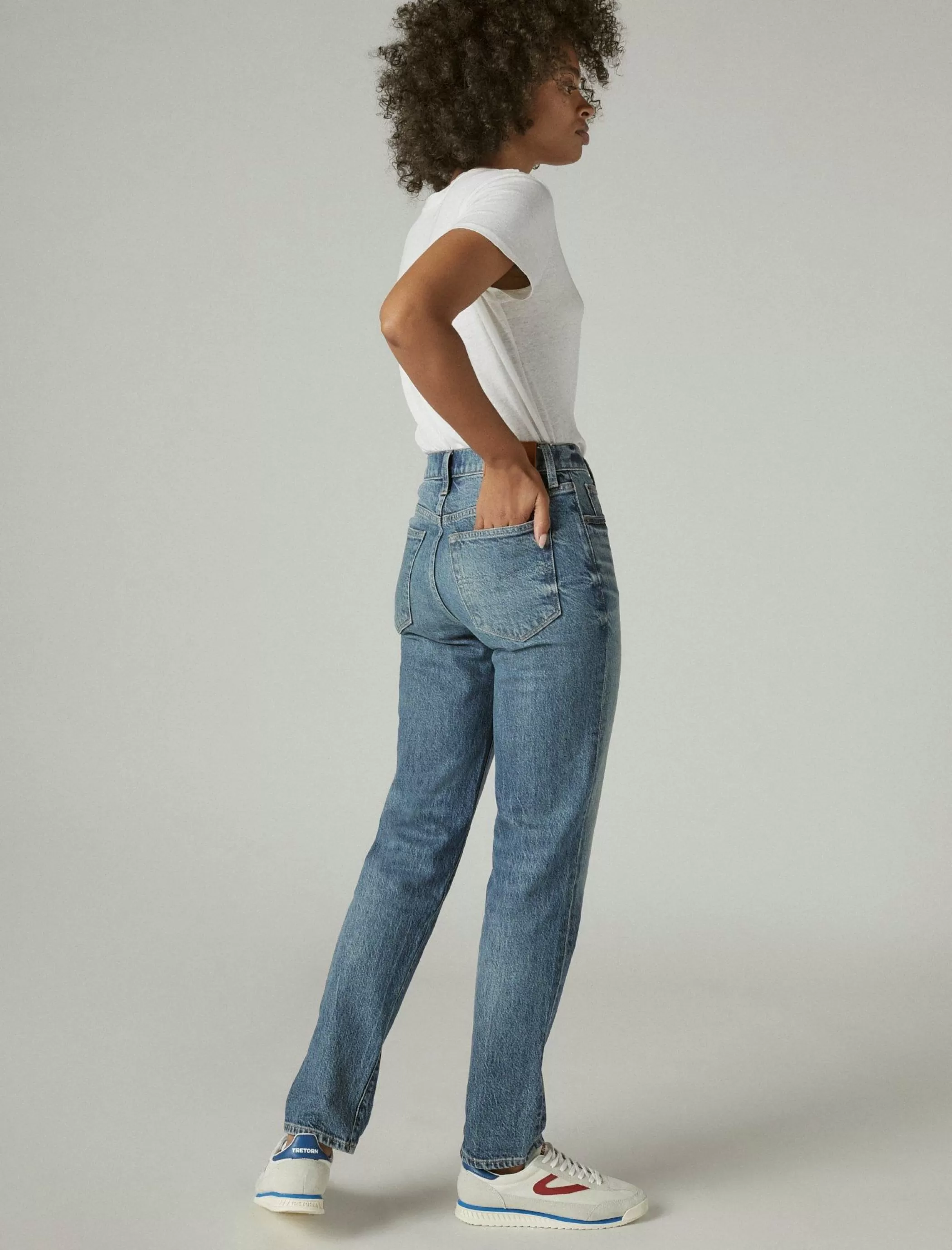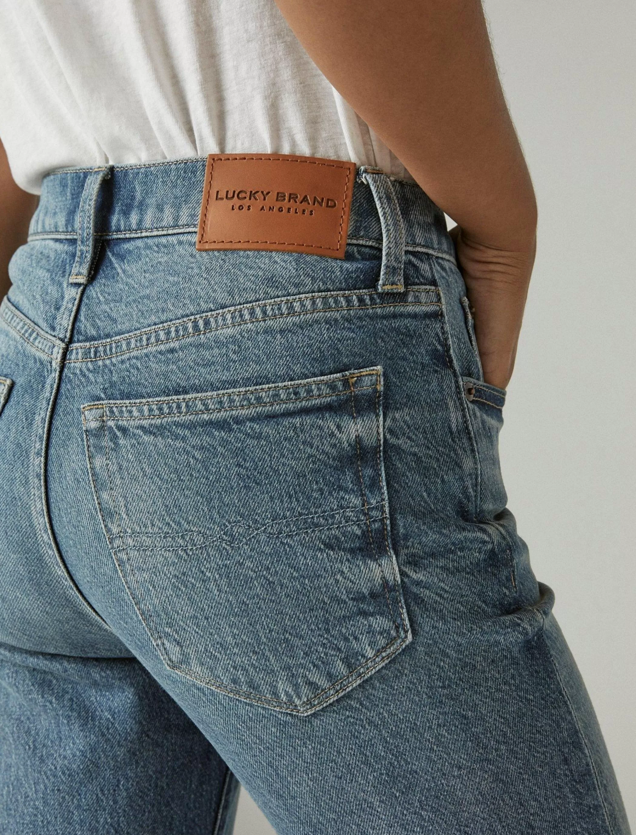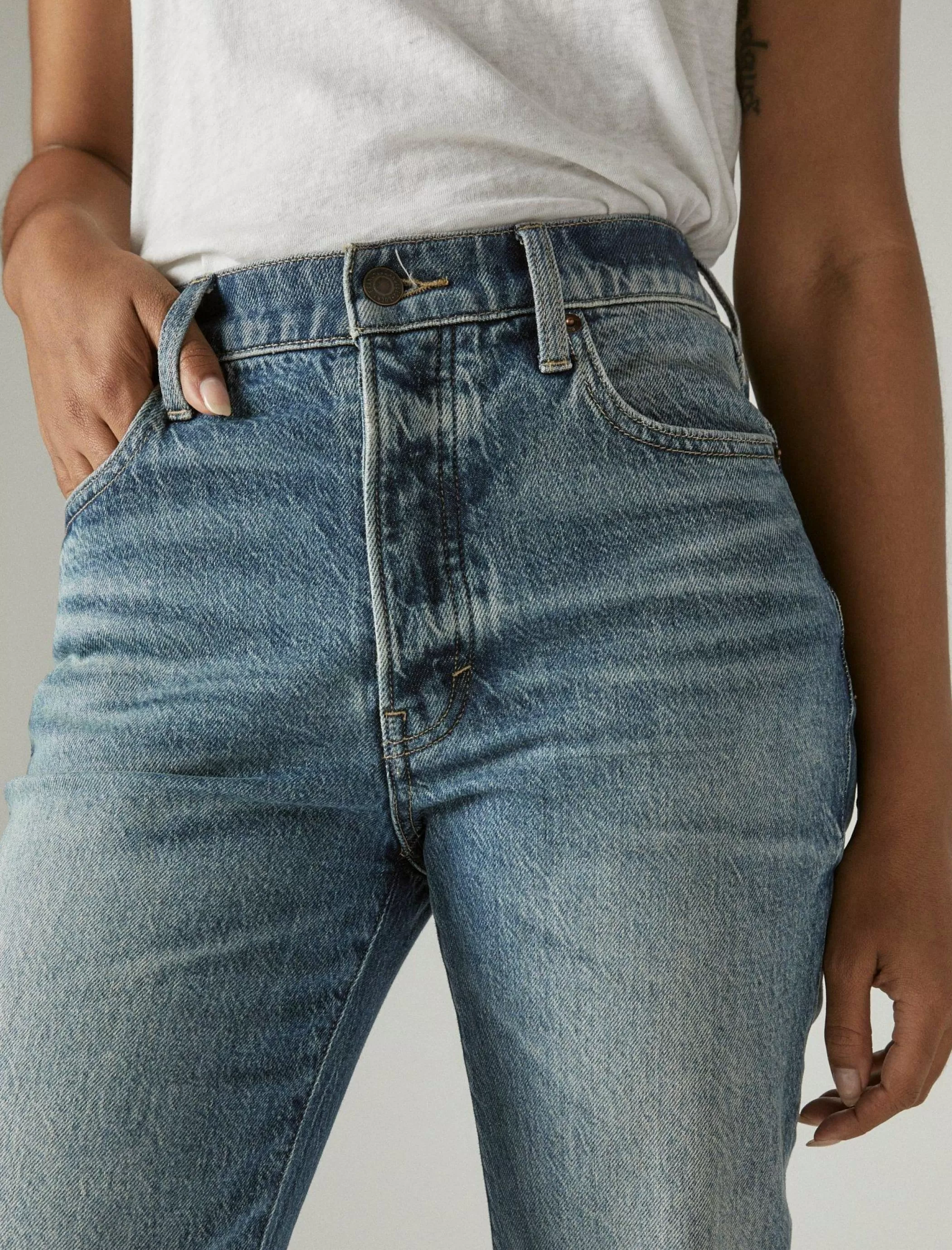 The Drew Mom jean is a retro-inspired high rise with minimal stretch, slim through the hips and tapering to a cropped leg.