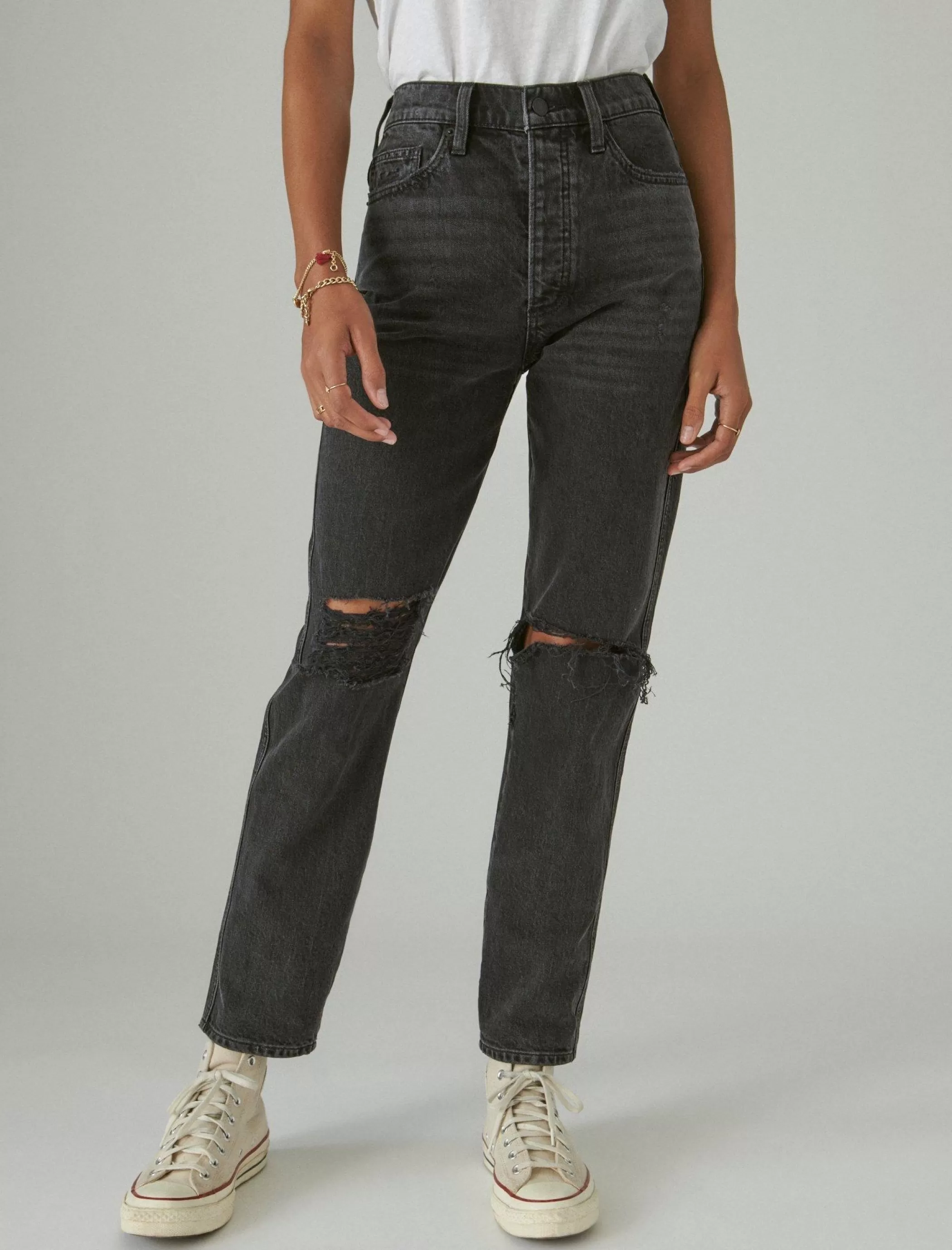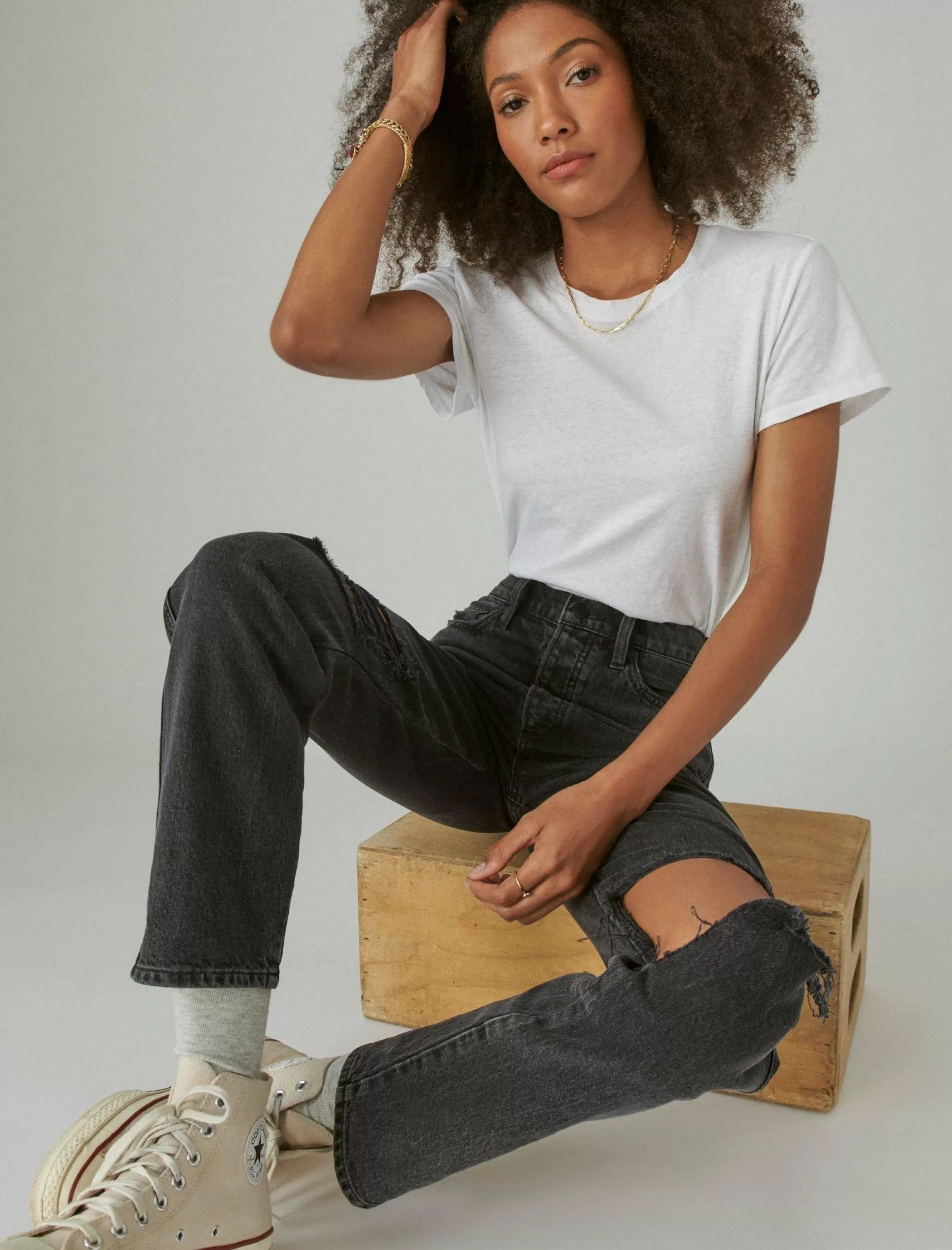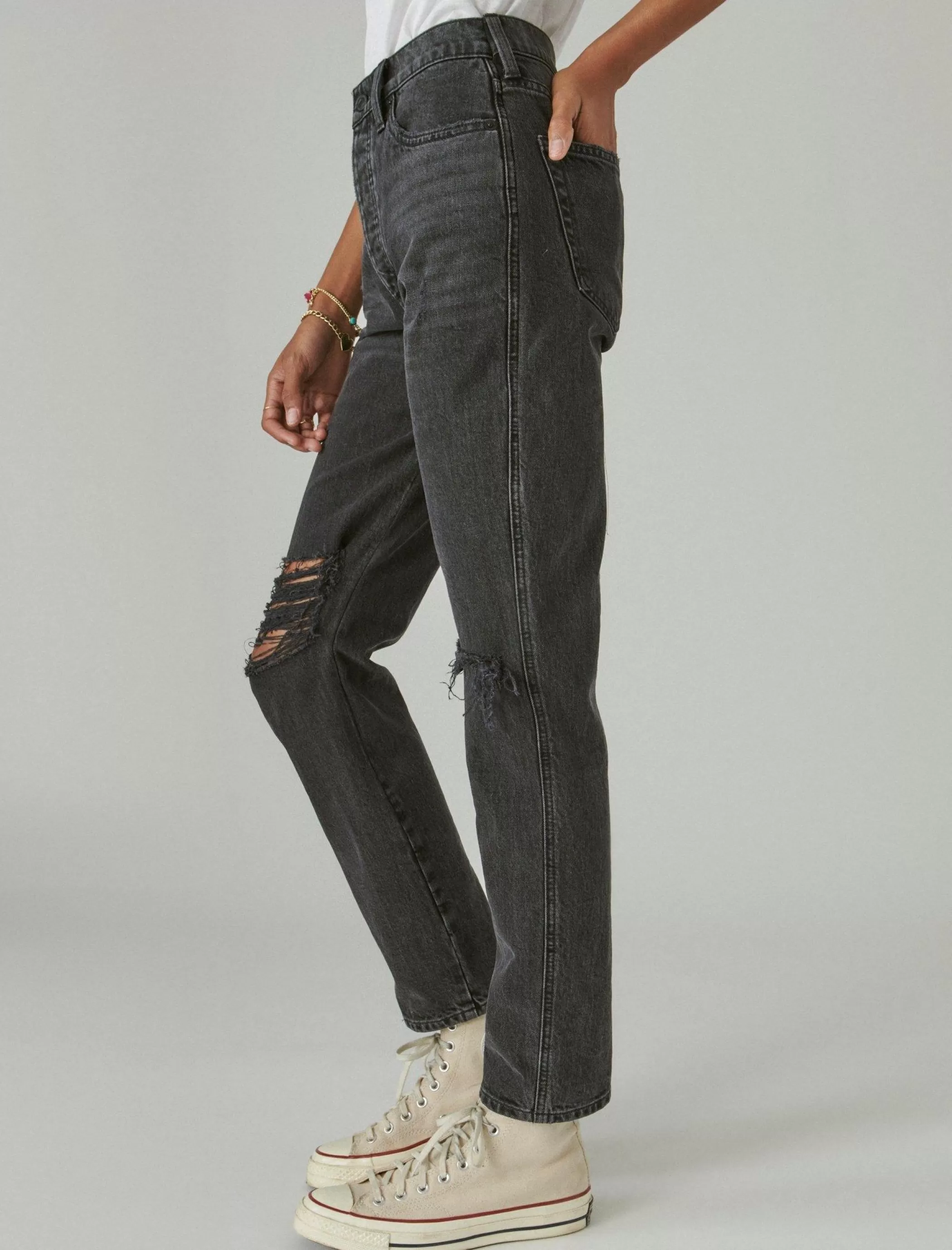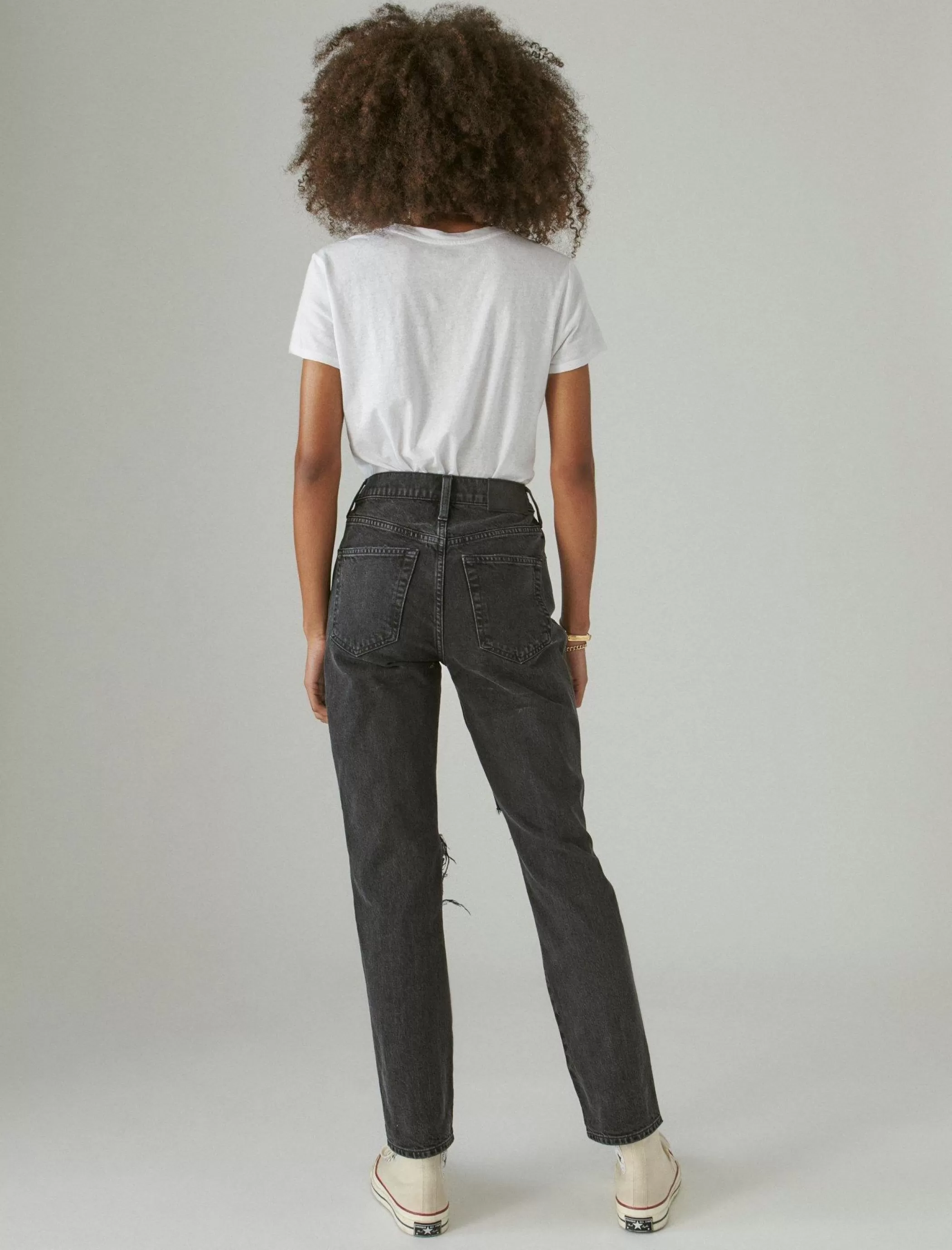 A retro-inspired high rise with minimal stretch, slim through the hips and tapering to a cropped leg, the Drew Jean looks amazing with your favorite graphic T.