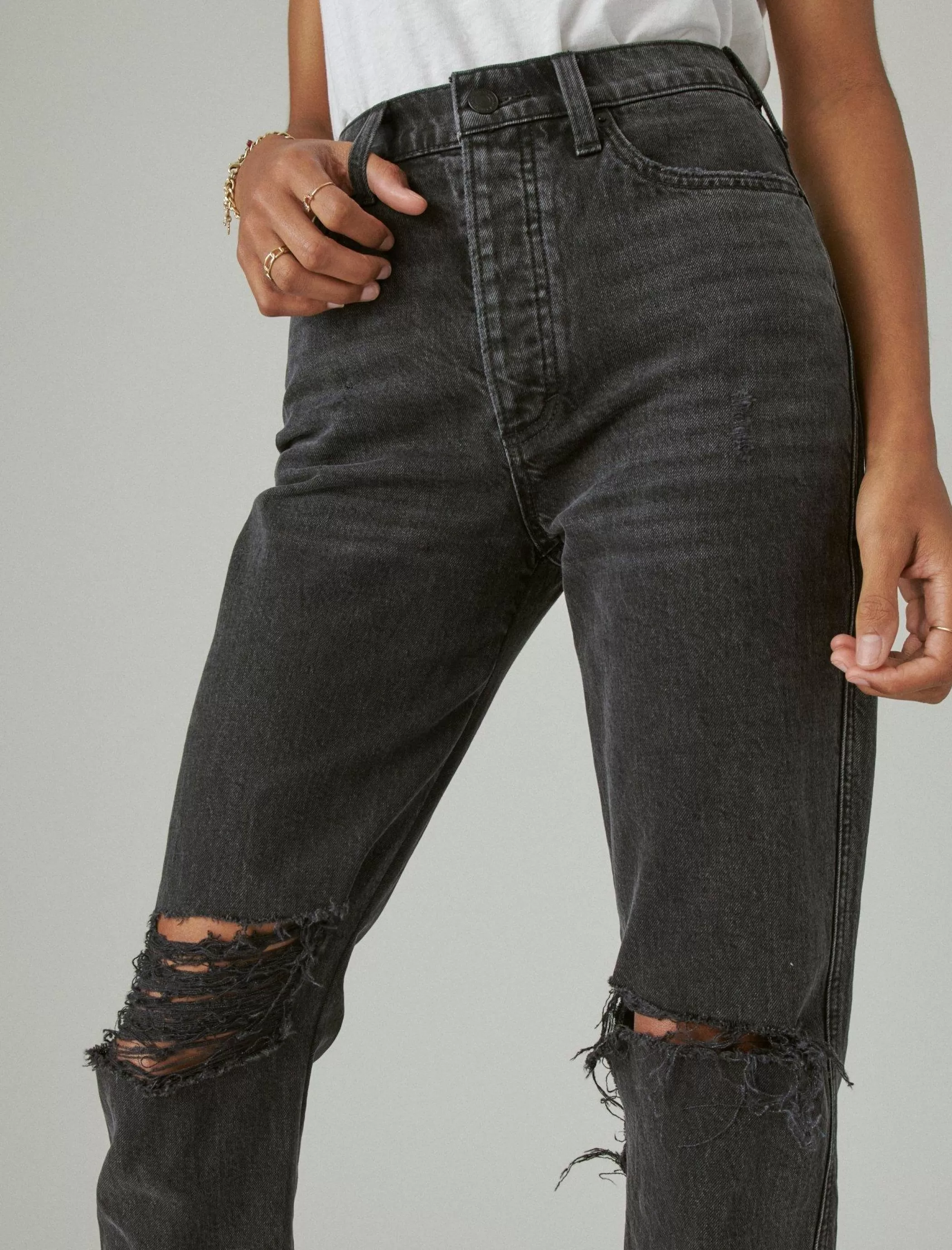 - Distressed grey wash denim