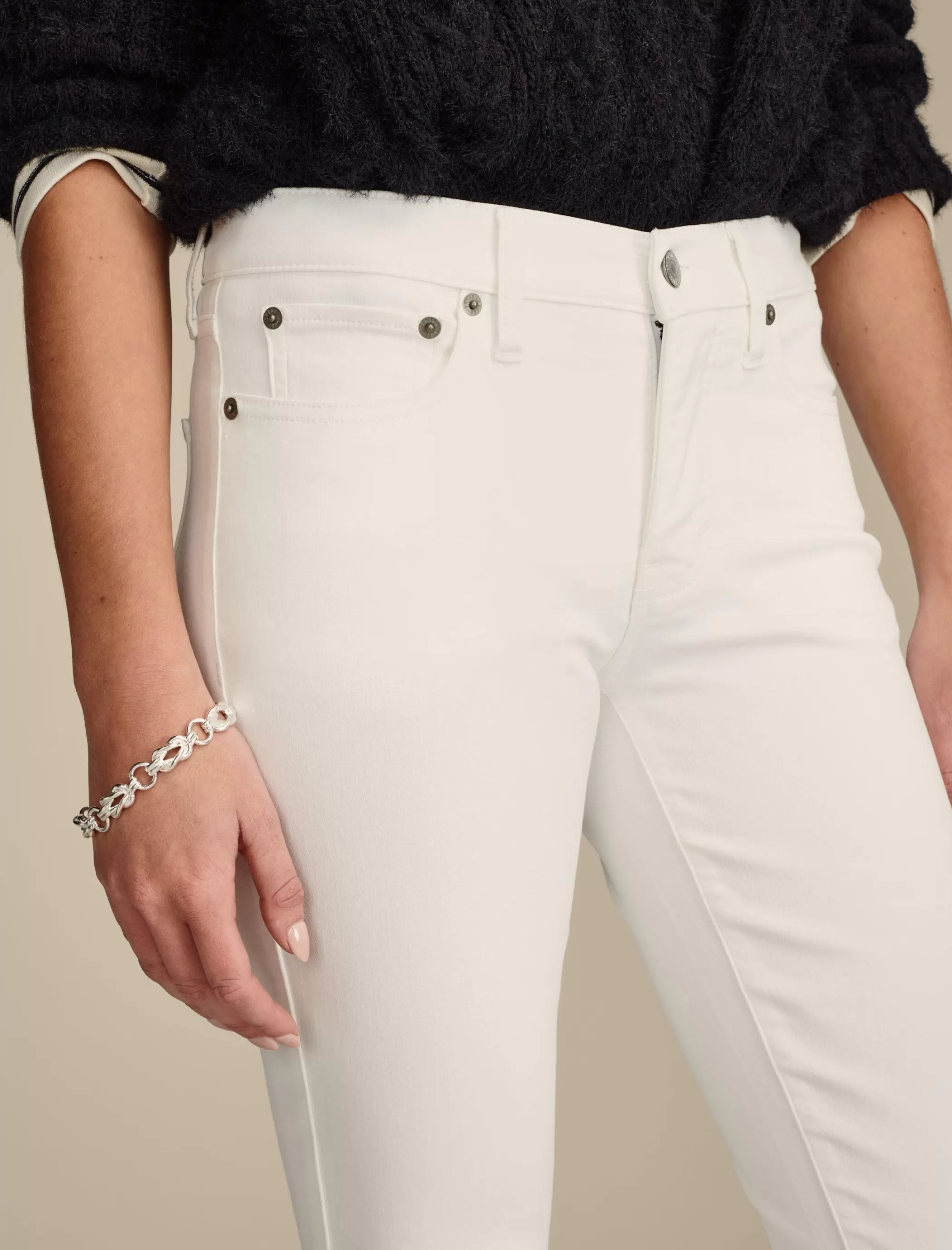 - Mid rise with a skinny fit and skinny leg